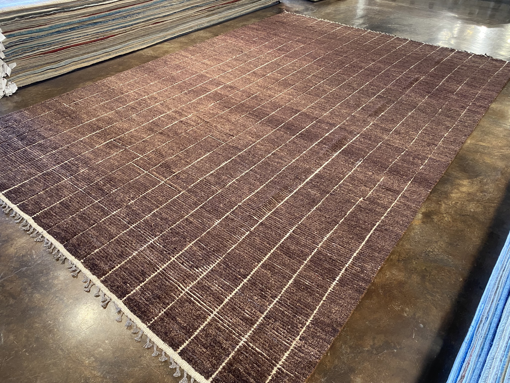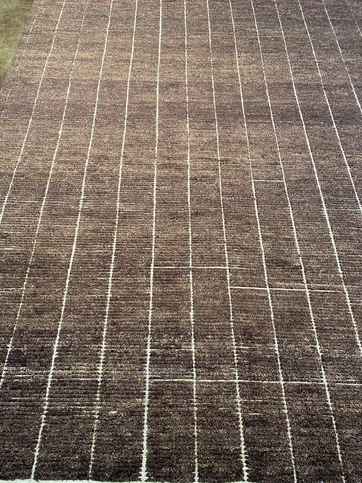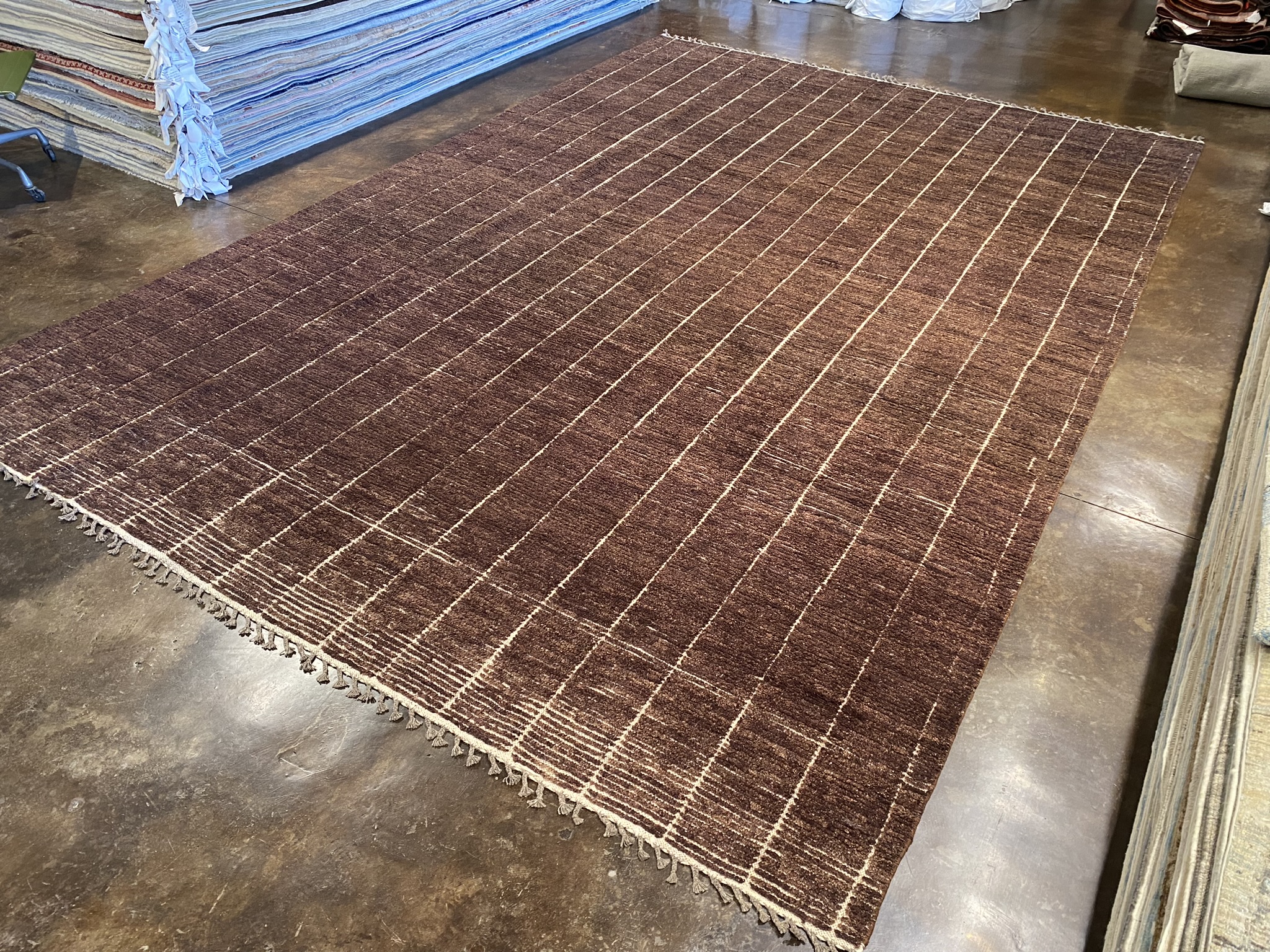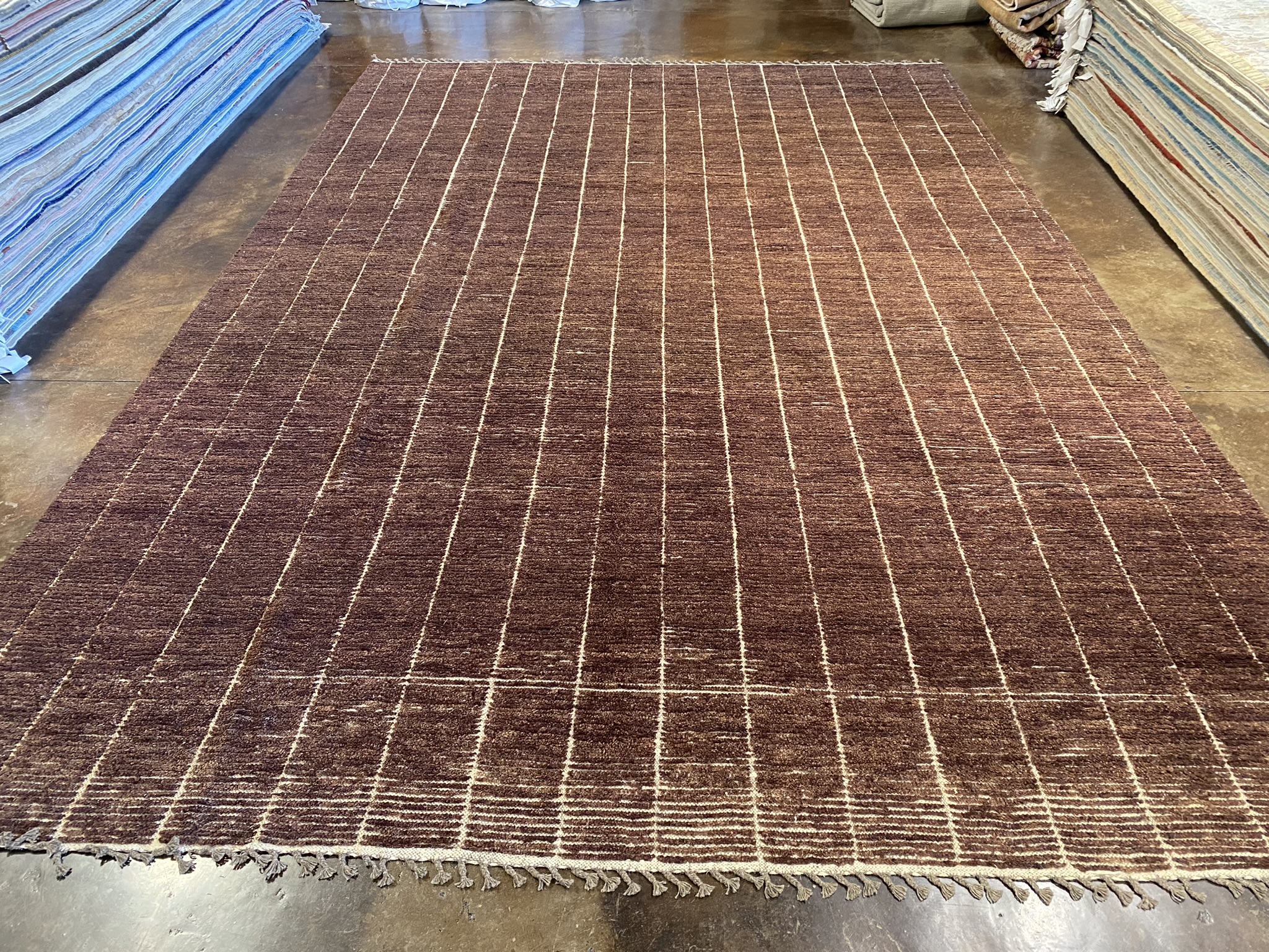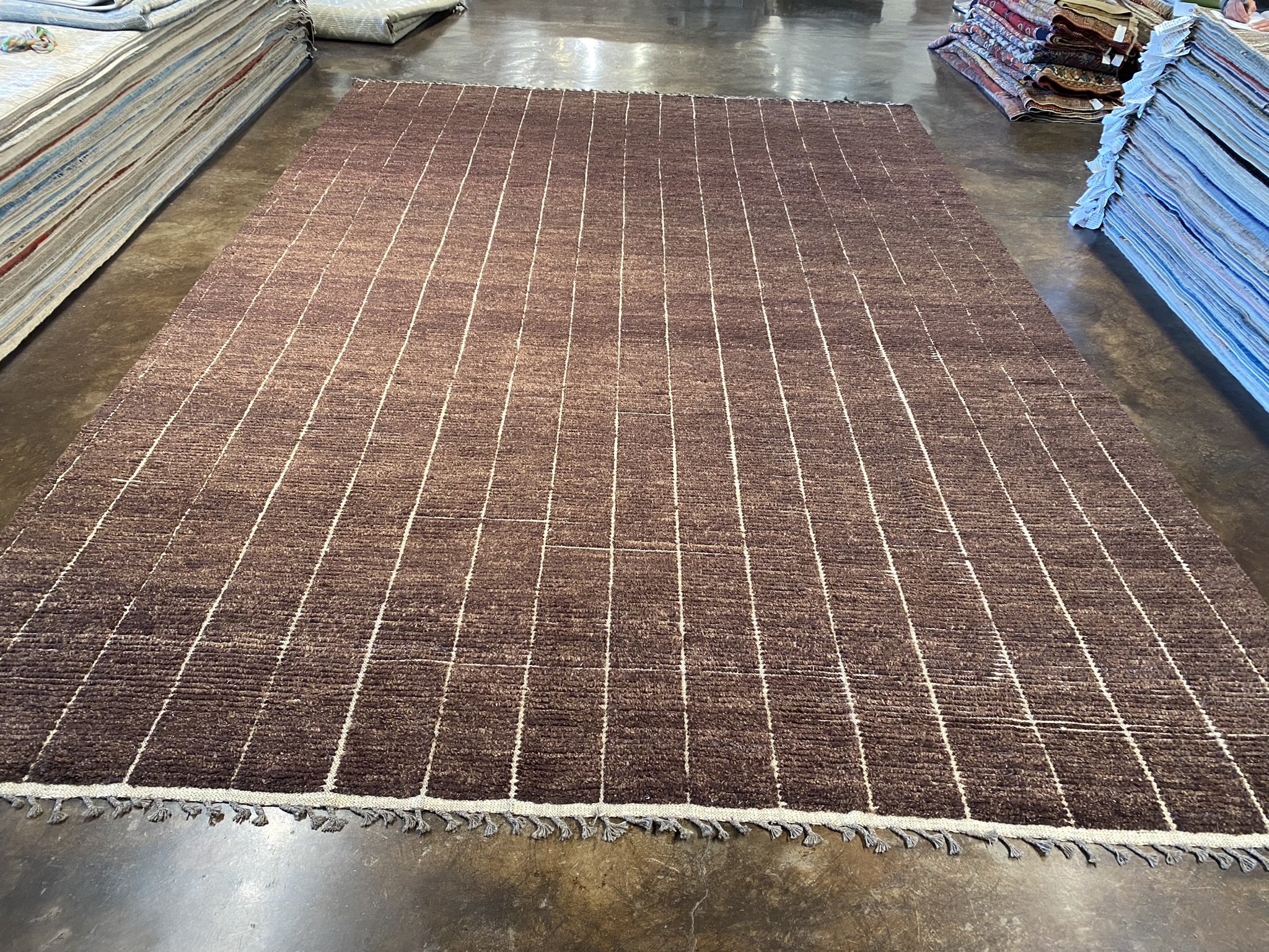 Introducing the stunning HIMALAYA COLLECTION 10’2″ x 15’1″ rug, a masterpiece of Afghan craftsmanship that embodies both modern elegance and timeless beauty. This new, brown rug boasts a mesmerizing minimal design that adds a touch of sophistication to any space. Handcrafted with meticulous attention to detail, the rug features precise, uniform lines that create a captivating linear pattern across its generous 122-inch length and 181-inch width. The rich, chocolate brown hue is warm and inviting, making it a versatile choice for a variety of decor styles. Woven from high-quality materials, this Himalaya rug is built to withstand the test of time while maintaining its luxurious appearance. The plush pile offers a soft and comfortable feel underfoot, making it a pleasure to walk on barefoot. Whether you’re looking to enhance your living room, dining area, or bedroom, this 10 x 14 rug from the HIMALAYA COLLECTION is an excellent choice. Its modern aesthetic and impeccable craftsmanship make it a true statement piece that will elevate the look and feel of any interior. Bring home the perfect blend of contemporary style and Afghan artistry with this exceptional brown rug. This piece is ready to transform your space into a haven of comfort and sophistication.