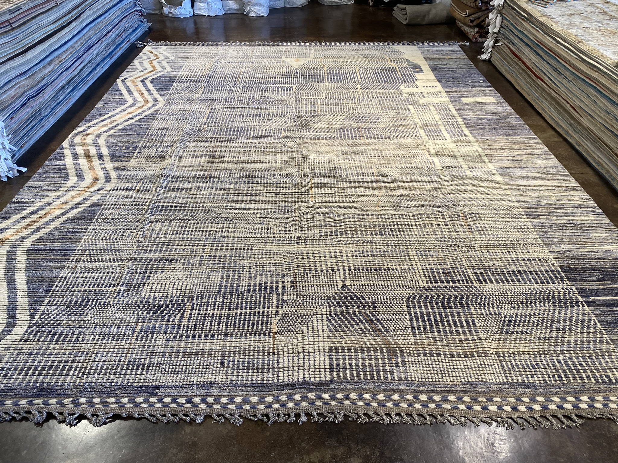 Introduce timeless sophistication to your home with the exquisite HIMALAYA COLLECTION 11’8″ x 15’5″ rug. Handcrafted by skilled Afghan artisans, this oversized masterpiece showcases an intricate, contemporary design that effortlessly blends modern and eclectic styles. The rug’s striking palette features shades of black, brown, gray, and ivory, creating a mesmerizing interplay of tones that adds depth and visual interest. The meticulously woven pattern showcases a captivating array of geometric shapes and lines, resulting in a stunning textural landscape that draws the eye and invites closer inspection. Measuring an impressive 11 feet 8 inches in length and 15 feet 5 inches in width, this rug is the perfect statement piece for spacious living areas, dining rooms, or master bedrooms. The generous size allows the design to fully unfold, transforming any room into a haven of style and comfort. Crafted from high-quality materials, this HIMALAYA COLLECTION rug is built to withstand the test of time. The plush pile offers a sumptuous feel underfoot, while the durable construction ensures that it will remain a cherished part of your home decor for years to come. Elevate your space with the unparalleled elegance and artistry of this Afghan-made rug. Whether you’re curating a contemporary, modern, or eclectic aesthetic, this remarkable piece is sure to become the focal point of any room, inspiring conversations and admiration from all who behold it.