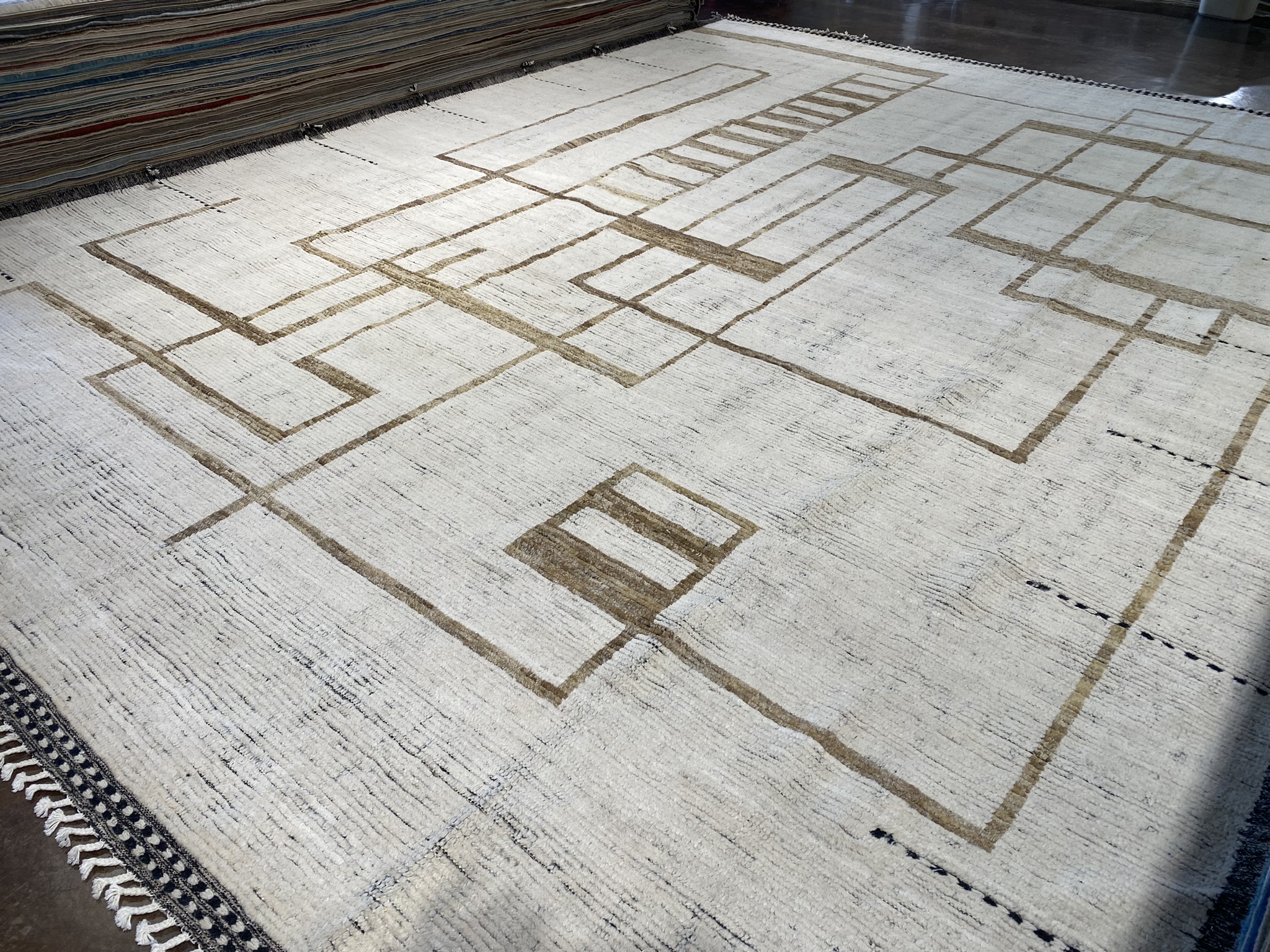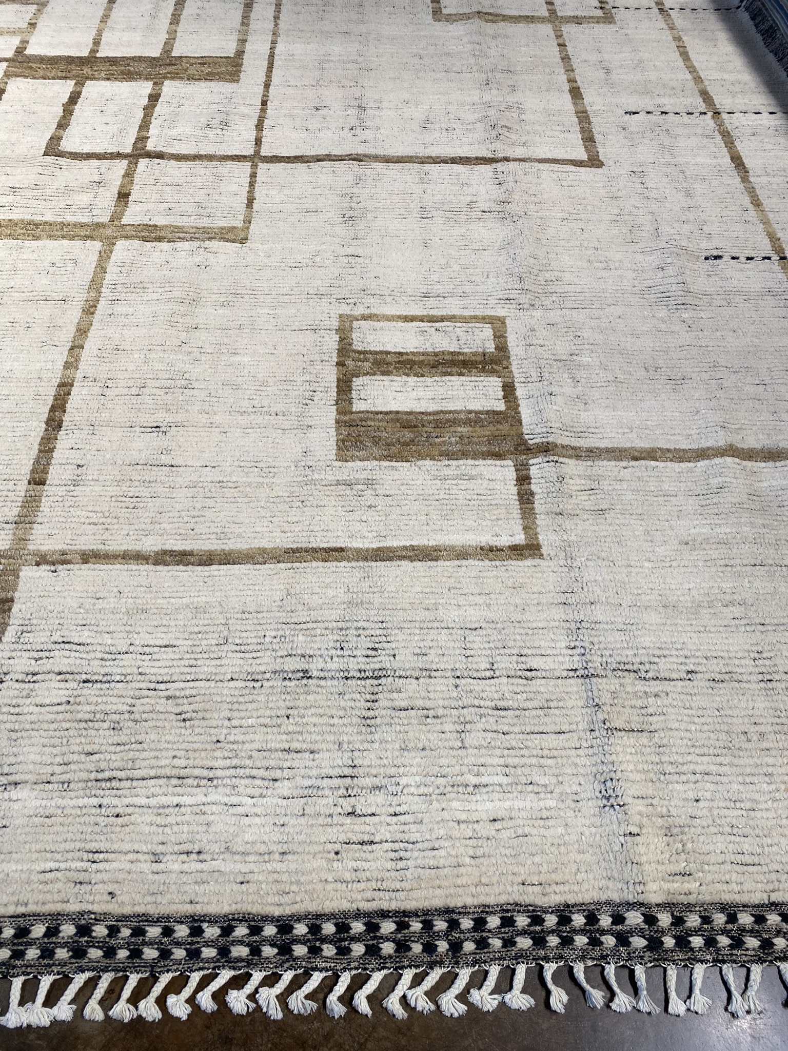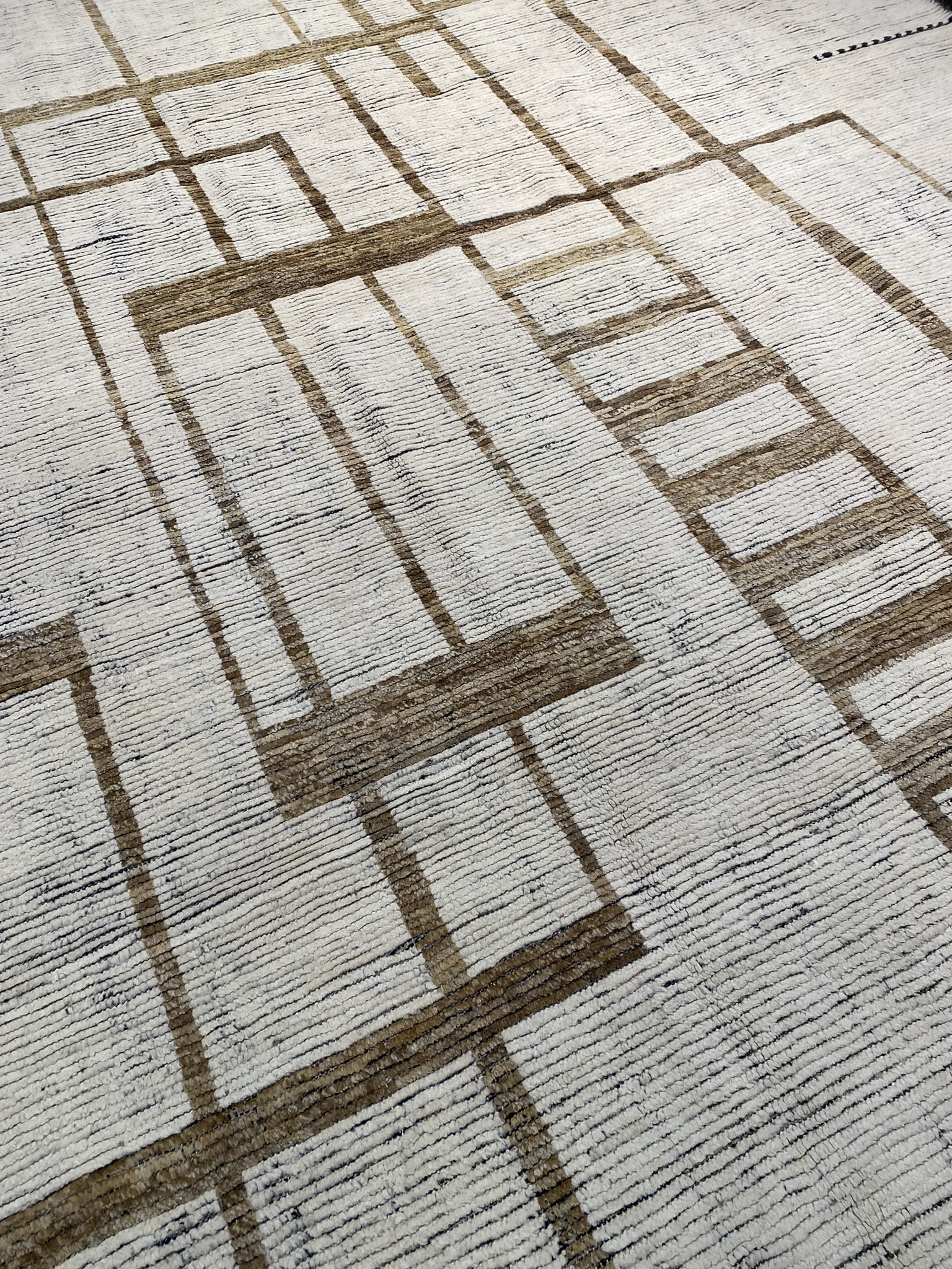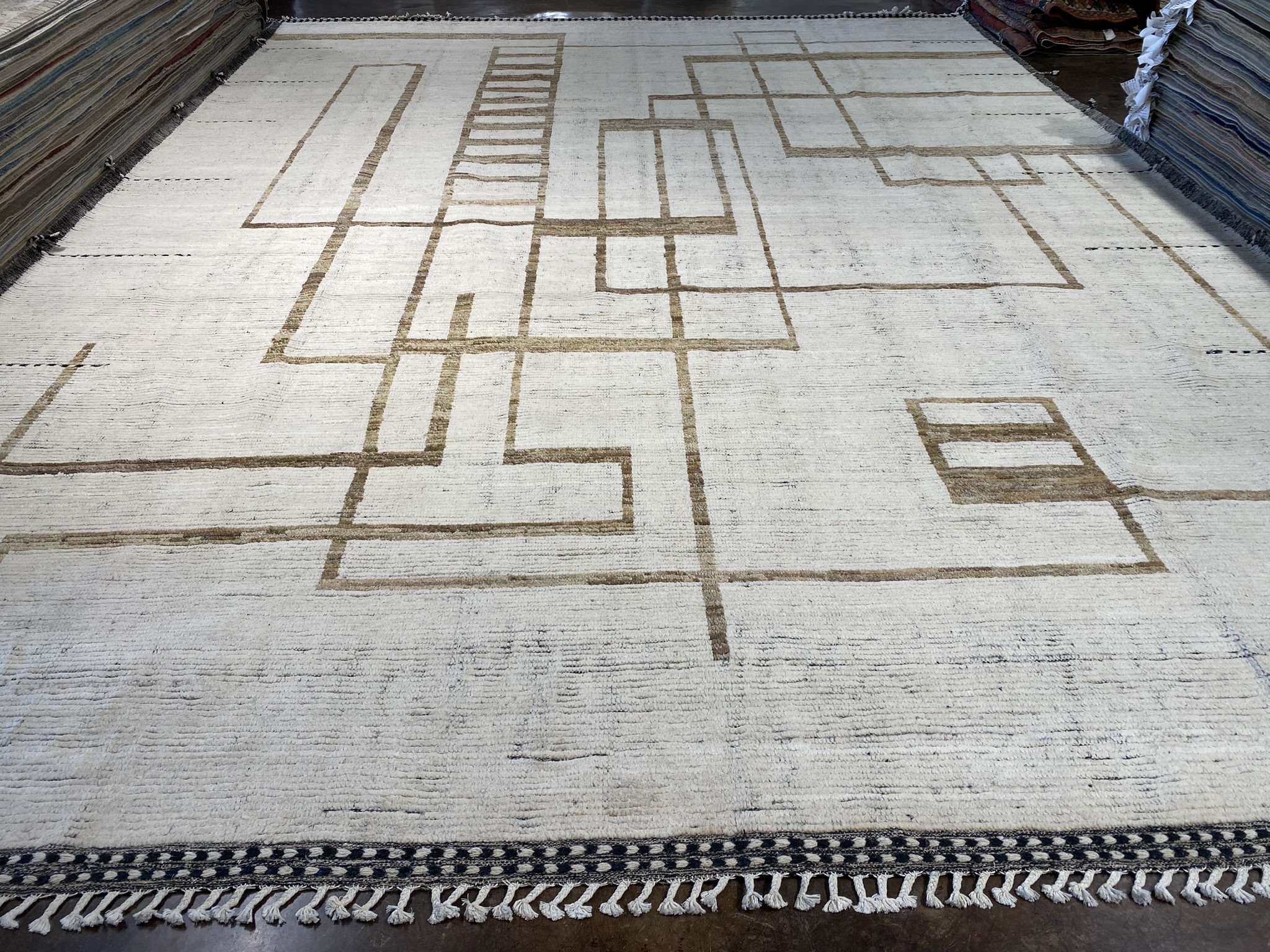 Introducing the stunning HIMALAYA COLLECTION 13’1″ x 17’6″ rug, a masterpiece that seamlessly blends contemporary design with traditional Afghan craftsmanship. This oversized rug, measuring an impressive 157 inches in length and 210 inches in width, is a testament to the artistry and skill of its makers. Crafted with a palette of black, brown, and ivory hues, this rug exudes a sense of modern elegance. The striking geometric pattern, reminiscent of interlocking rectangles and squares, creates a mesmerizing visual effect that draws the eye and adds depth to any space. The clean lines and bold shapes are hallmarks of contemporary and eclectic design, making this rug a versatile choice for a variety of decor styles. The rug’s plush pile, woven from high-quality materials, offers a luxurious feel underfoot, while its sturdy construction ensures durability and longevity. The intricate detailing and precise craftsmanship are evident in every inch of this magnificent piece, showcasing the rich heritage of Afghan rug-making traditions. Whether gracing the floor of a spacious living room, anchoring a dining area, or adding warmth to a bedroom, the HIMALAYA COLLECTION 13’1″ x 17’6″ rug is a statement piece that effortlessly elevates any interior. Its timeless beauty and uncompromising quality make it a treasured addition to any home, sure to be admired and cherished for generations to come.
