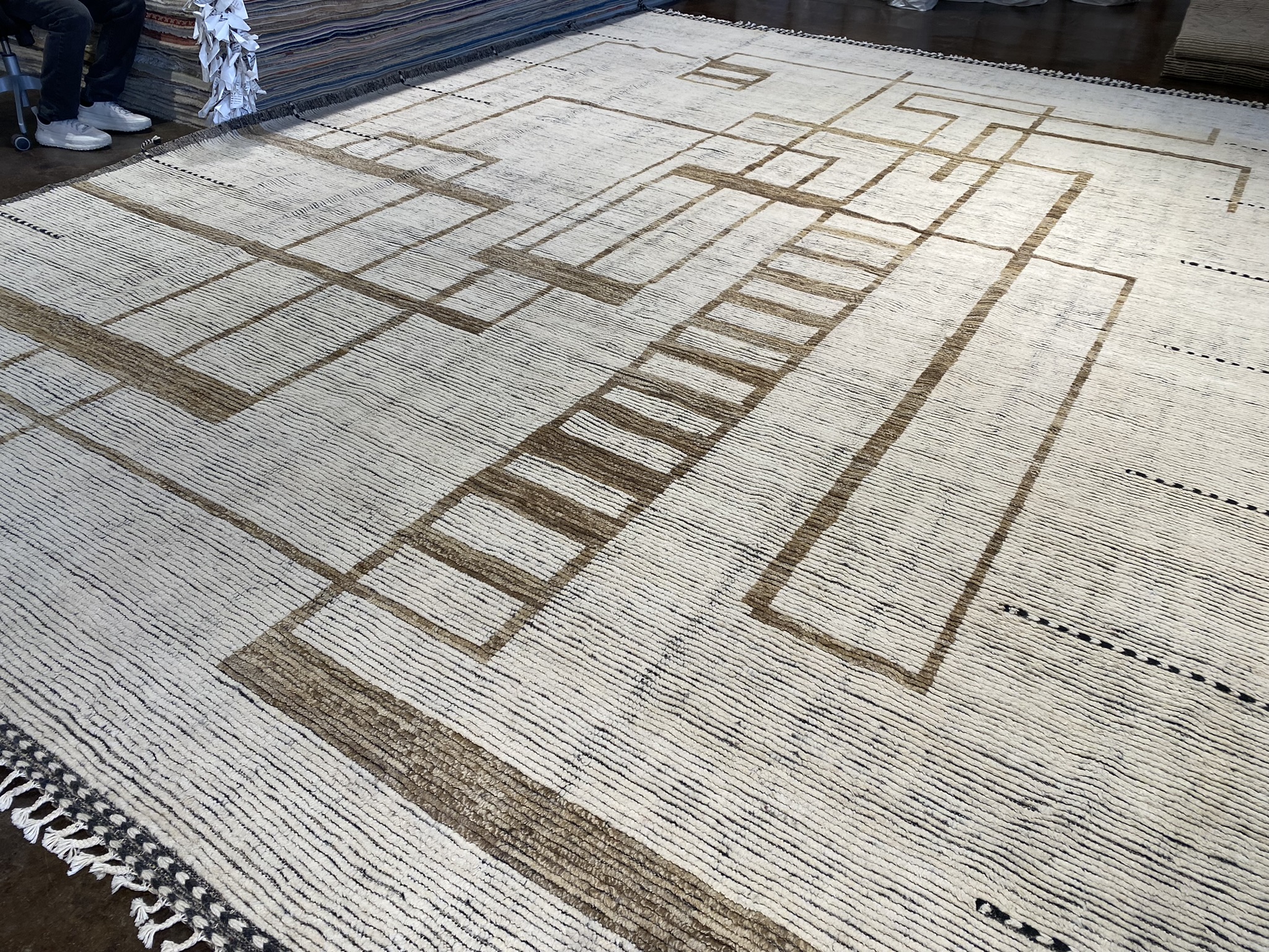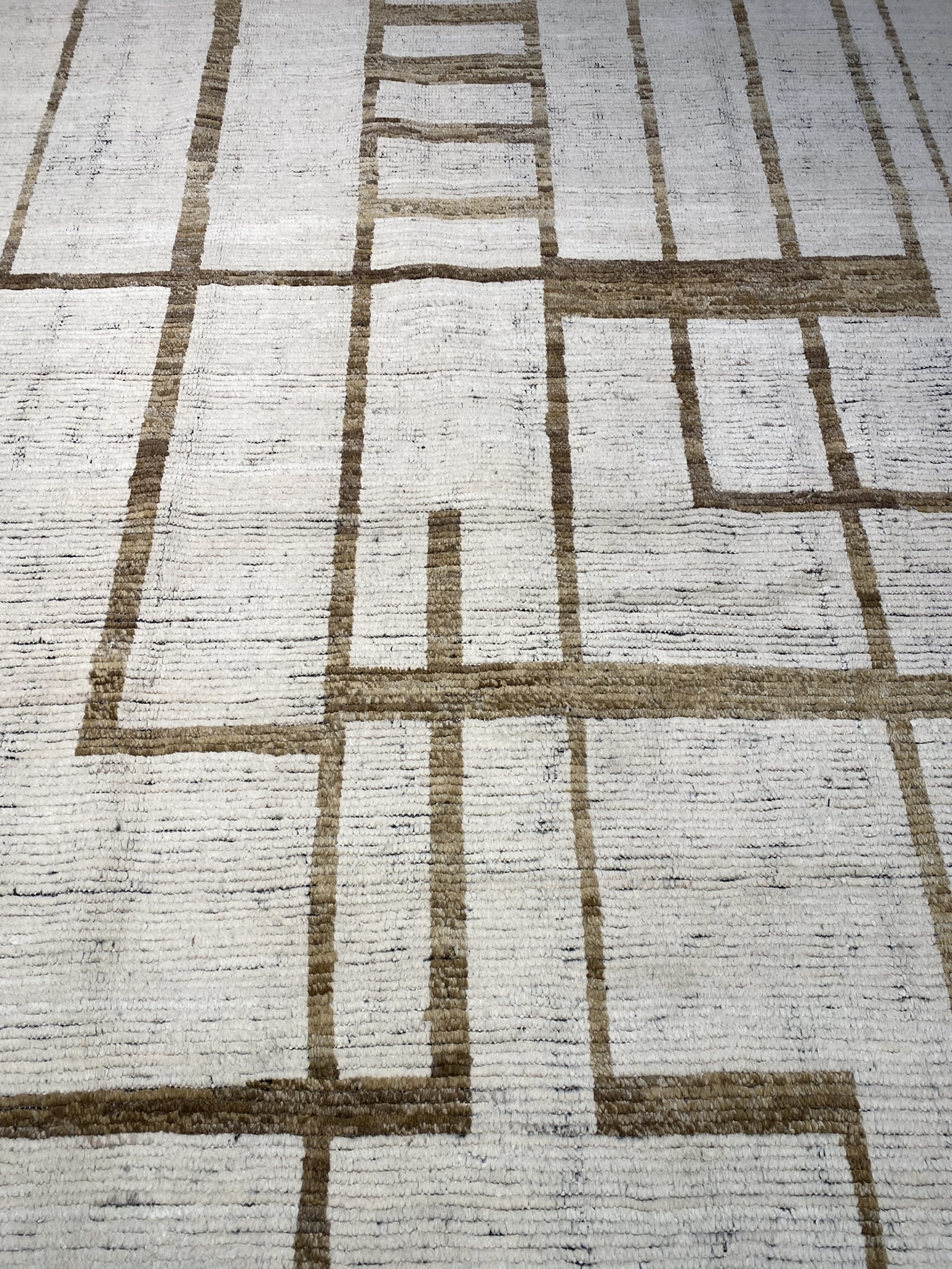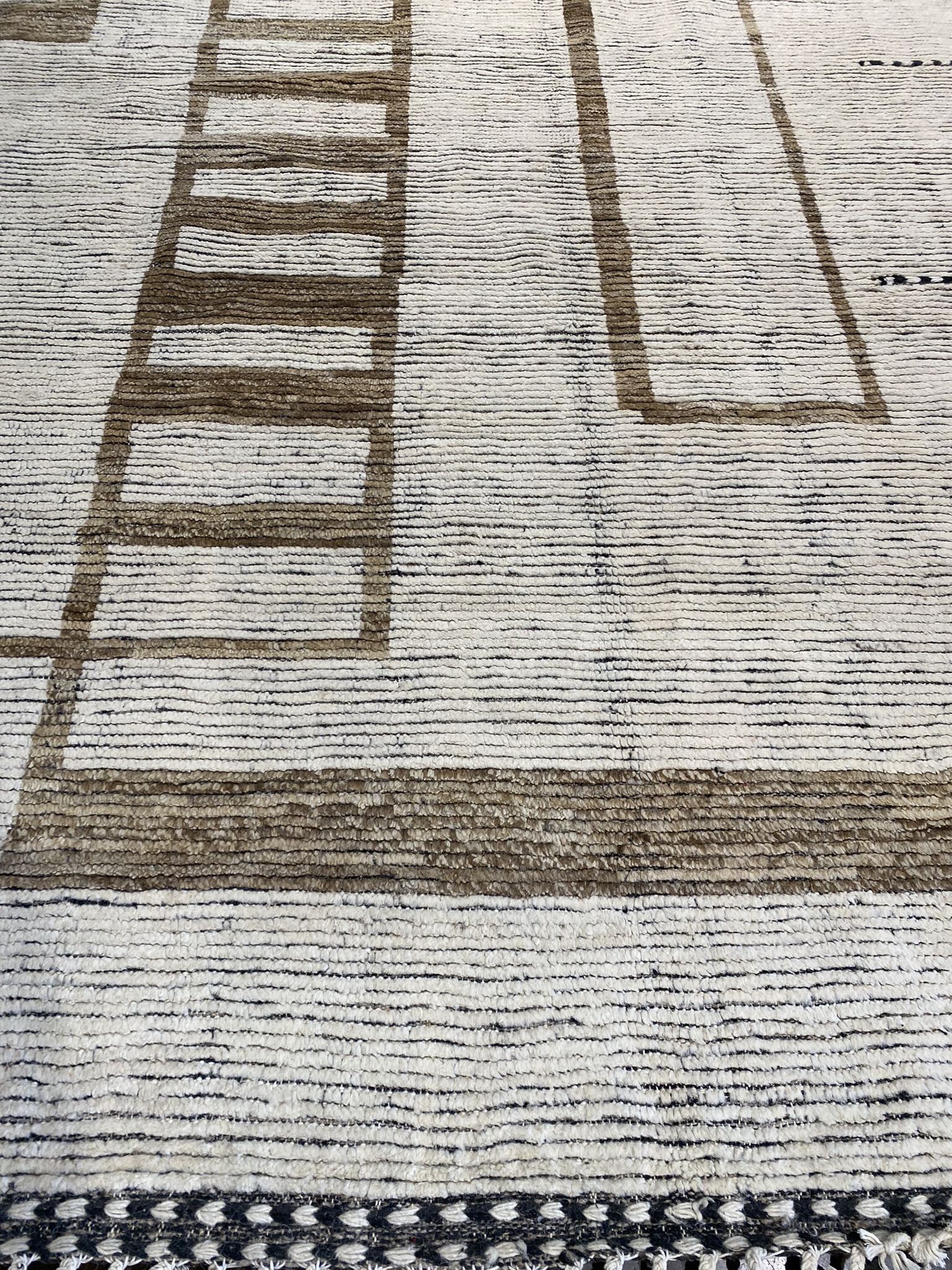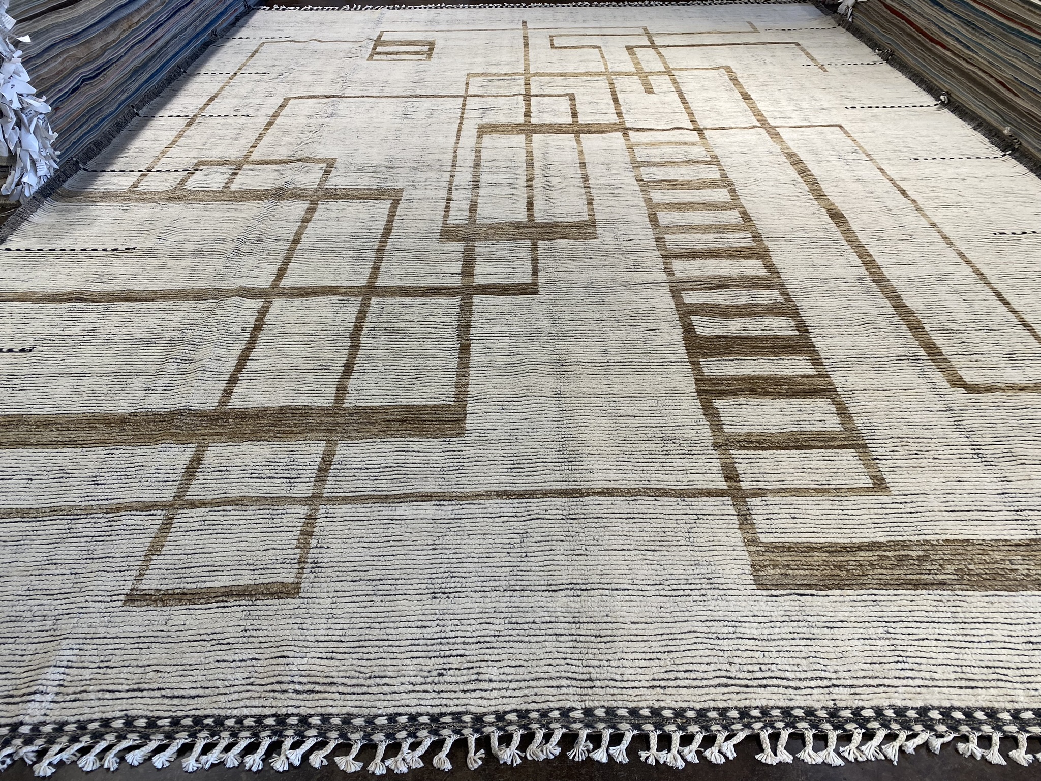 Introducing the stunning HIMALAYA COLLECTION 13’1″ x 17’6″ rug, a masterpiece that seamlessly blends contemporary design with traditional Afghan craftsmanship. This oversized rug, measuring an impressive 157 inches in length and 210 inches in width, is a testament to the artistry and skill of its makers. Crafted with a palette of black, brown, and ivory hues, this rug exudes a sense of modern elegance. The striking geometric pattern, reminiscent of interlocking rectangles and squares, creates a mesmerizing visual effect that draws the eye and adds depth to any space. The clean lines and bold shapes are hallmarks of contemporary and eclectic design, making this rug a versatile choice for a variety of decor styles. The rug’s plush pile, woven from high-quality materials, offers a luxurious feel underfoot, while its sturdy construction ensures durability and longevity. The intricate detailing and precise craftsmanship are evident in every inch of this magnificent piece, showcasing the rich heritage of Afghan rug-making traditions. Whether gracing the floor of a spacious living room, anchoring a dining area, or adding warmth to a bedroom, the HIMALAYA COLLECTION 13’1″ x 17’6″ rug is a statement piece that effortlessly elevates any interior. Its timeless beauty and uncompromising quality make it a treasured addition to any home, sure to be admired and cherished for generations to come.