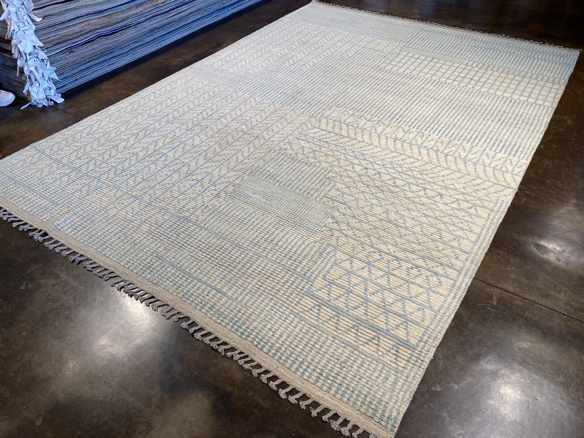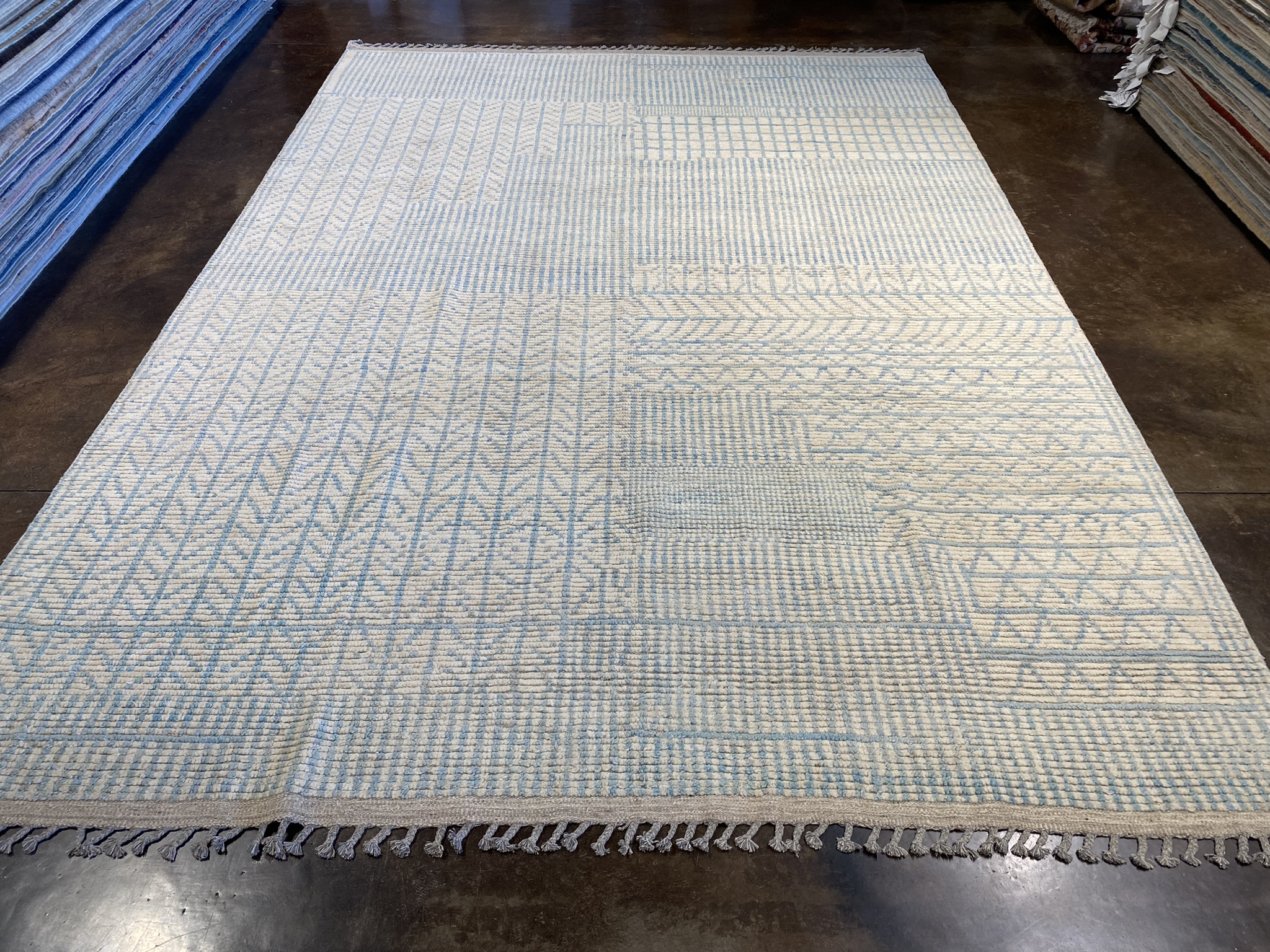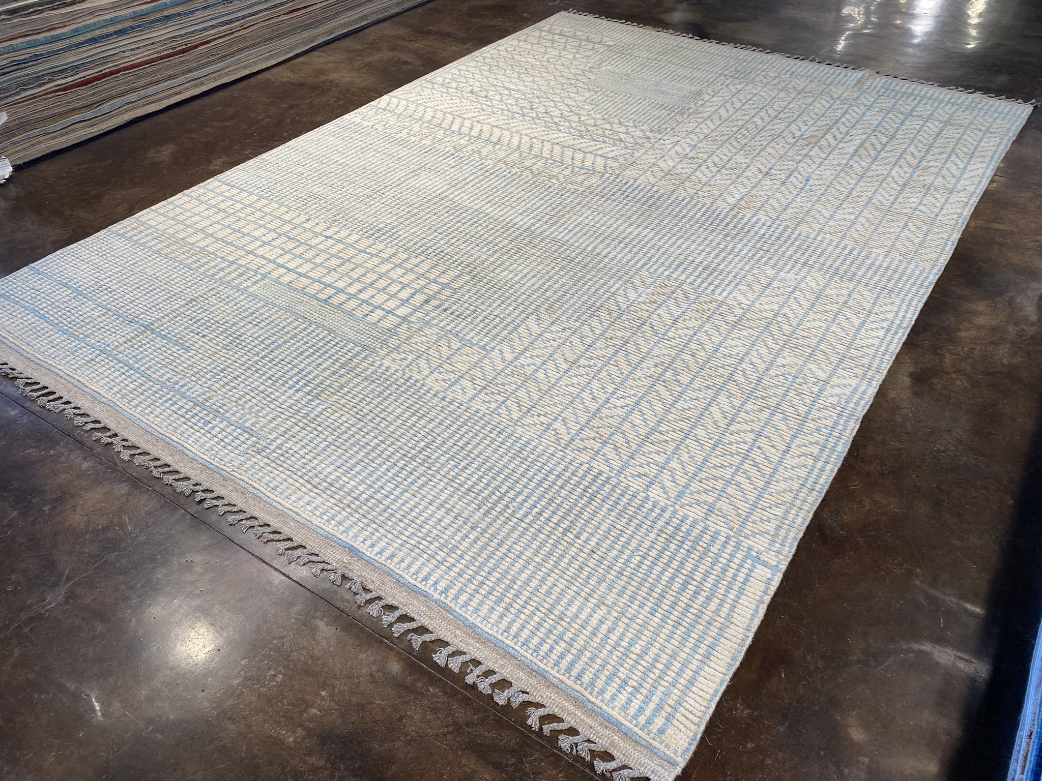 Introduce elegance and refinement to your space with this stunning 8’10” x 12’7″ rug from the Himalaya Collection. Crafted with meticulous care in Afghanistan, this contemporary masterpiece showcases a mesmerizing geometric pattern in soothing shades of cream and light blue. The intricate design exudes a sense of modern minimalism, making it a versatile choice for eclectic and contemporary decor styles alike. Woven from high-quality materials, this brand new rug offers both durability and softness underfoot. The generous 9×12 size provides ample coverage for larger living rooms, dining areas, or bedrooms. The subtle color palette and captivating pattern create a serene and inviting atmosphere, perfect for relaxing or entertaining guests. Whether you’re looking to anchor your seating area, define a space, or simply add a touch of visual interest, this Himalaya Collection rug is sure to impress. Its timeless beauty and impeccable craftsmanship will elevate any room, making it a cherished addition to your home for years to come. Don’t miss the opportunity to own this exceptional piece and experience the artistry and charm of Afghan rug-making tradition.