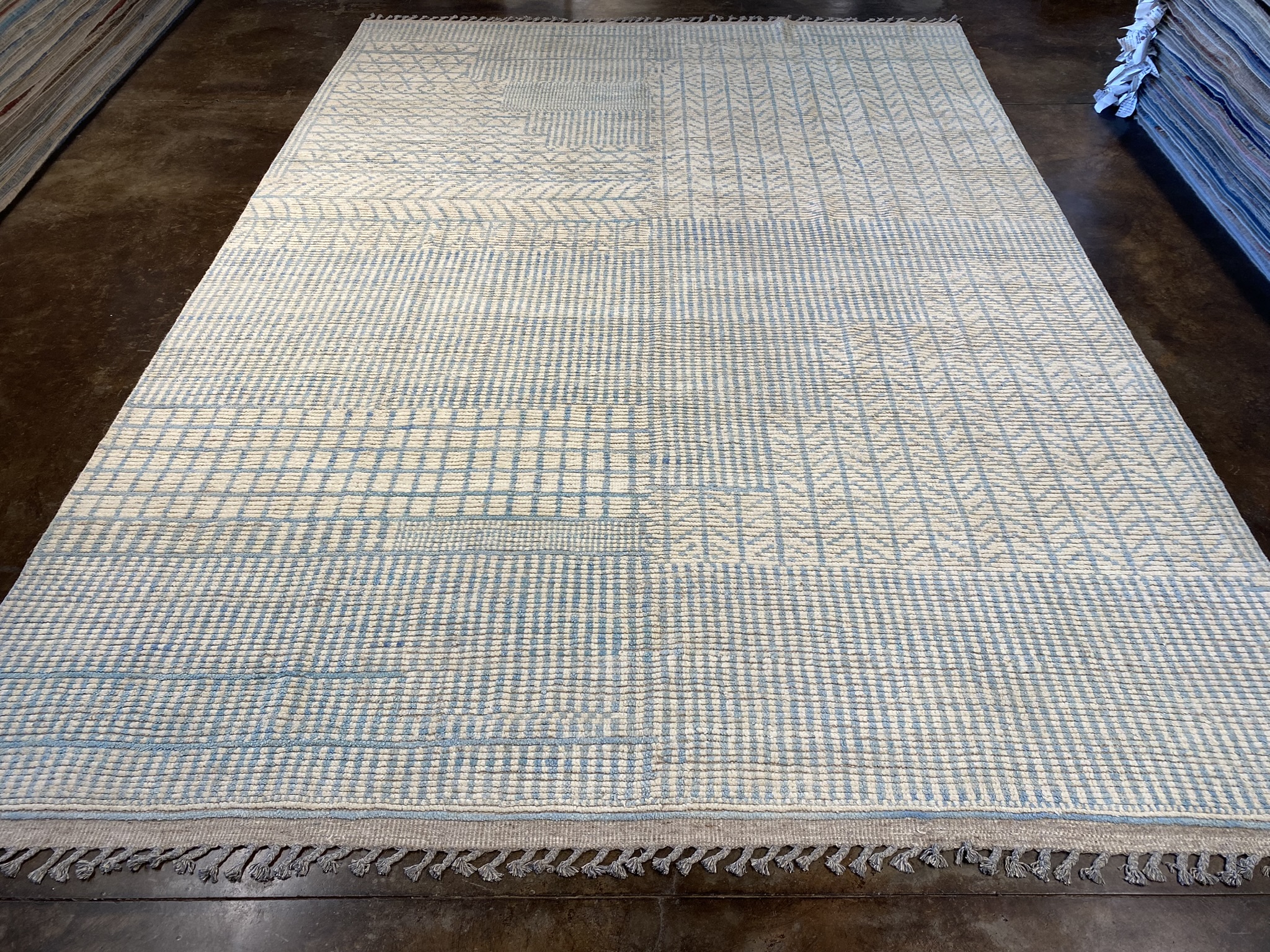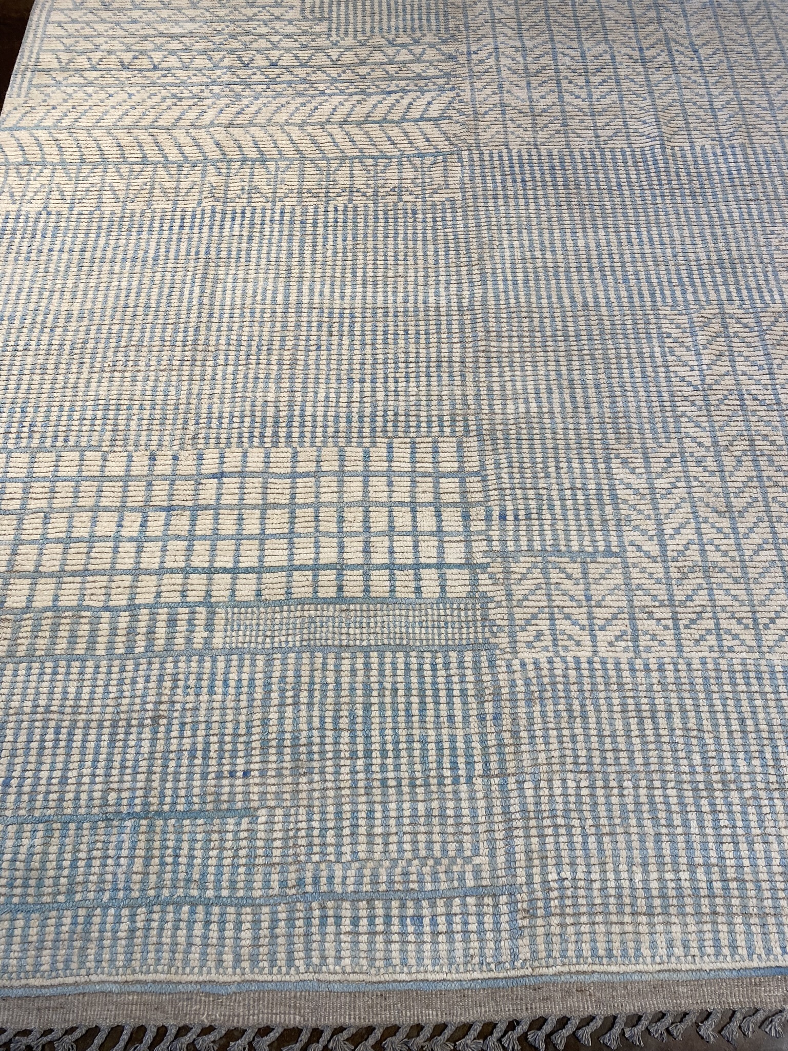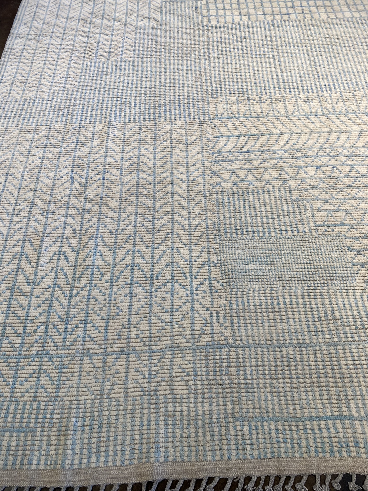 Introduce elegance and refinement to your space with this stunning 8’10” x 12’7″ rug from the Himalaya Collection. Crafted with meticulous care in Afghanistan, this contemporary masterpiece showcases a mesmerizing geometric pattern in soothing shades of cream and light blue. The intricate design exudes a sense of modern minimalism, making it a versatile choice for eclectic and contemporary decor styles alike. Woven from high-quality materials, this brand new rug offers both durability and softness underfoot. The generous 9×12 size provides ample coverage for larger living rooms, dining areas, or bedrooms. The subtle color palette and captivating pattern create a serene and inviting atmosphere, perfect for relaxing or entertaining guests. Whether you’re looking to anchor your seating area, define a space, or simply add a touch of visual interest, this Himalaya Collection rug is sure to impress. Its timeless beauty and impeccable craftsmanship will elevate any room, making it a cherished addition to your home for years to come. Don’t miss the opportunity to own this exceptional piece and experience the artistry and charm of Afghan rug-making tradition.