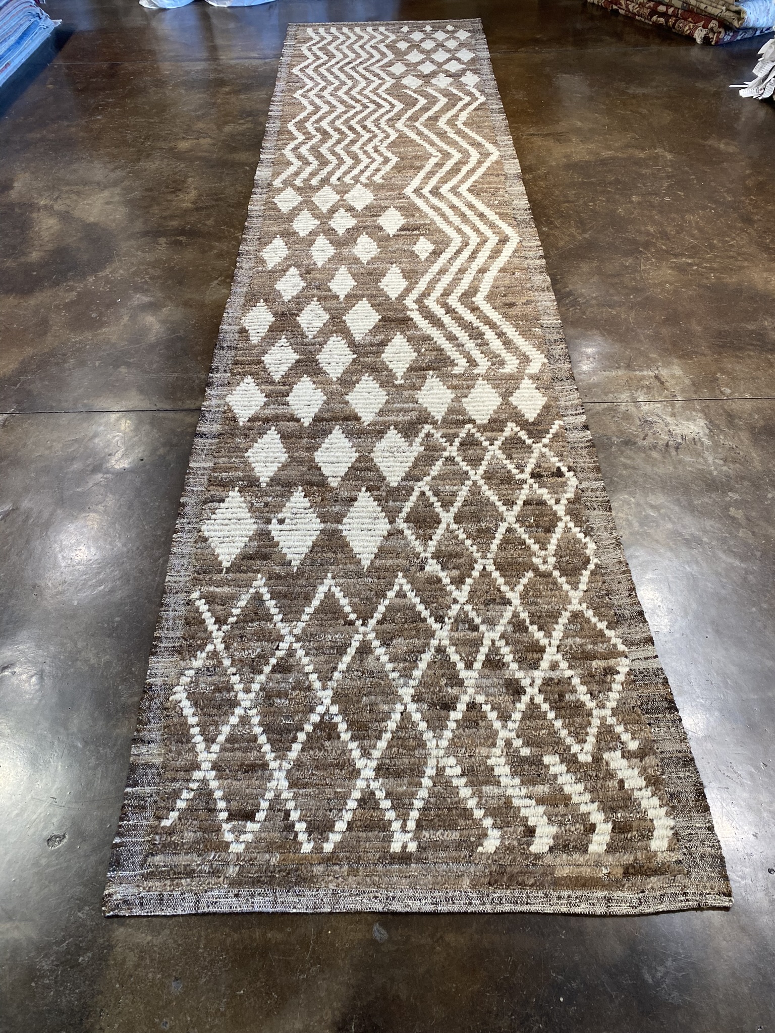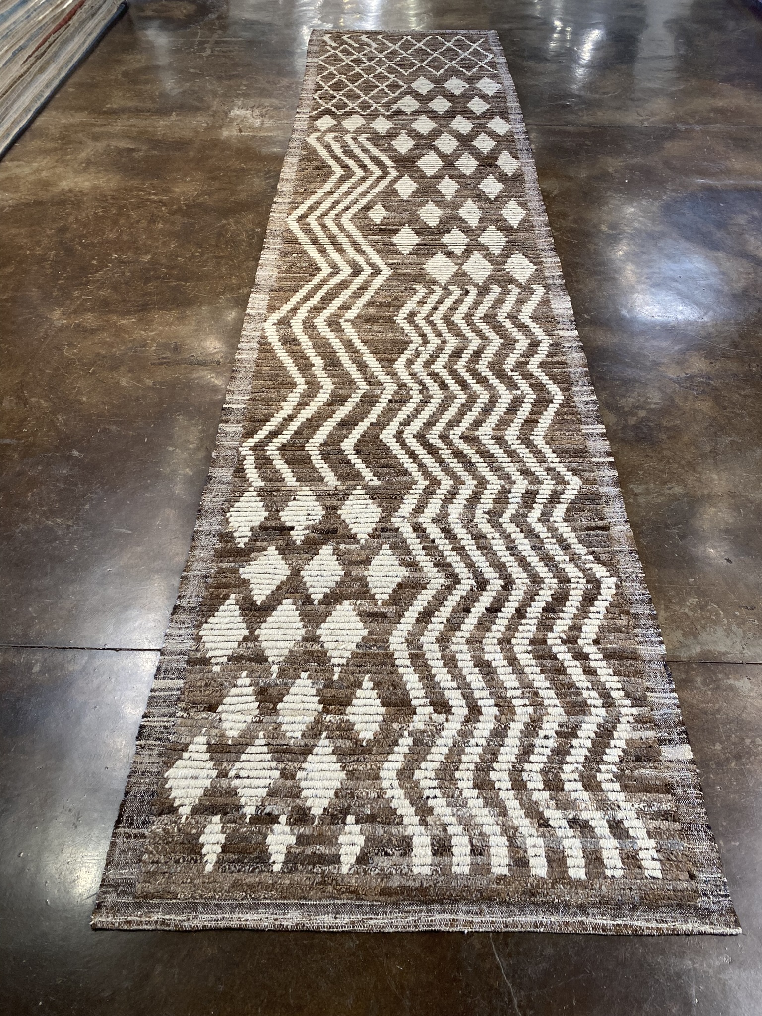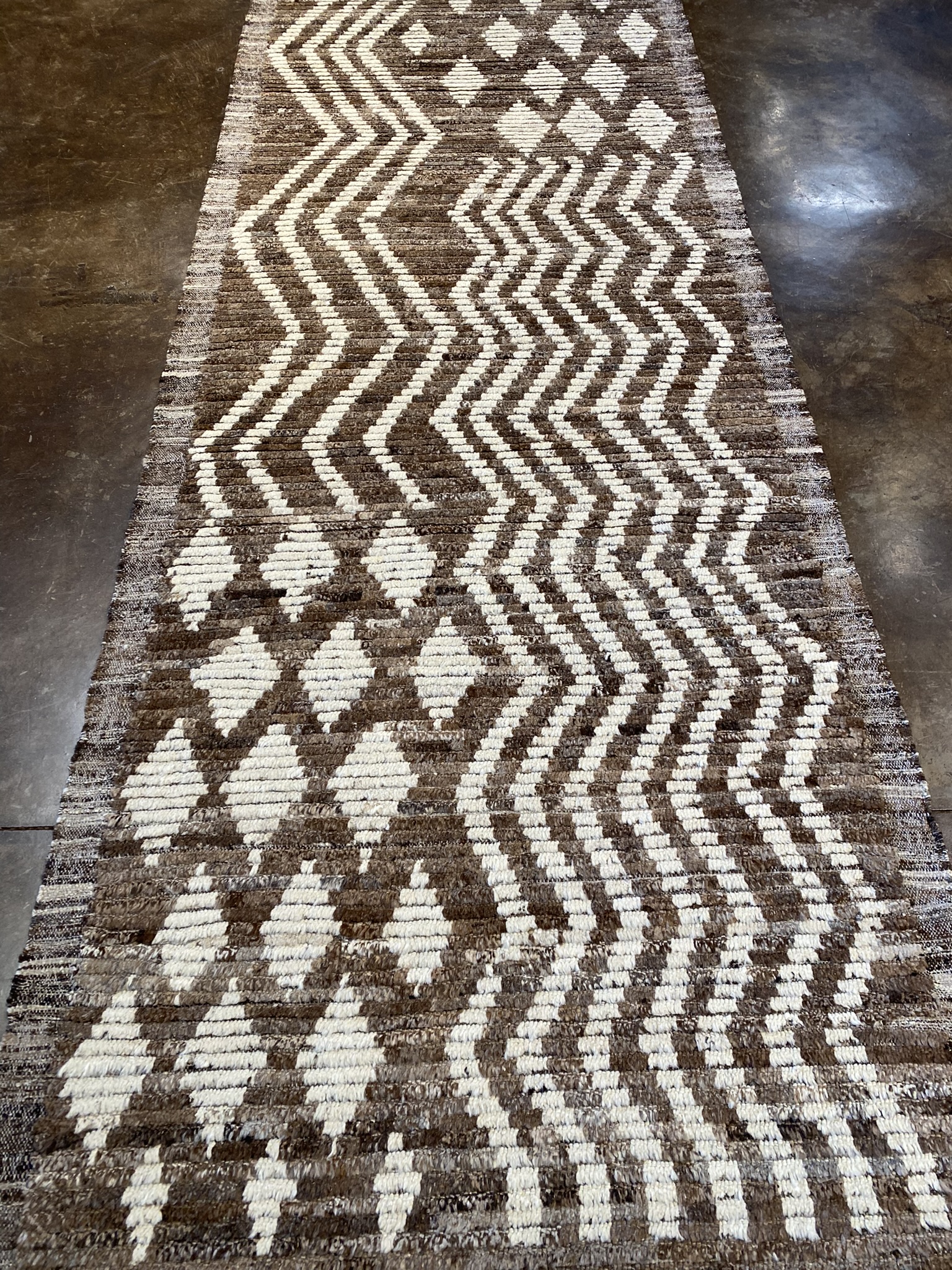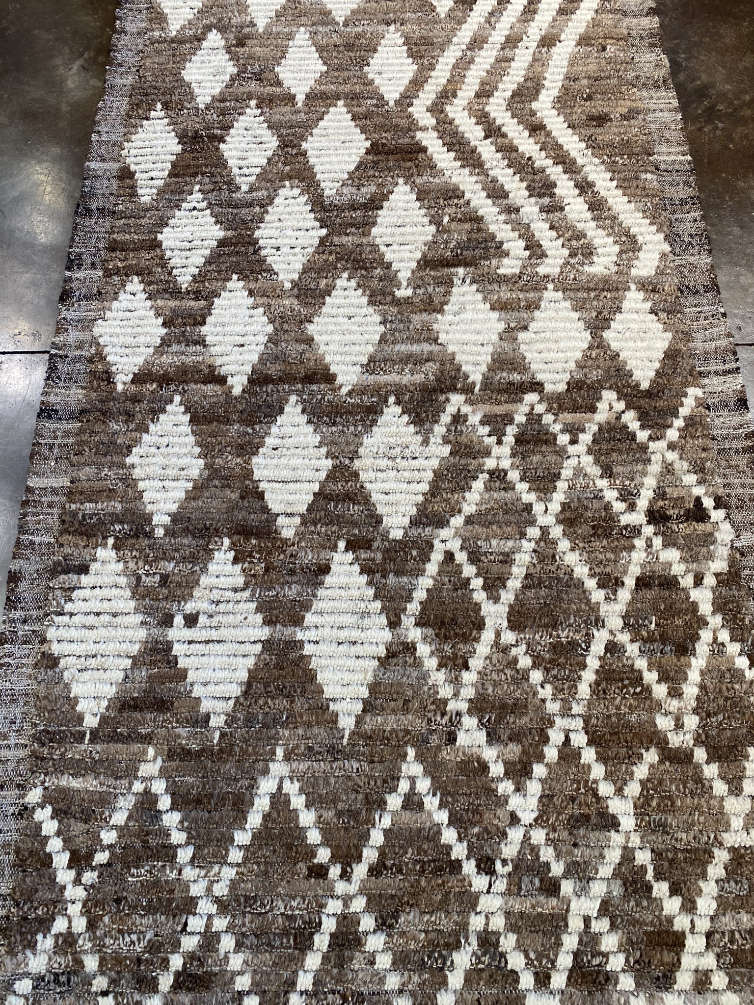 Elevate your space with this stunning Modern Beni runner rug, expertly crafted in Afghanistan. Measuring an impressive 3’10” x 16’7″ (46″ x 199″), this captivating piece showcases a mesmerizing geometric pattern in a sophisticated palette of brown and cream hues. The eclectic yet contemporary design features an intricate lattice motif that gradually transitions into striking diamond shapes, creating a sense of movement and visual intrigue along the length of the runner. Meticulously hand-woven using traditional techniques passed down through generations, this Modern Beni runner embodies the rich heritage of Afghan rug-making while embracing a fresh, modern aesthetic. The luxurious texture and durability of the natural fibers ensure that this rug will withstand the test of time, making it a timeless addition to your home decor. Whether gracing the hallway of a modern apartment or adding a touch of global charm to a transitional living room, this versatile runner effortlessly complements a wide range of design styles. The neutral color palette allows for seamless integration with existing furnishings, while the eye-catching pattern serves as a conversation starter and a focal point in any space. Invest in this exquisite Modern Beni runner rug and experience the perfect fusion of traditional craftsmanship and contemporary style. Transform your home into a haven of sophistication and comfort with this one-of-a-kind masterpiece that will be cherished for generations to come.