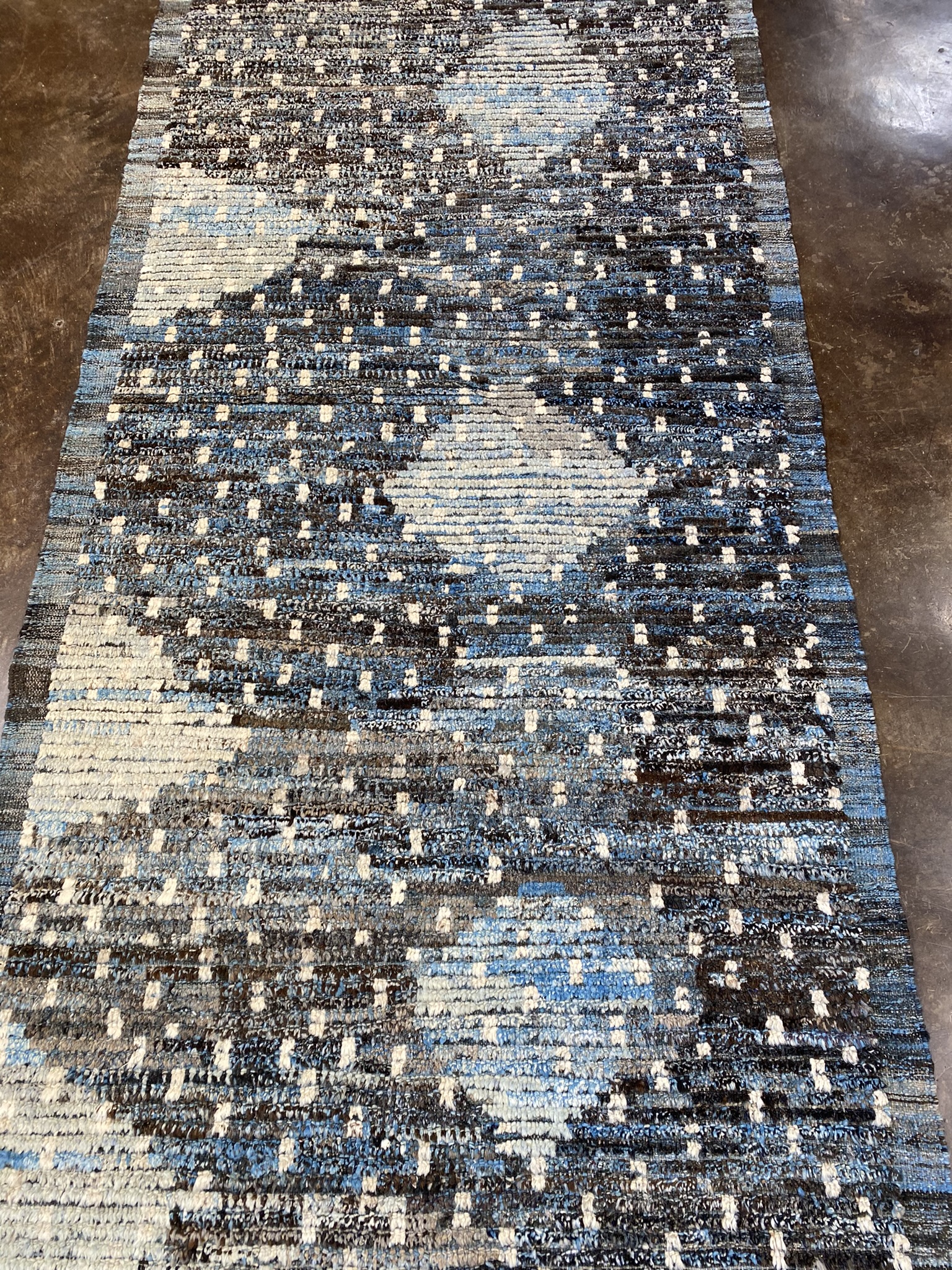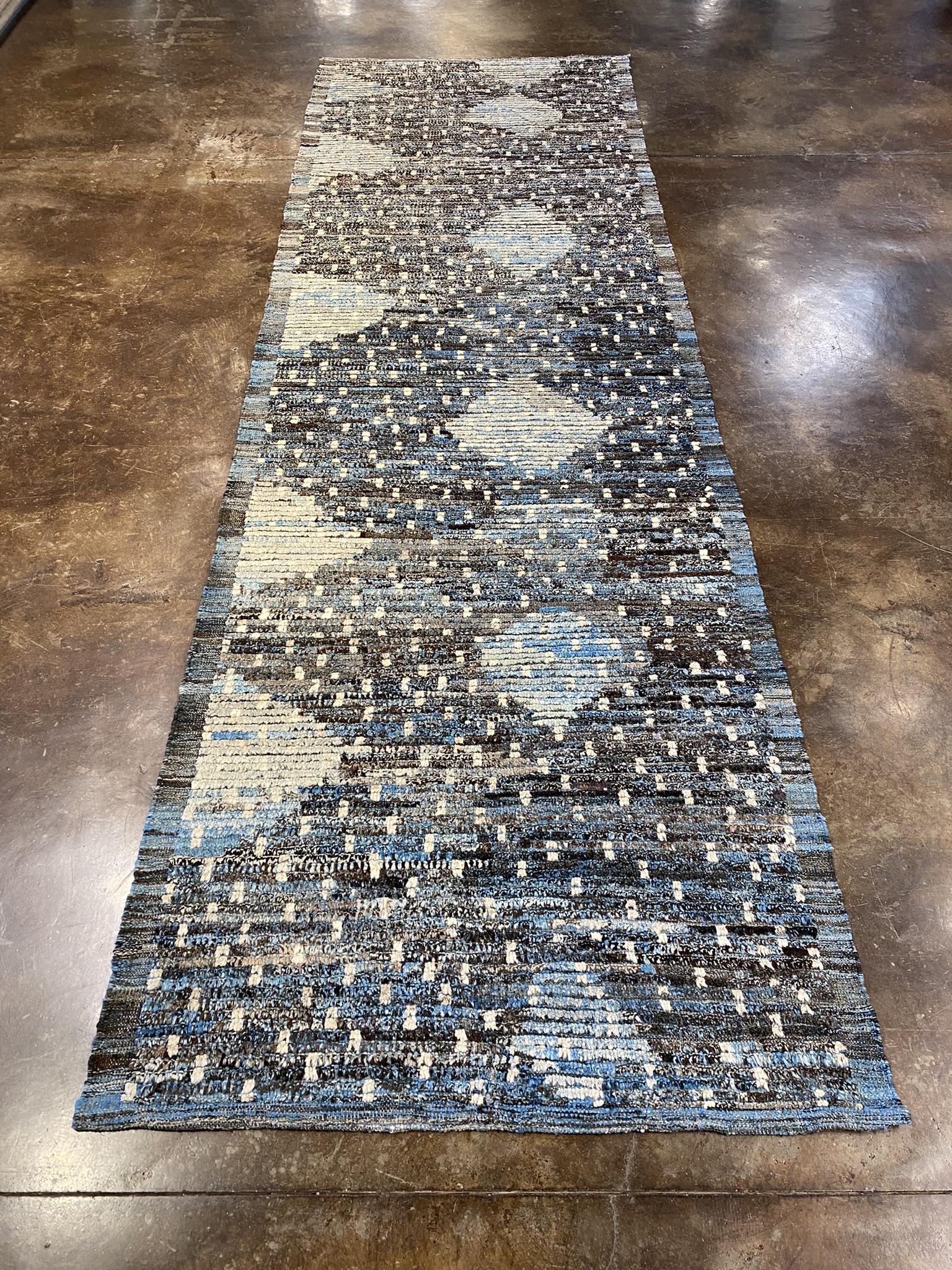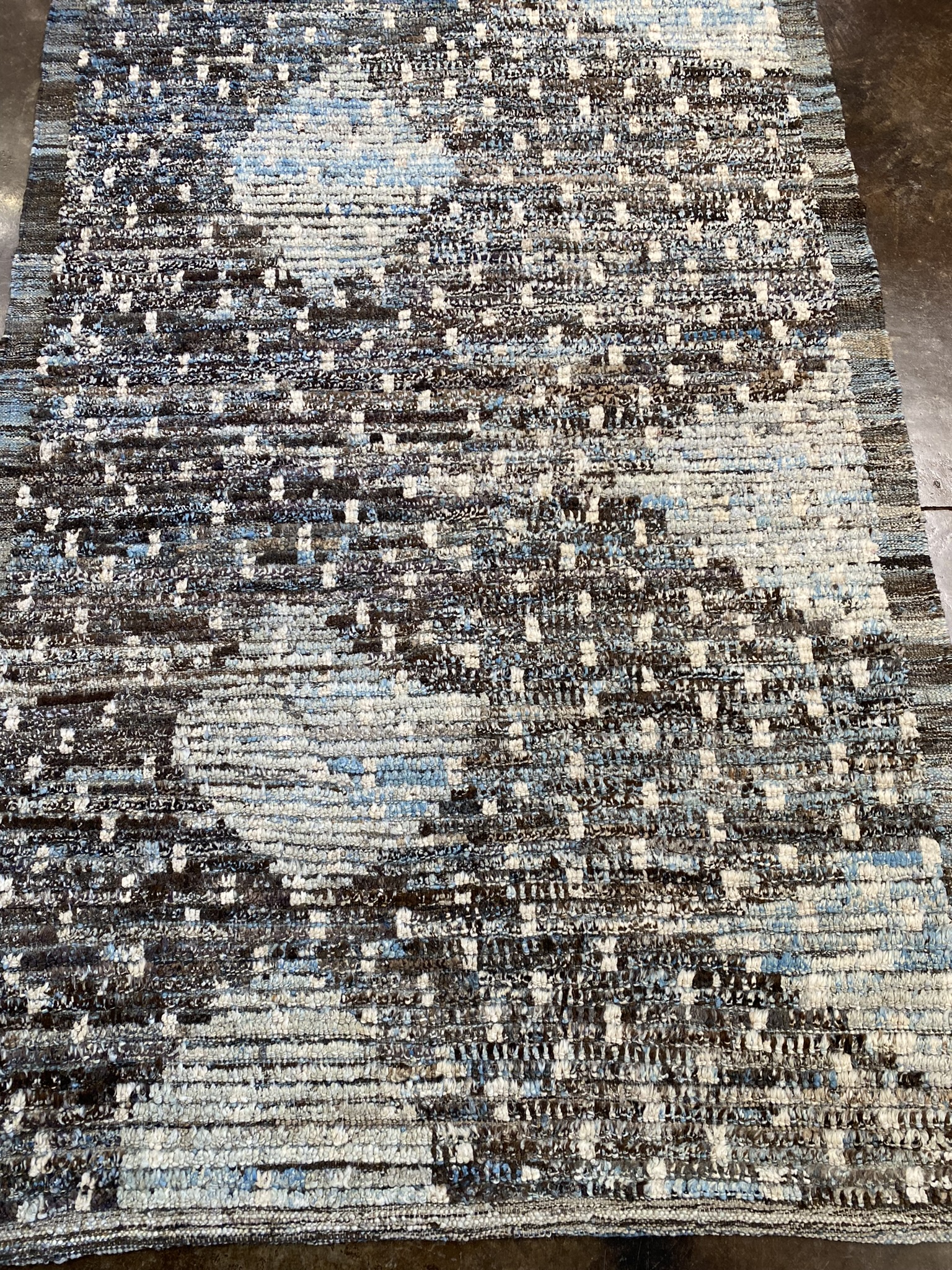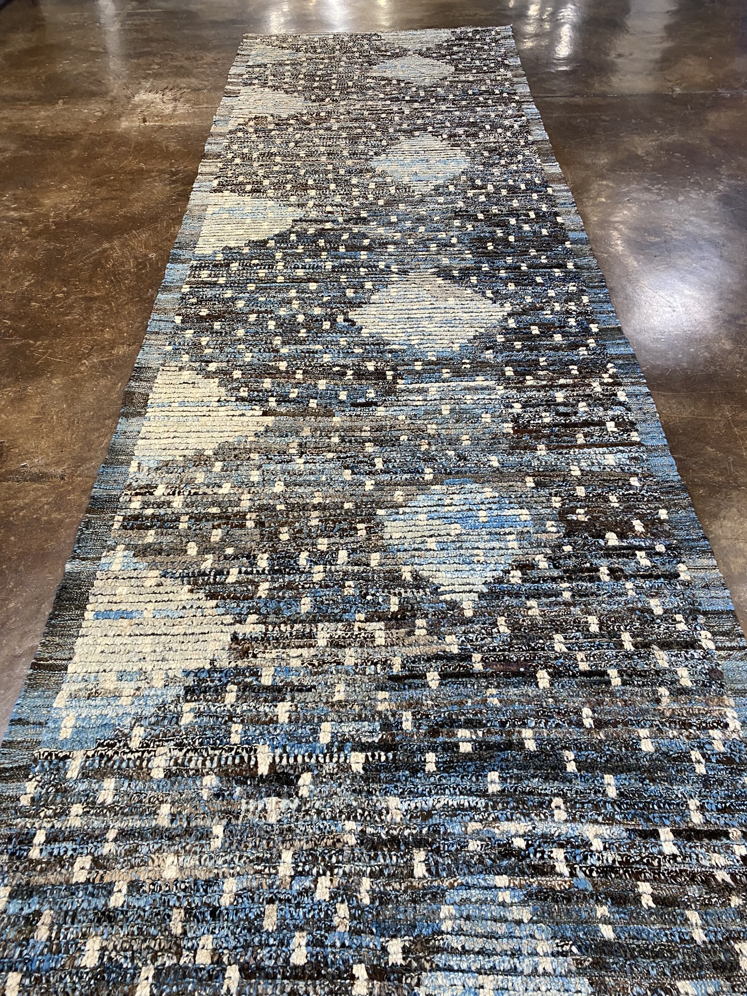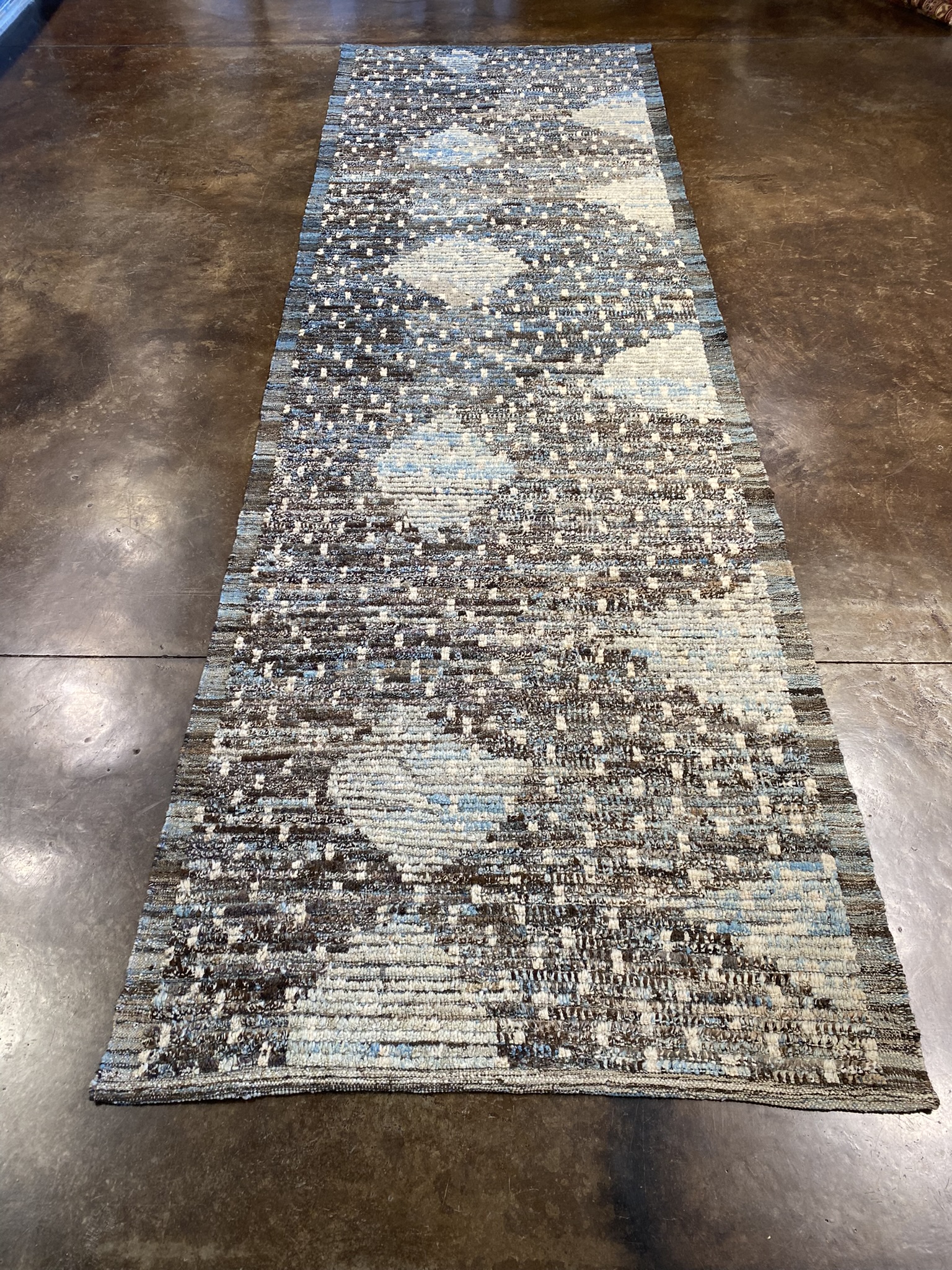 Elevate your space with this stunning Modern Beni runner rug, expertly crafted in Afghanistan. Measuring approximately 3’11” x 12’5″ (47″ x 149″), this runner is the perfect size to add a touch of contemporary style to your hallway, entryway, or bedroom. The rug features a captivating abstract design with a mesmerizing mix of brown, cream, and light blue hues. The intricate pattern showcases a blend of organic shapes and linear elements, creating a visually striking and modern aesthetic. The subtle color variations and textural details add depth and character to the rug, making it a true conversation piece. Crafted from high-quality materials, this Beni runner is built to withstand the test of time while maintaining its beauty and durability. The rug’s plush pile offers a soft and comfortable feel underfoot, making it a pleasure to walk on barefoot or with shoes. Whether you’re looking to refresh your home decor or add a touch of sophistication to your office, this Modern Beni runner is the perfect choice. Its versatile design seamlessly complements a wide range of interior styles, from minimalist and industrial to bohemian and eclectic. Invest in this exquisite Afghan runner rug and experience the perfect blend of modern design and traditional craftsmanship. It’s a timeless piece that will enhance the beauty and comfort of your space for years to come.