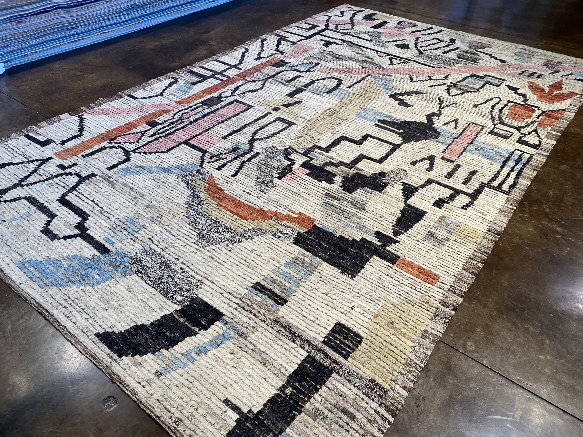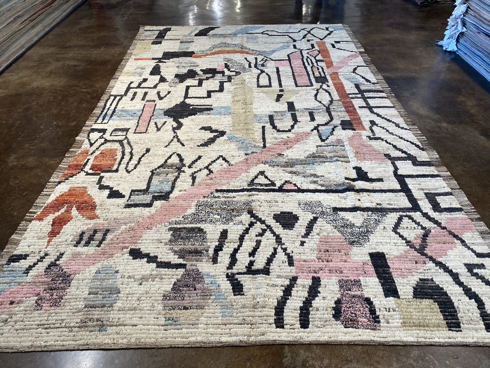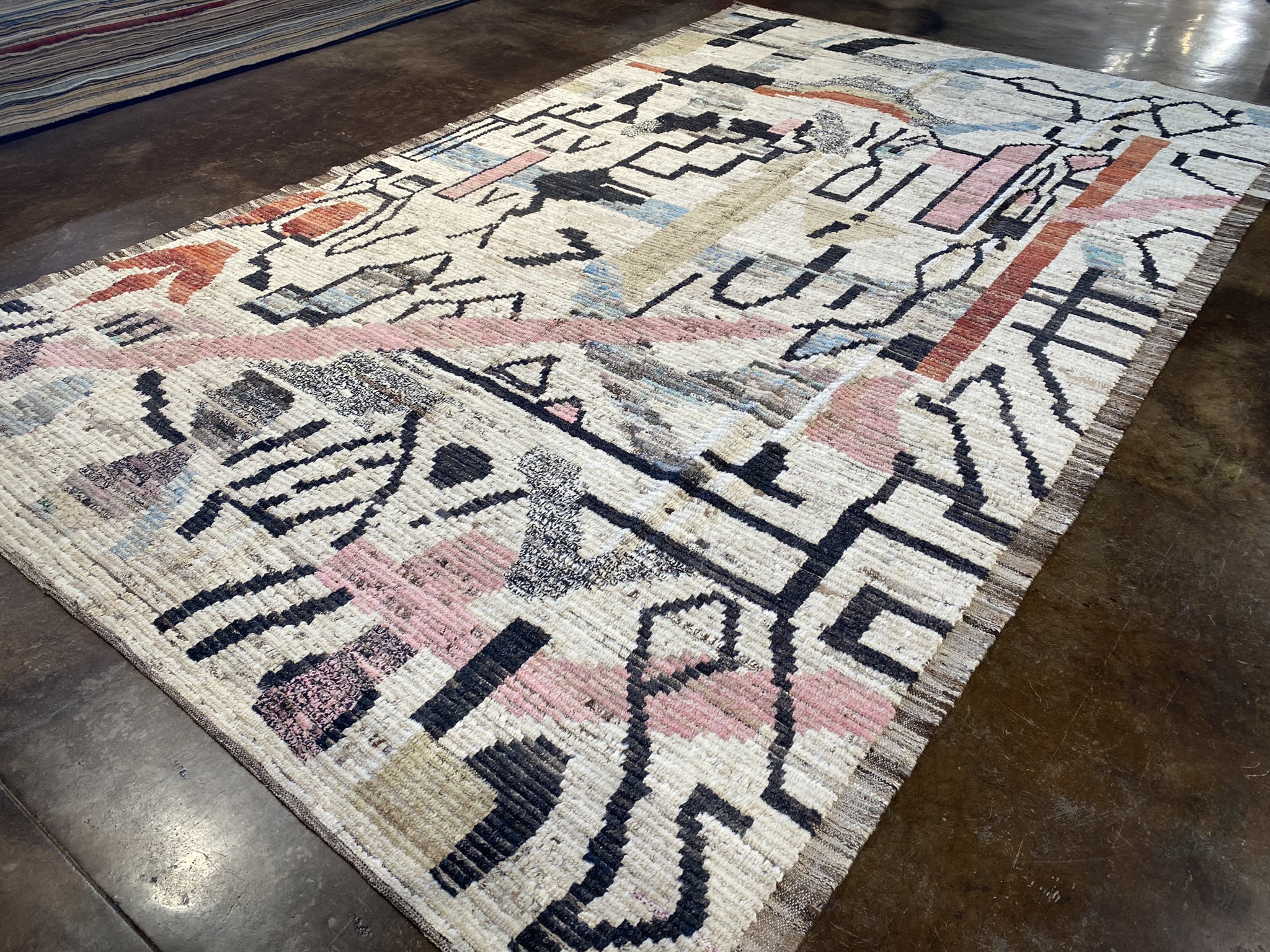 Introduce a strikingly modern touch to your living space with this captivating 7’3″ x 11’8″ MODERN BENI Afghan rug. Boasting an eclectic, contemporary design, this gallery-sized piece features an abstract composition of angular shapes and lines in a sophisticated palette of black, brown, red, blue, tan, and ivory hues. The rug’s pile is meticulously hand-knotted, showcasing the exceptional craftsmanship and rich textile traditions of Afghanistan. The intricate pattern draws the eye across the expansive field, inviting closer inspection of the artful interplay between geometric forms and subtle color variations. Crafted to withstand the test of time, this MODERN BENI rug is a brand new addition to our collection, ensuring you’ll enjoy its beauty and durability for years to come. The generous dimensions provide ample coverage for larger rooms, allowing the design to take center stage and unite the surrounding décor with its bold, adventurous spirit. Elevate your interior with this one-of-a-kind modern masterpiece—a testament to the enduring allure of Afghan rug-making heritage, reimagined for the contemporary home.