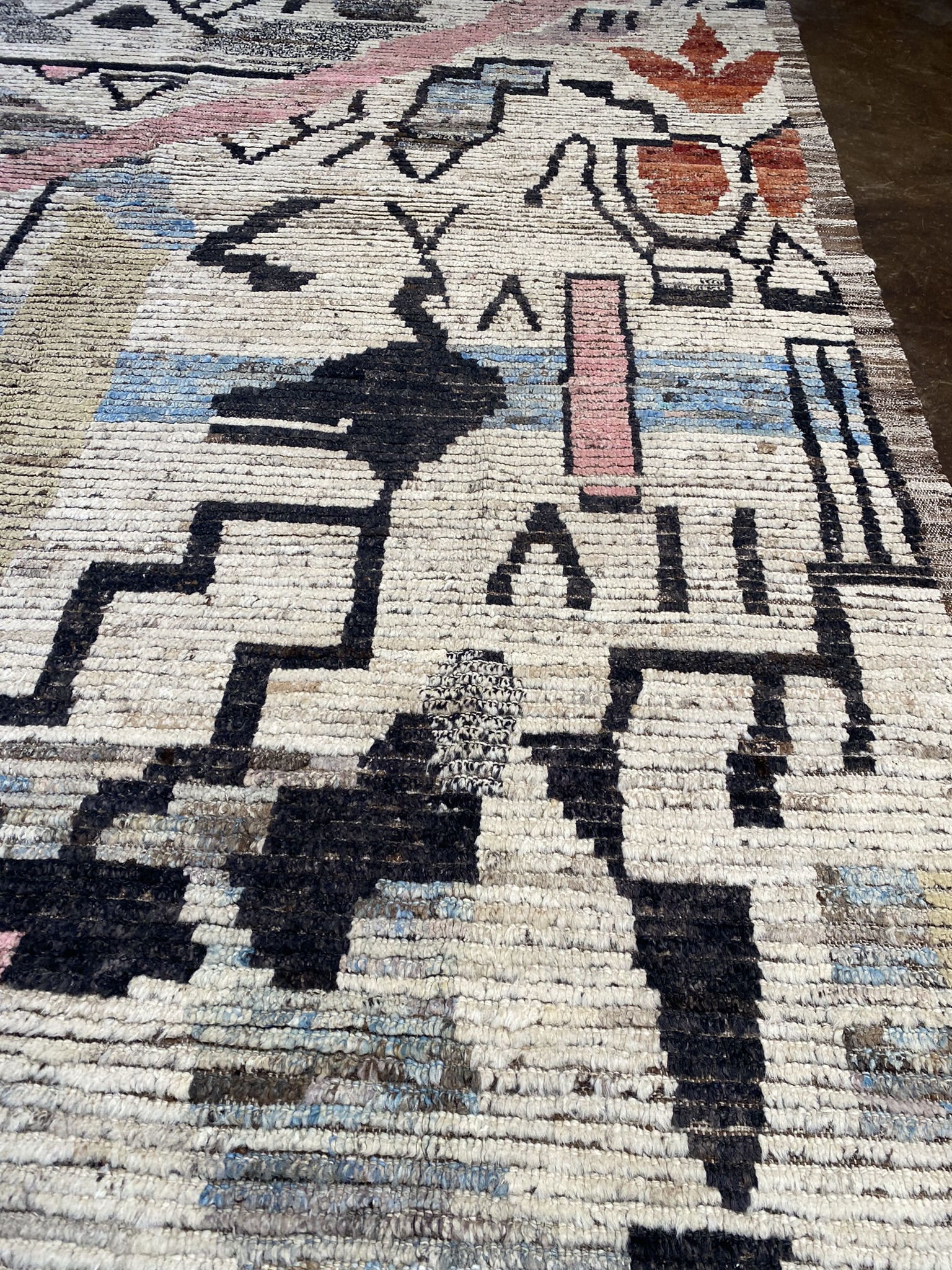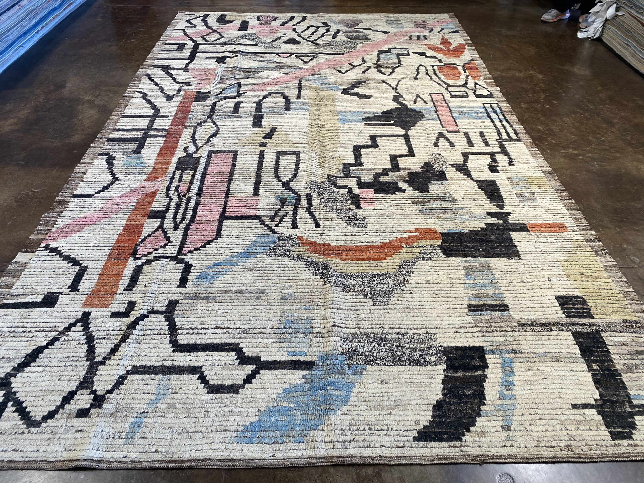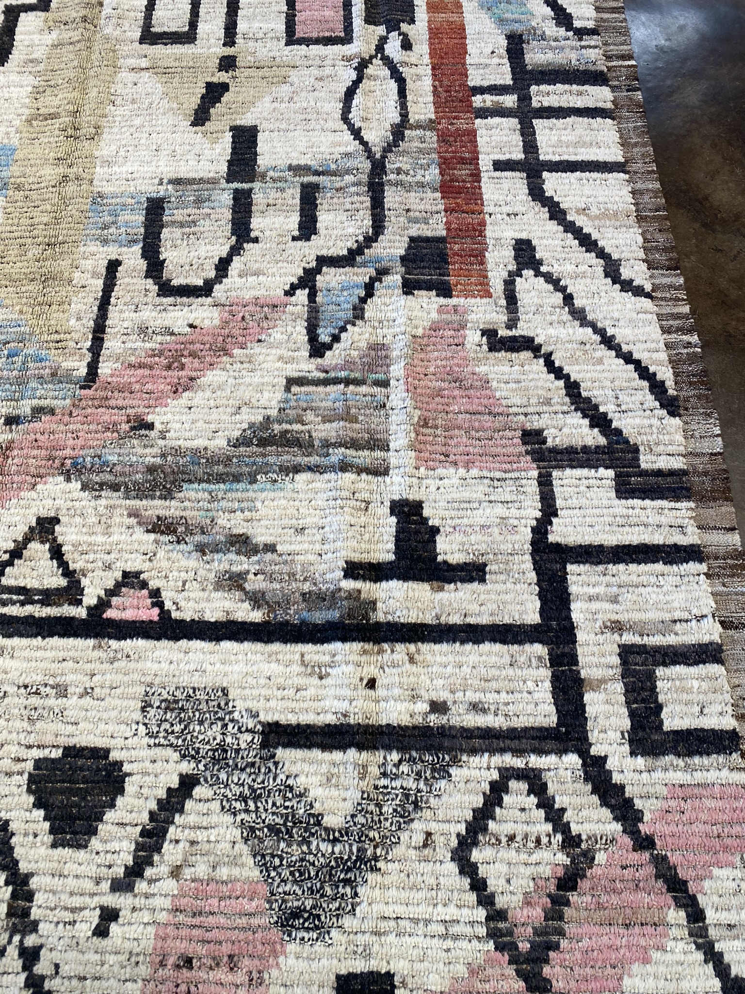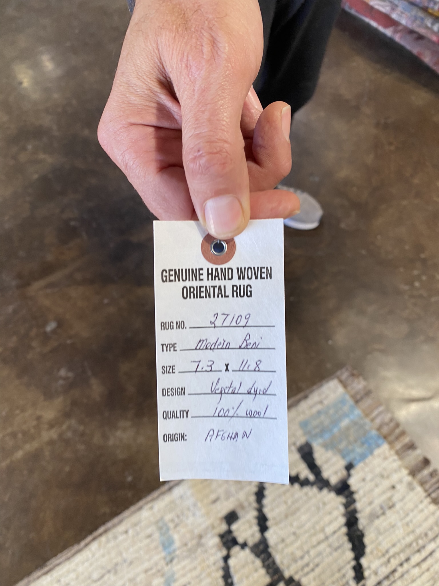 Introduce a strikingly modern touch to your living space with this captivating 7’3″ x 11’8″ MODERN BENI Afghan rug. Boasting an eclectic, contemporary design, this gallery-sized piece features an abstract composition of angular shapes and lines in a sophisticated palette of black, brown, red, blue, tan, and ivory hues. The rug’s pile is meticulously hand-knotted, showcasing the exceptional craftsmanship and rich textile traditions of Afghanistan. The intricate pattern draws the eye across the expansive field, inviting closer inspection of the artful interplay between geometric forms and subtle color variations. Crafted to withstand the test of time, this MODERN BENI rug is a brand new addition to our collection, ensuring you’ll enjoy its beauty and durability for years to come. The generous dimensions provide ample coverage for larger rooms, allowing the design to take center stage and unite the surrounding décor with its bold, adventurous spirit. Elevate your interior with this one-of-a-kind modern masterpiece—a testament to the enduring allure of Afghan rug-making heritage, reimagined for the contemporary home.