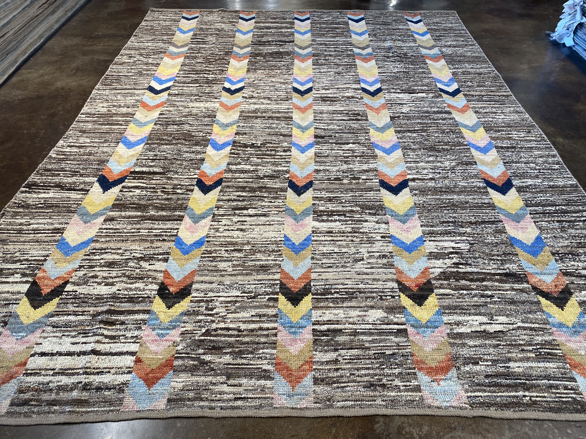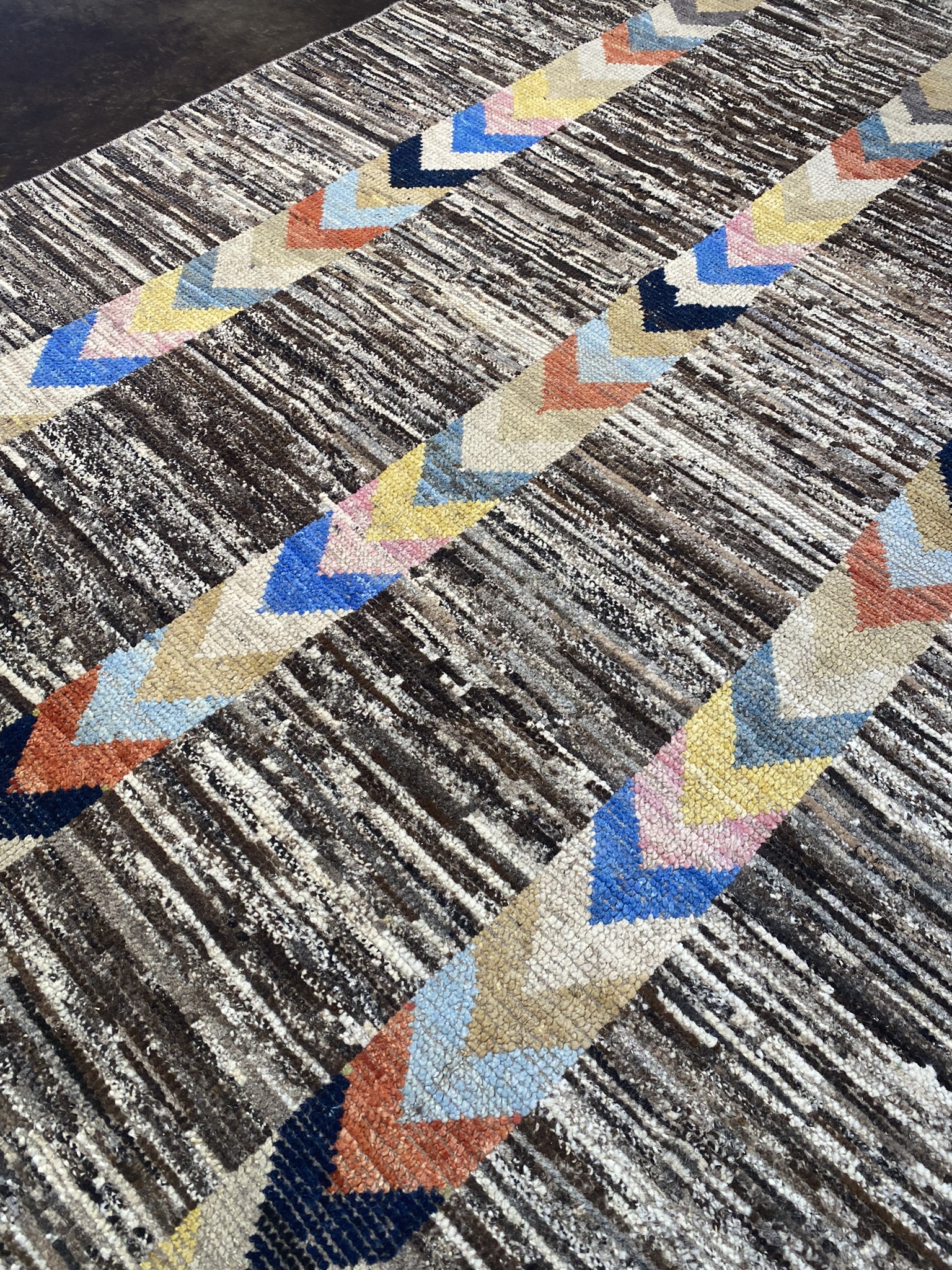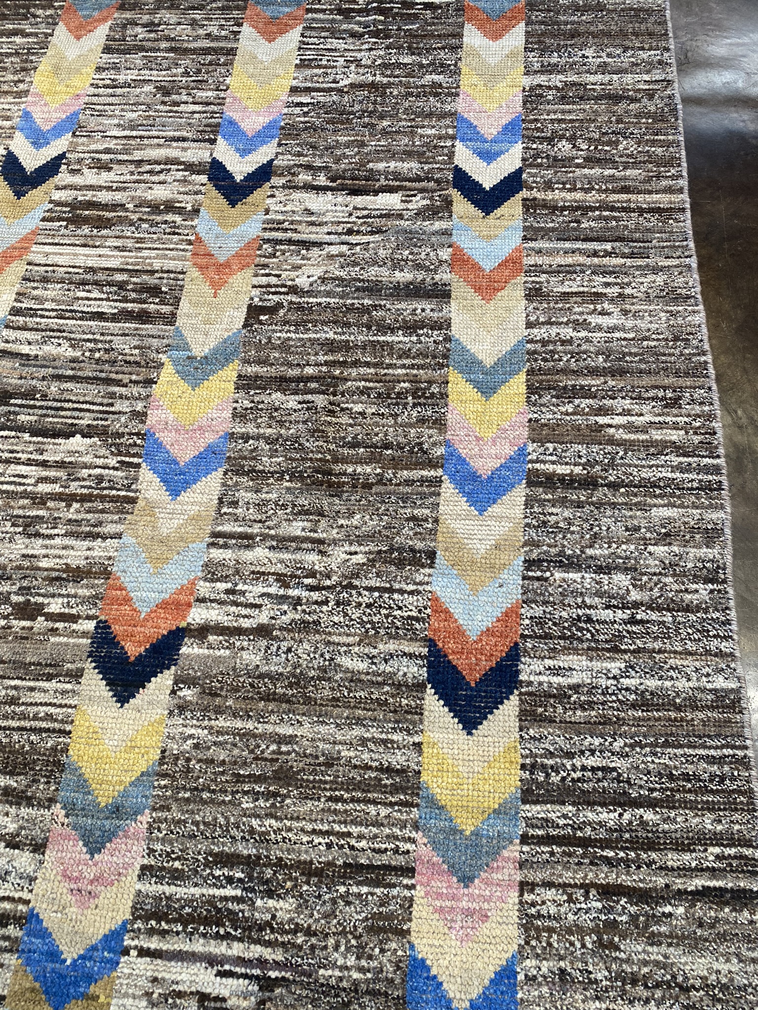 Introduce modern elegance to your space with the MODERN BENI 8’9″ x 11’11” area rug. Crafted in Afghanistan, this captivating rug showcases a contemporary design featuring striking chevron patterns in a vibrant palette of black, brown, red, blue, ivory, tan and yellow hues. The eclectic color scheme adds visual interest while remaining versatile to complement a range of decor styles. Expertly hand-woven from high-quality materials, the MODERN BENI offers durability and long-lasting beauty. The generous 9′ x 12′ size provides ample coverage for living rooms, dining areas, or spacious bedrooms. The low pile height ensures easy maintenance and withstands high-traffic areas. Whether you’re aiming for a modern, eclectic, or contemporary aesthetic, this stunning rug effortlessly elevates any room. The artful combination of colors and eye-catching chevron motif create a focal point that ties your space together. Experience the perfect blend of style and practicality with the MODERN BENI 8’9″ x 11’11” area rug, a timeless addition to your home.