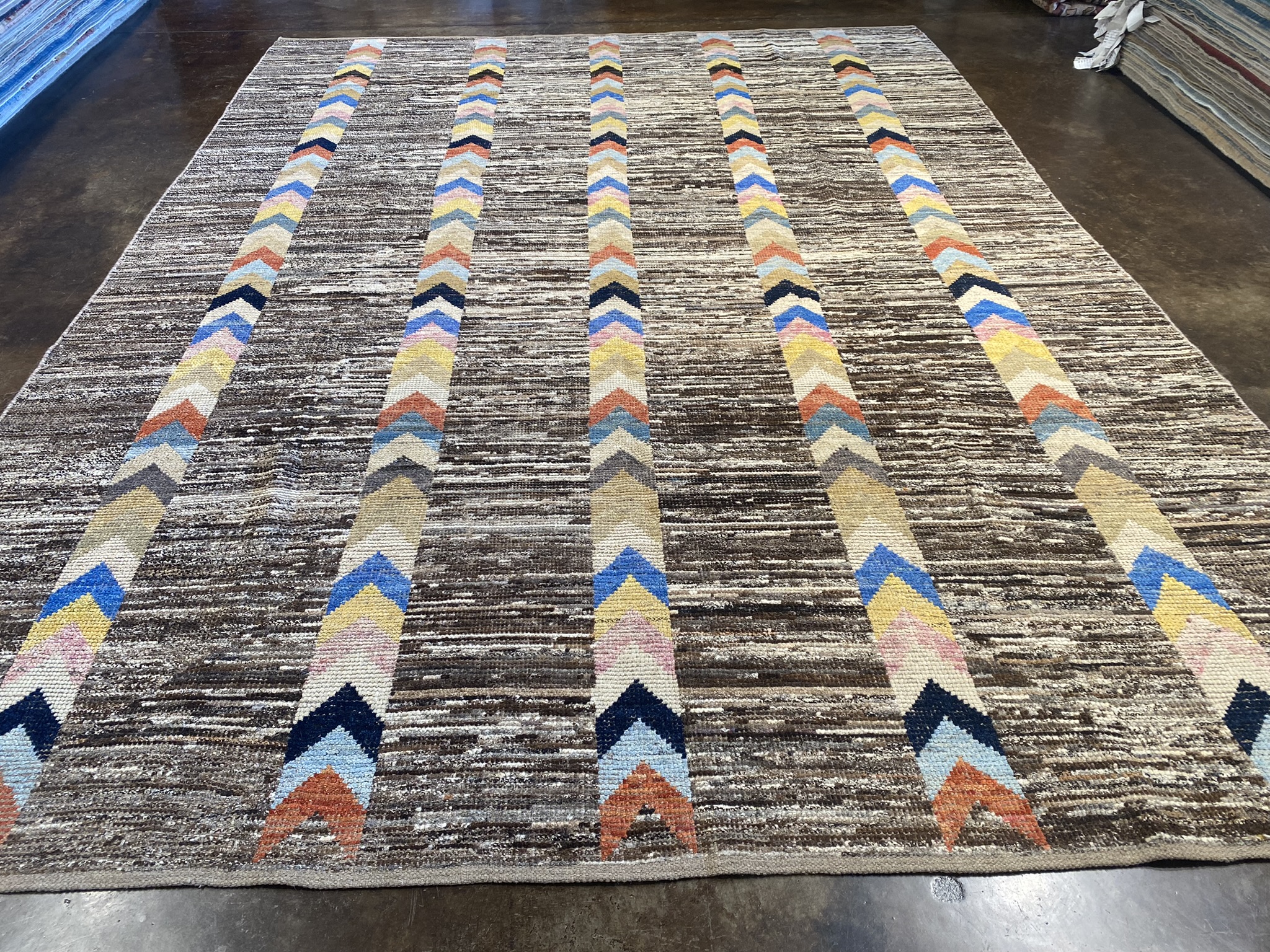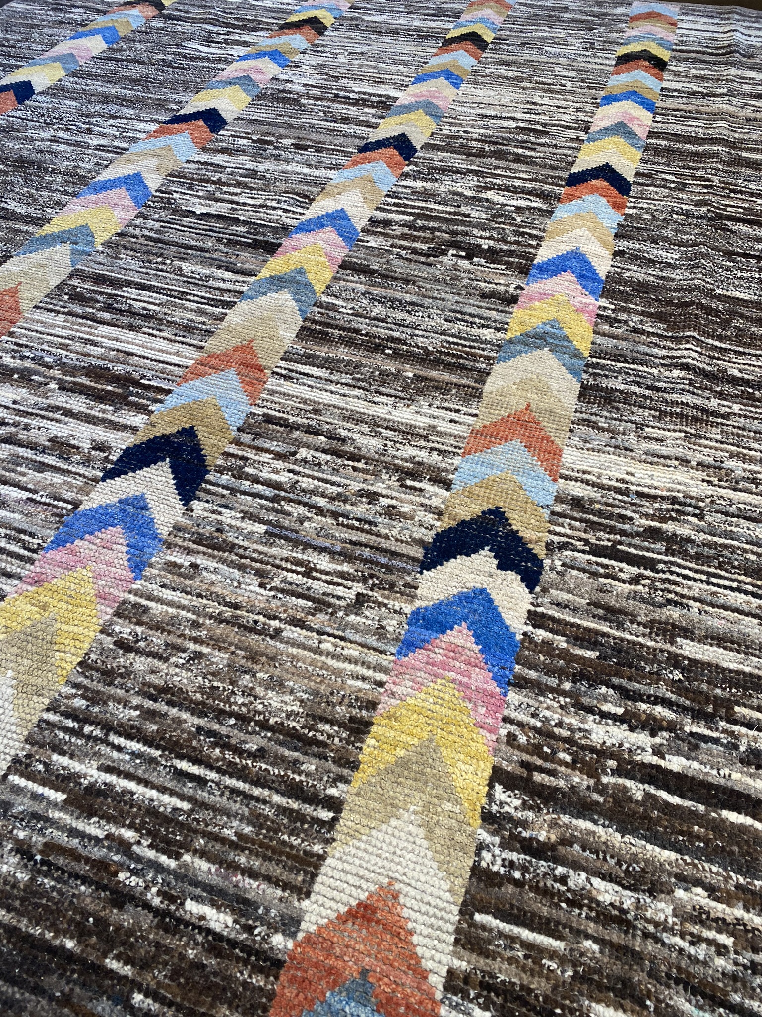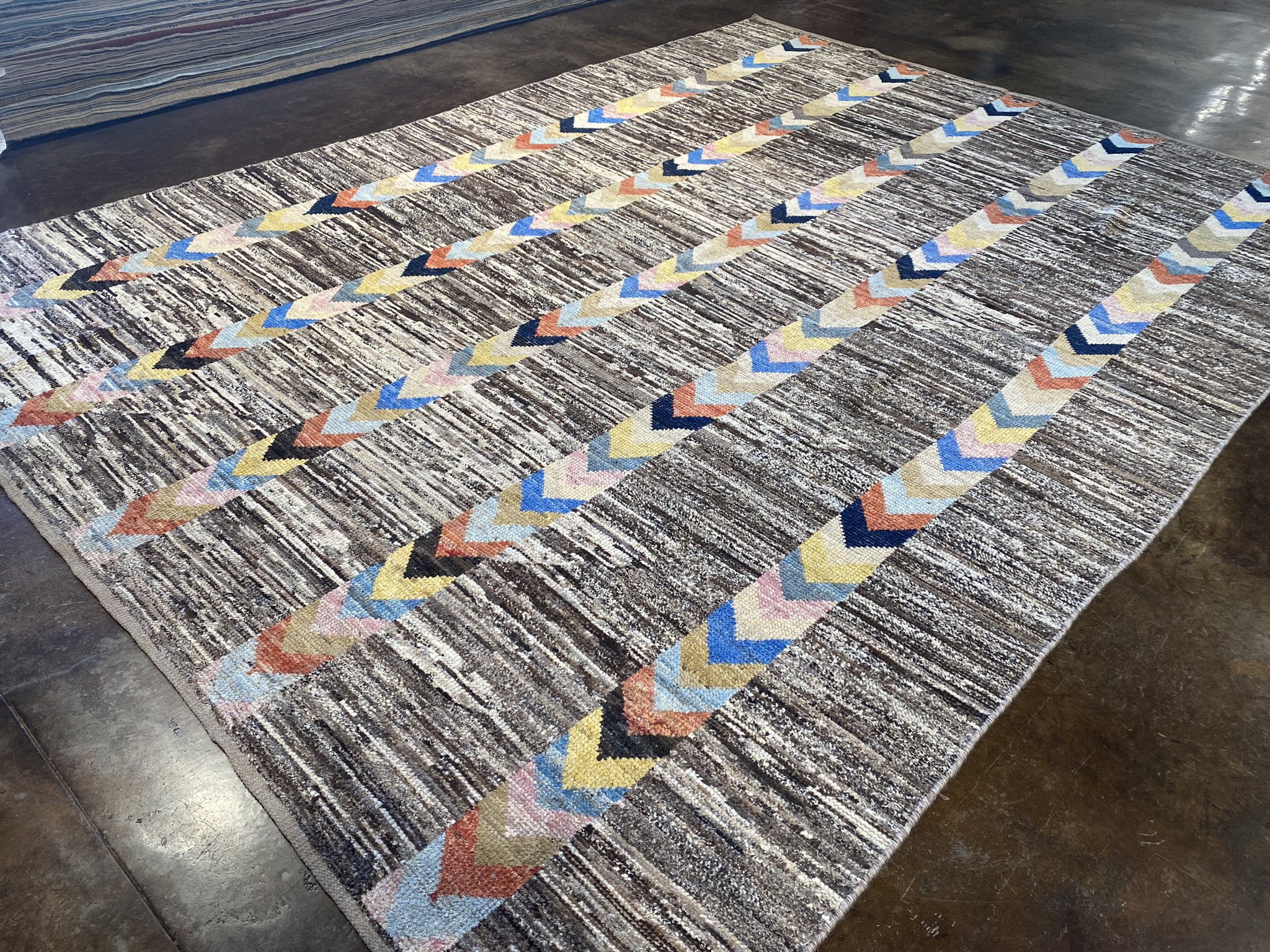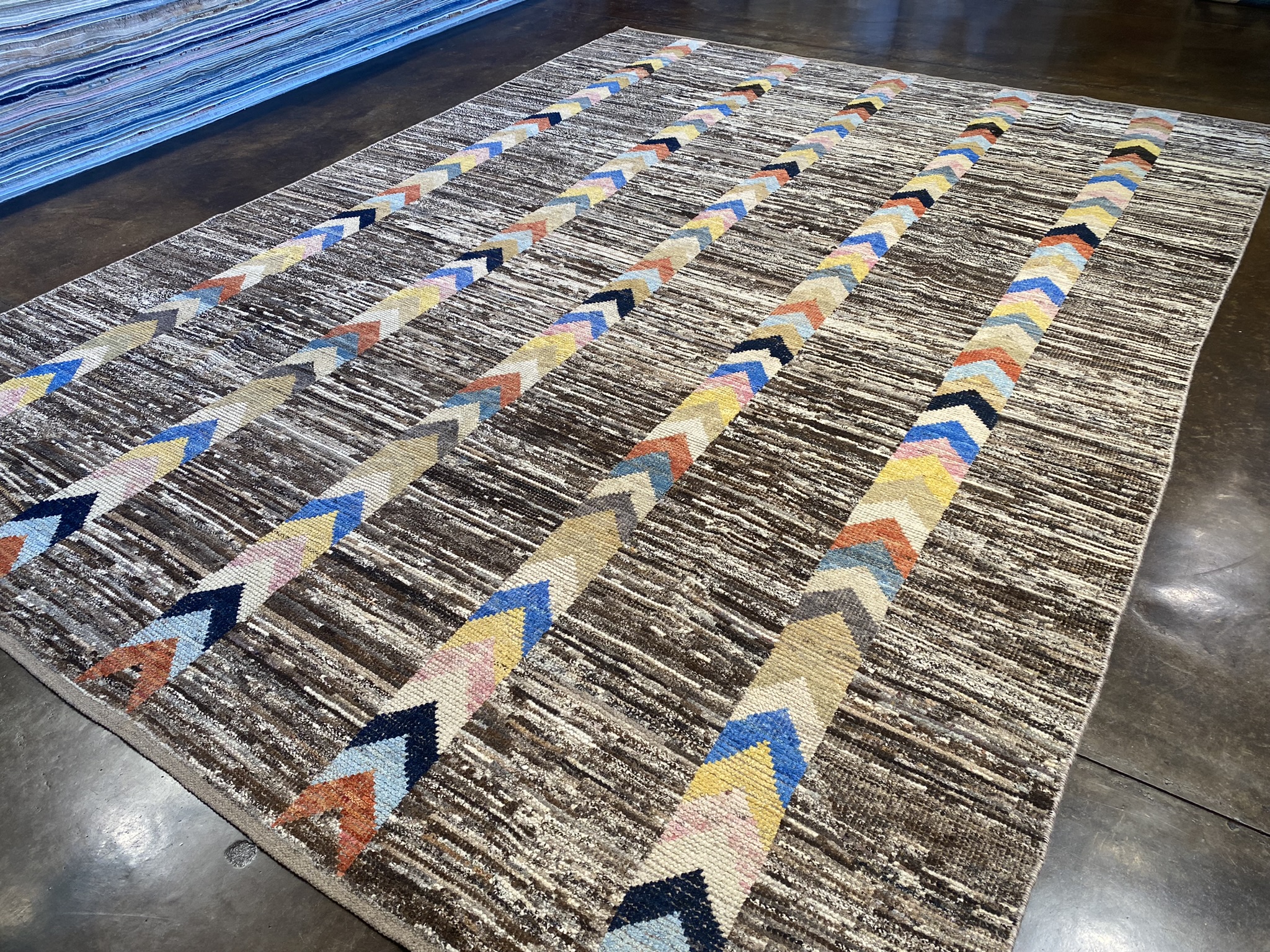 Introduce modern elegance to your space with the MODERN BENI 8’9″ x 11’11” area rug. Crafted in Afghanistan, this captivating rug showcases a contemporary design featuring striking chevron patterns in a vibrant palette of black, brown, red, blue, ivory, tan and yellow hues. The eclectic color scheme adds visual interest while remaining versatile to complement a range of decor styles. Expertly hand-woven from high-quality materials, the MODERN BENI offers durability and long-lasting beauty. The generous 9′ x 12′ size provides ample coverage for living rooms, dining areas, or spacious bedrooms. The low pile height ensures easy maintenance and withstands high-traffic areas. Whether you’re aiming for a modern, eclectic, or contemporary aesthetic, this stunning rug effortlessly elevates any room. The artful combination of colors and eye-catching chevron motif create a focal point that ties your space together. Experience the perfect blend of style and practicality with the MODERN BENI 8’9″ x 11’11” area rug, a timeless addition to your home.