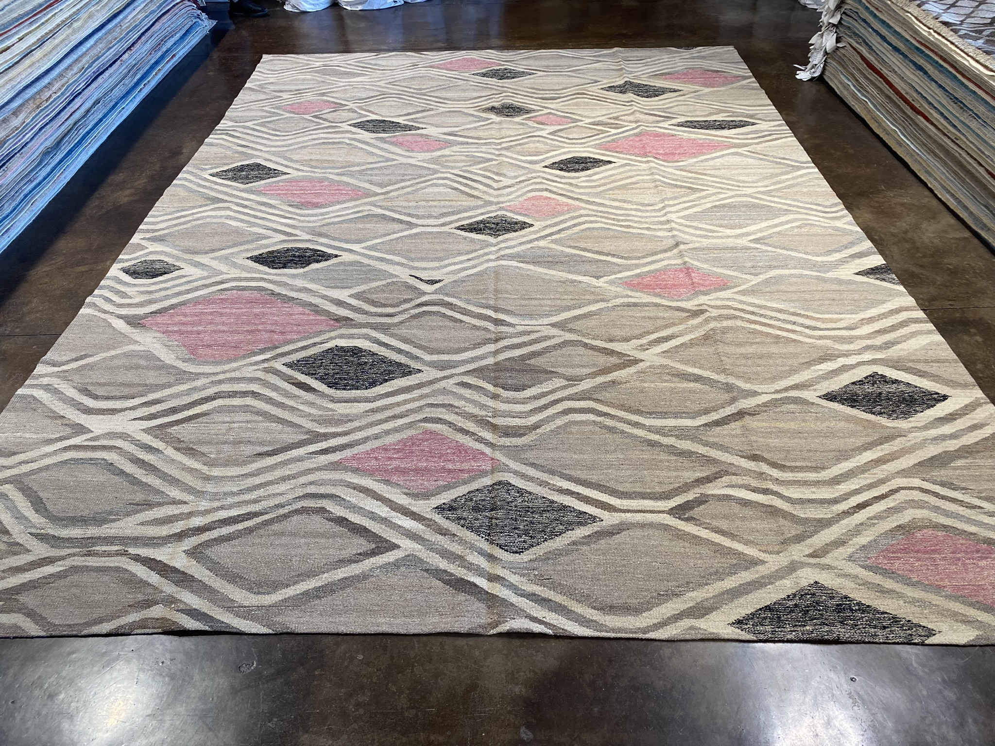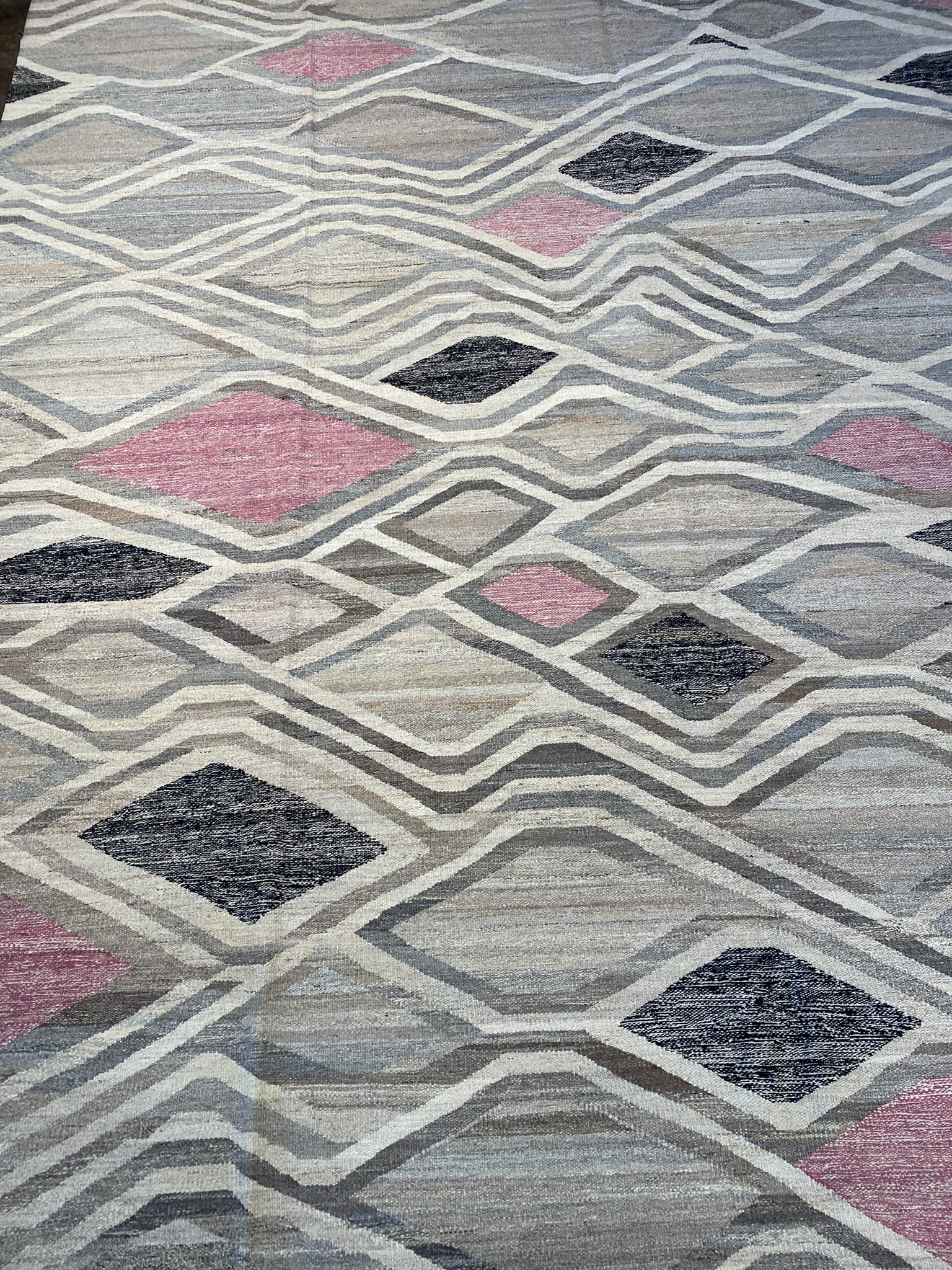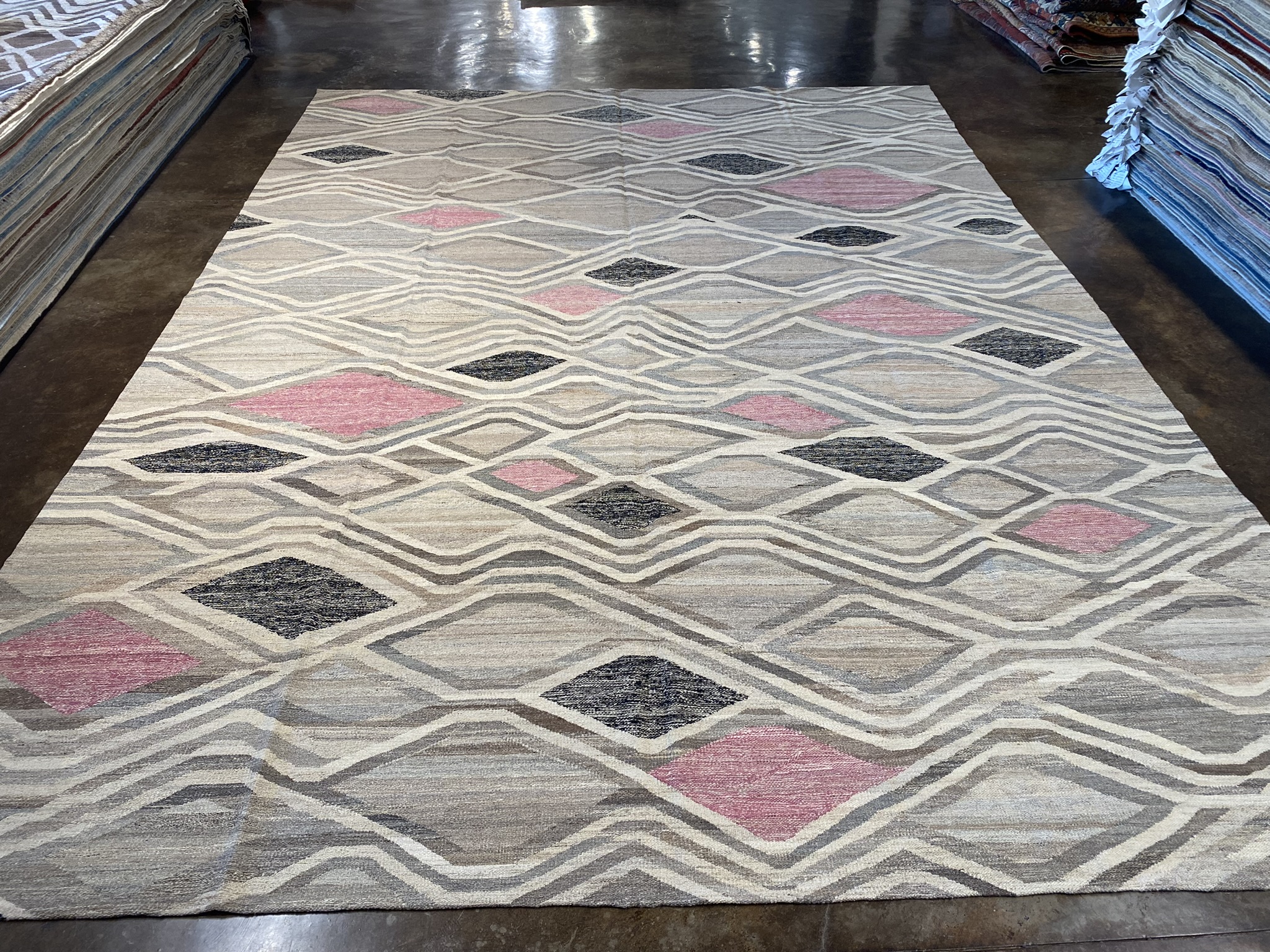 Introduce modern elegance to your space with this stunning 10′ x 13’10” Afghan Kilim rug. Crafted with meticulous attention to detail, this contemporary masterpiece showcases an eclectic geometric pattern in a sophisticated palette of black, brown, cream, and red pink hues. The striking design features interlocking diamond shapes that create a mesmerizing sense of movement and depth across the rug’s expansive surface. Expertly handwoven using traditional techniques, this kilim rug is a testament to the exceptional craftsmanship and rich textile heritage of Afghanistan. The flat-weave construction results in a low-profile, durable rug that is well-suited for high-traffic areas and easy to maintain. The rug’s generous 10-foot by 13-foot-10-inch dimensions provide ample coverage for larger living spaces, dining rooms, or bedrooms. The versatile color scheme effortlessly complements a wide range of decor styles, from modern and minimalist to bohemian and eclectic. Elevate your interior design with this one-of-a-kind modern kilim rug, and enjoy its timeless beauty and enduring quality for years to come. A true collector’s piece, this Afghan kilim is sure to become a cherished focal point in any room it graces.