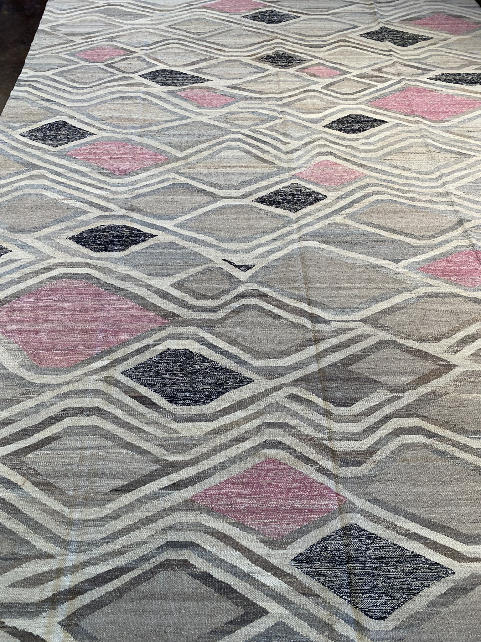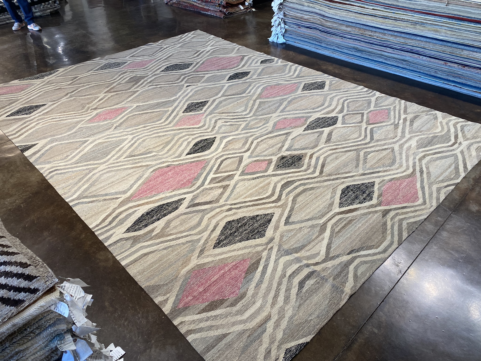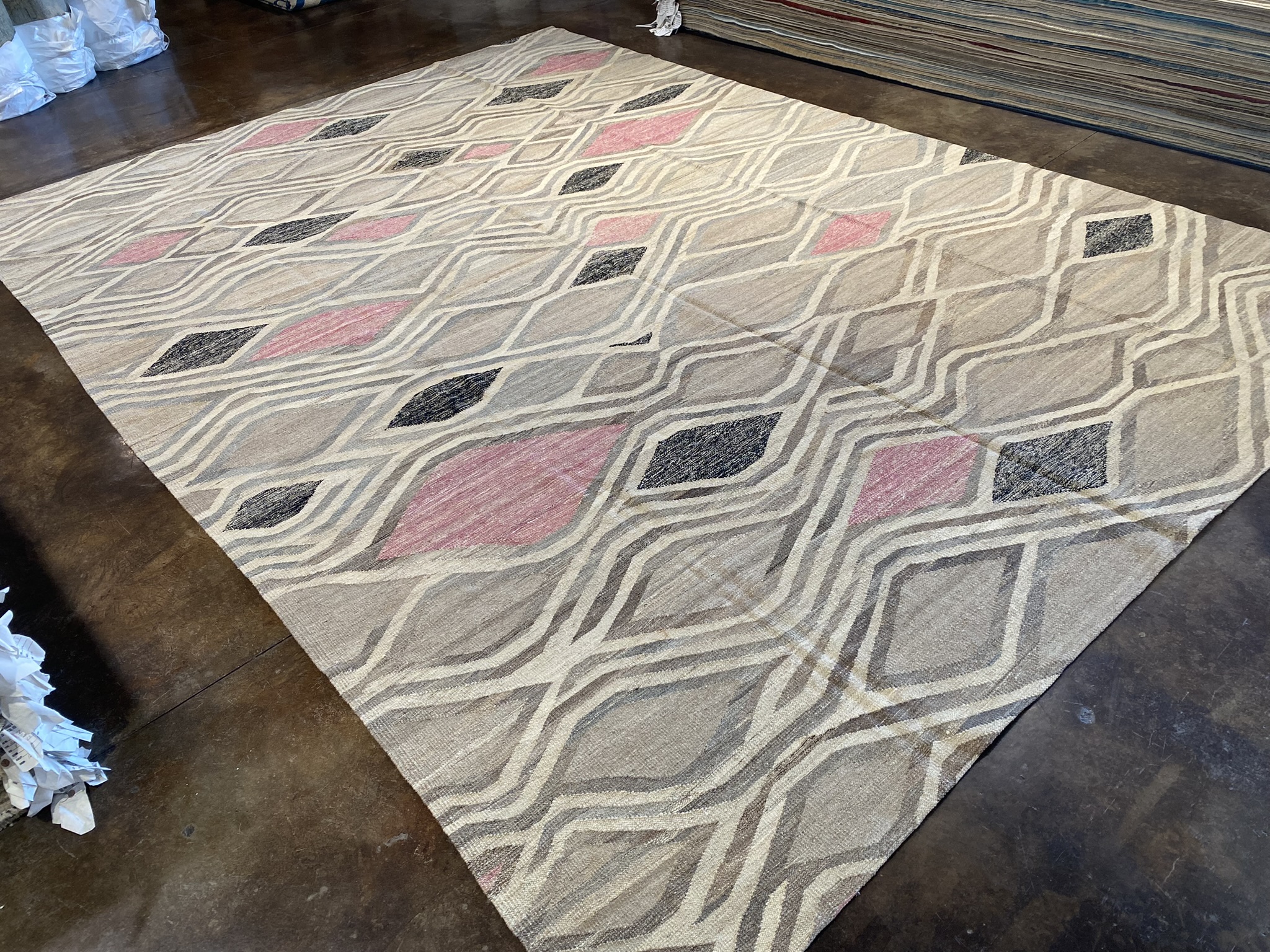 Introduce modern elegance to your space with this stunning 10′ x 13’10” Afghan Kilim rug. Crafted with meticulous attention to detail, this contemporary masterpiece showcases an eclectic geometric pattern in a sophisticated palette of black, brown, cream, and red pink hues. The striking design features interlocking diamond shapes that create a mesmerizing sense of movement and depth across the rug’s expansive surface. Expertly handwoven using traditional techniques, this kilim rug is a testament to the exceptional craftsmanship and rich textile heritage of Afghanistan. The flat-weave construction results in a low-profile, durable rug that is well-suited for high-traffic areas and easy to maintain. The rug’s generous 10-foot by 13-foot-10-inch dimensions provide ample coverage for larger living spaces, dining rooms, or bedrooms. The versatile color scheme effortlessly complements a wide range of decor styles, from modern and minimalist to bohemian and eclectic. Elevate your interior design with this one-of-a-kind modern kilim rug, and enjoy its timeless beauty and enduring quality for years to come. A true collector’s piece, this Afghan kilim is sure to become a cherished focal point in any room it graces.