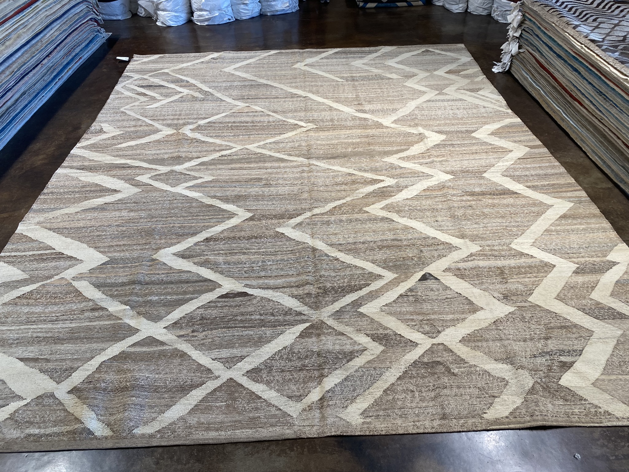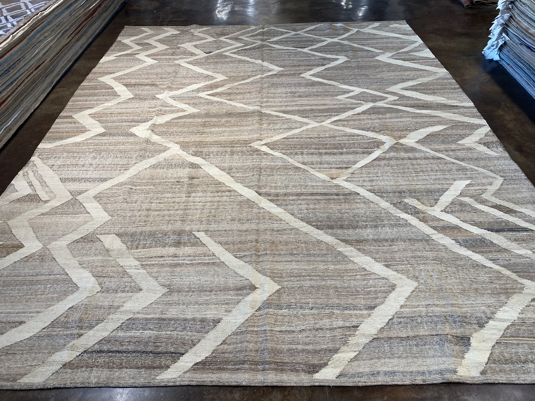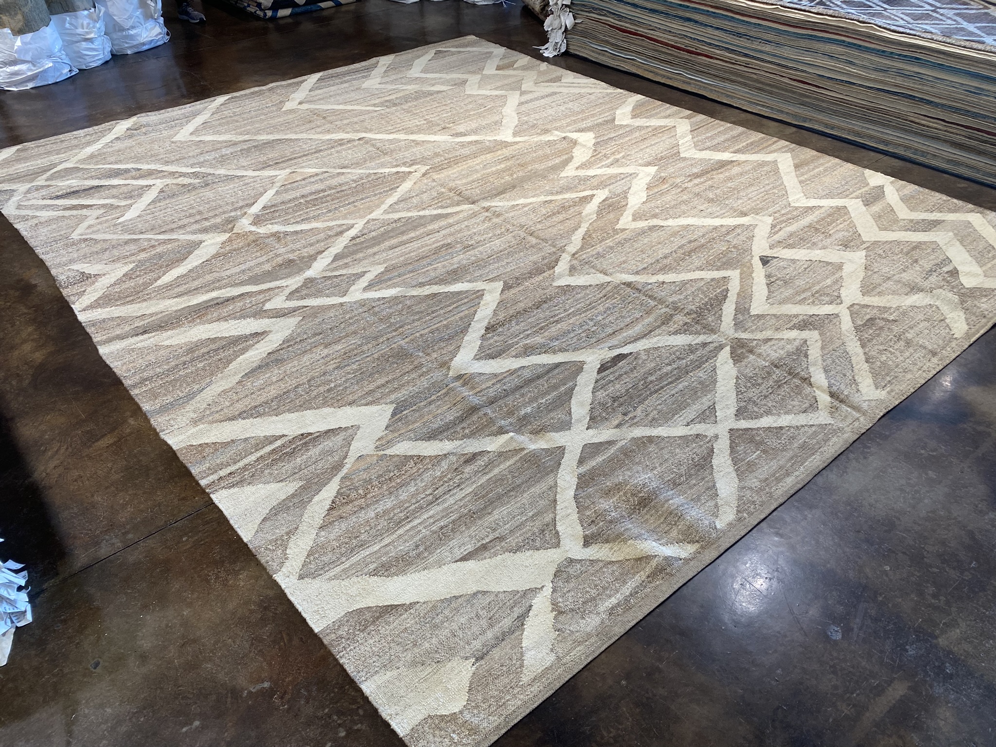 Introduce modern elegance to your space with this stunning new 10’10” x 13’4″ Afghan kilim rug. Crafted with an eclectic, contemporary design, this kilim features a captivating geometric pattern in a sophisticated palette of brown, cream, and ivory hues. The striking zigzag lines create a sense of movement and visual interest, while the neutral colors provide versatility to complement a variety of decor styles. Meticulously handwoven using traditional techniques, this modern kilim showcases the exceptional craftsmanship and rich textile heritage of Afghan artisans. The flat-weave construction lends a sleek, low-profile look that is both durable and easy to maintain. With generous dimensions of approximately 130 inches in length and 160 inches in width, this rug is perfect for anchoring a spacious living room, dining area, or bedroom. The combination of its contemporary aesthetic and time-honored craftsmanship makes this kilim an ideal choice for those seeking to infuse their home with a touch of modern sophistication while appreciating the beauty of handmade textiles. Elevate your interior design with this exquisite modern Afghan kilim, and enjoy its timeless beauty for years to come. Don’t miss the opportunity to own this unique and captivating piece that effortlessly merges traditional techniques with contemporary style.