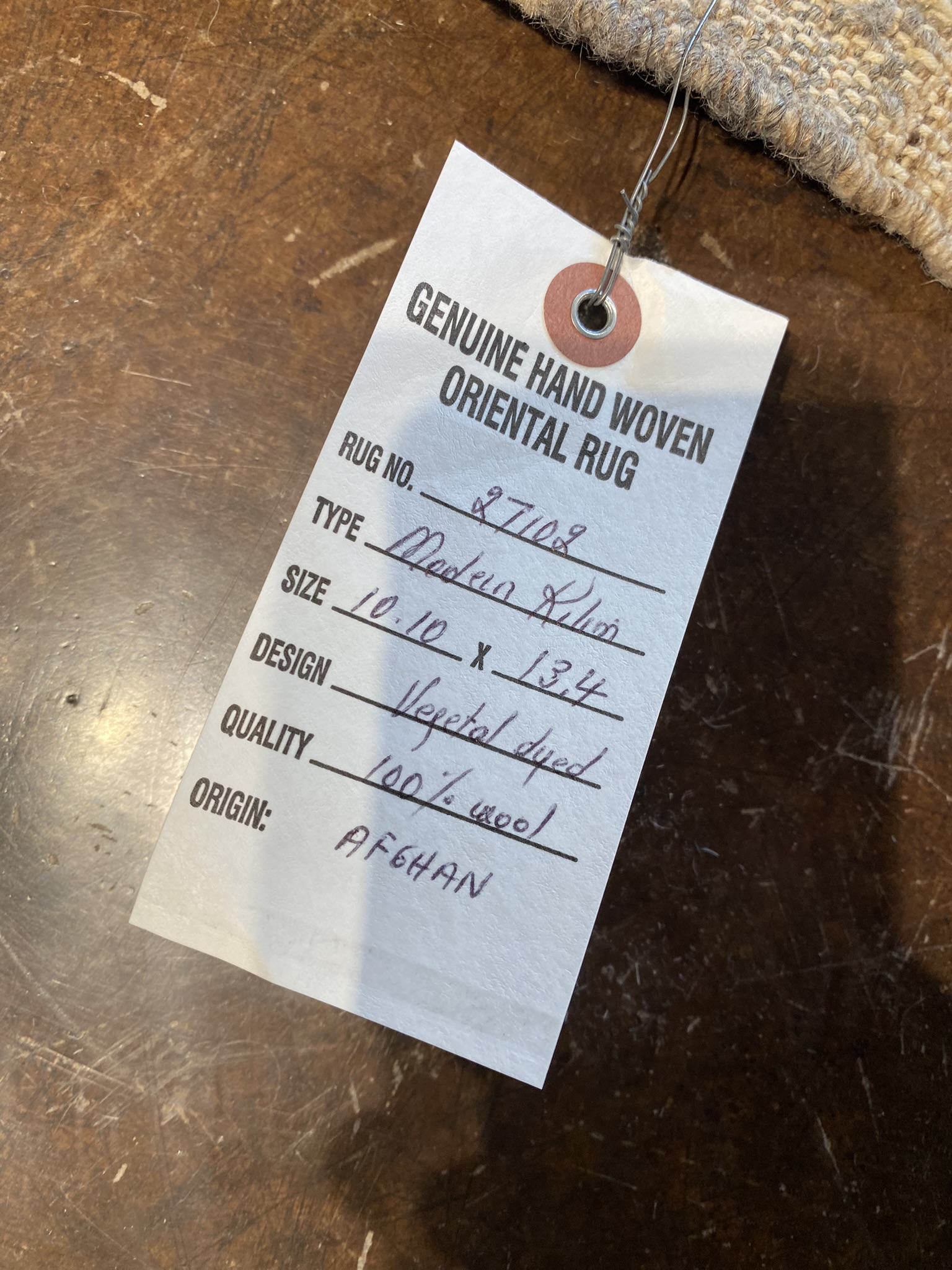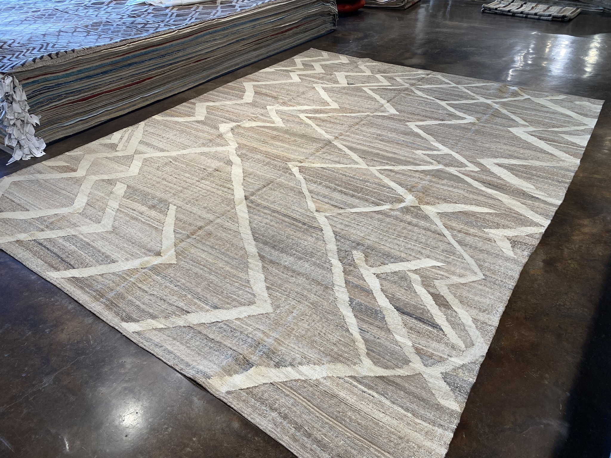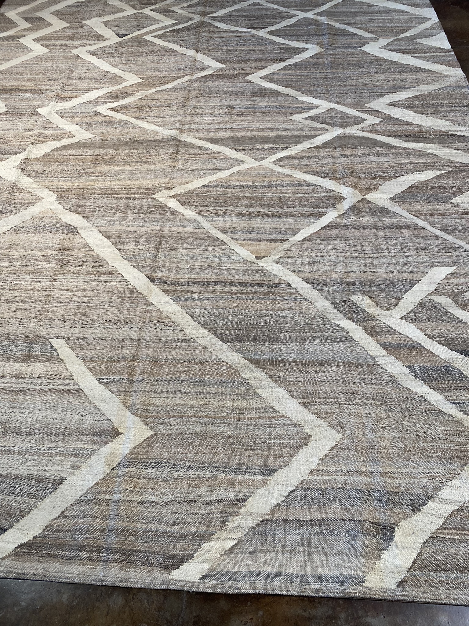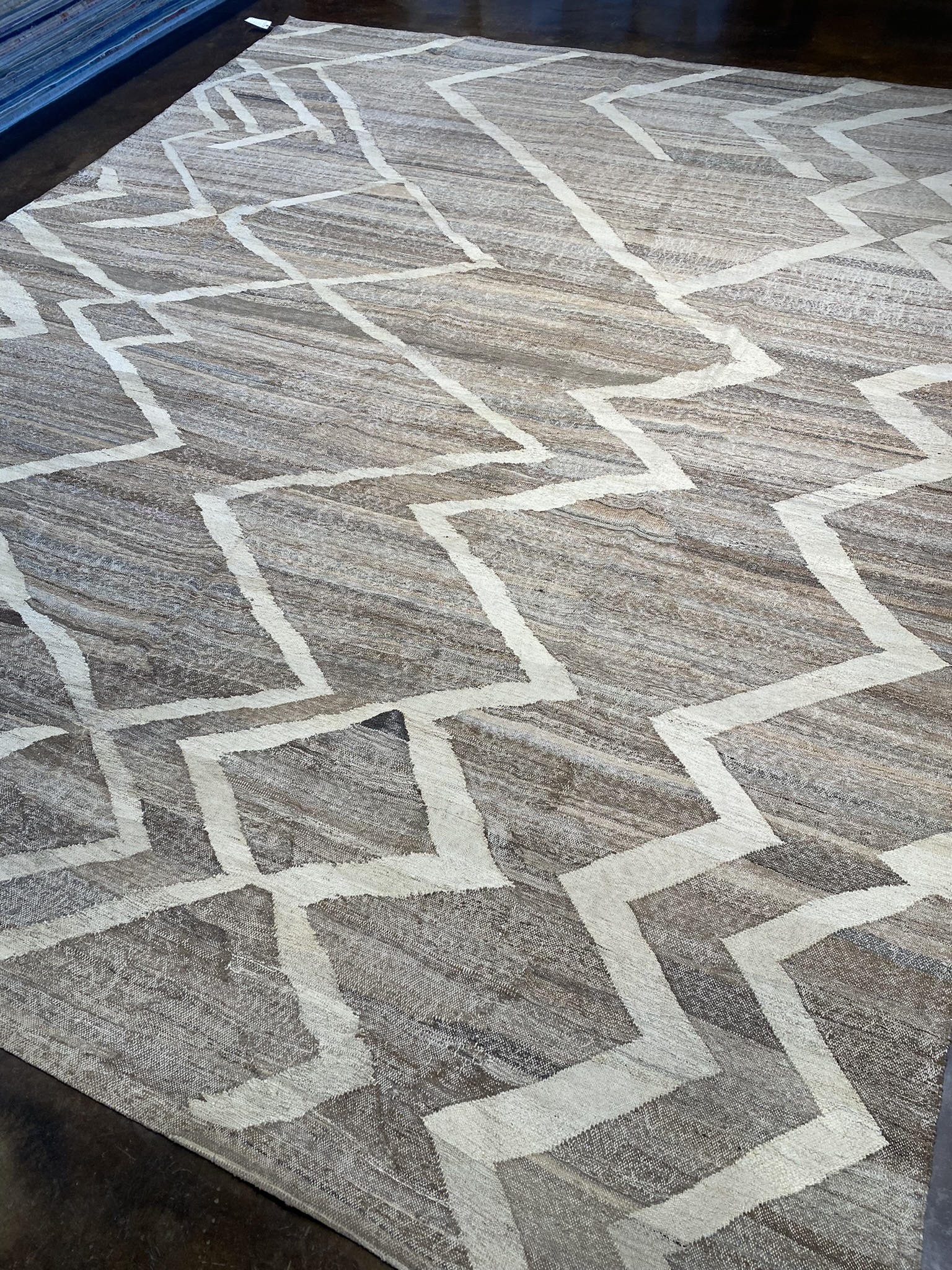 Introduce modern elegance to your space with this stunning new 10’10” x 13’4″ Afghan kilim rug. Crafted with an eclectic, contemporary design, this kilim features a captivating geometric pattern in a sophisticated palette of brown, cream, and ivory hues. The striking zigzag lines create a sense of movement and visual interest, while the neutral colors provide versatility to complement a variety of decor styles. Meticulously handwoven using traditional techniques, this modern kilim showcases the exceptional craftsmanship and rich textile heritage of Afghan artisans. The flat-weave construction lends a sleek, low-profile look that is both durable and easy to maintain. With generous dimensions of approximately 130 inches in length and 160 inches in width, this rug is perfect for anchoring a spacious living room, dining area, or bedroom. The combination of its contemporary aesthetic and time-honored craftsmanship makes this kilim an ideal choice for those seeking to infuse their home with a touch of modern sophistication while appreciating the beauty of handmade textiles. Elevate your interior design with this exquisite modern Afghan kilim, and enjoy its timeless beauty for years to come. Don’t miss the opportunity to own this unique and captivating piece that effortlessly merges traditional techniques with contemporary style.