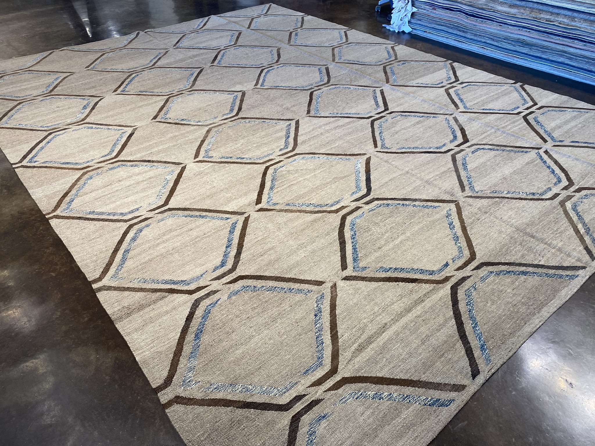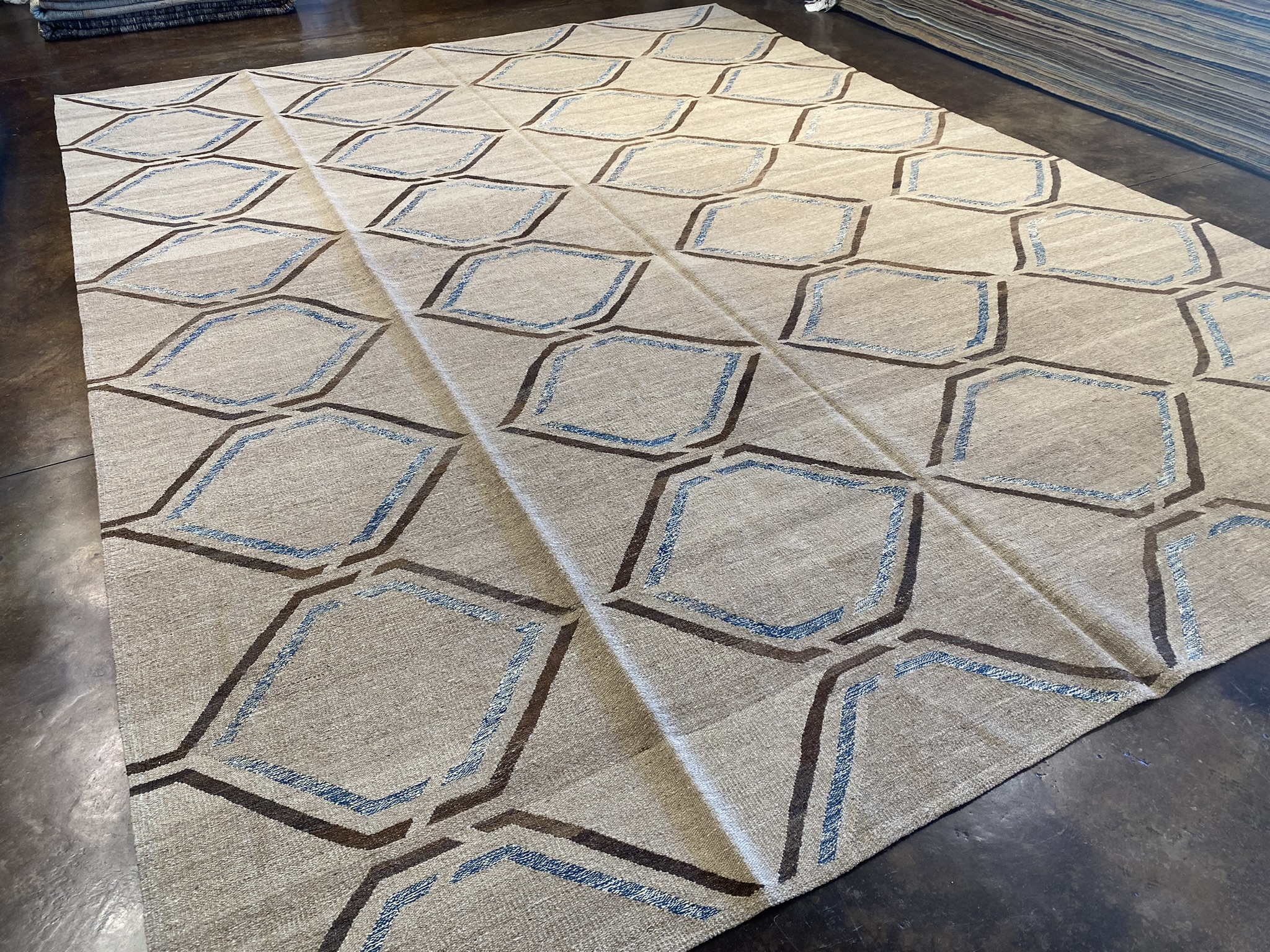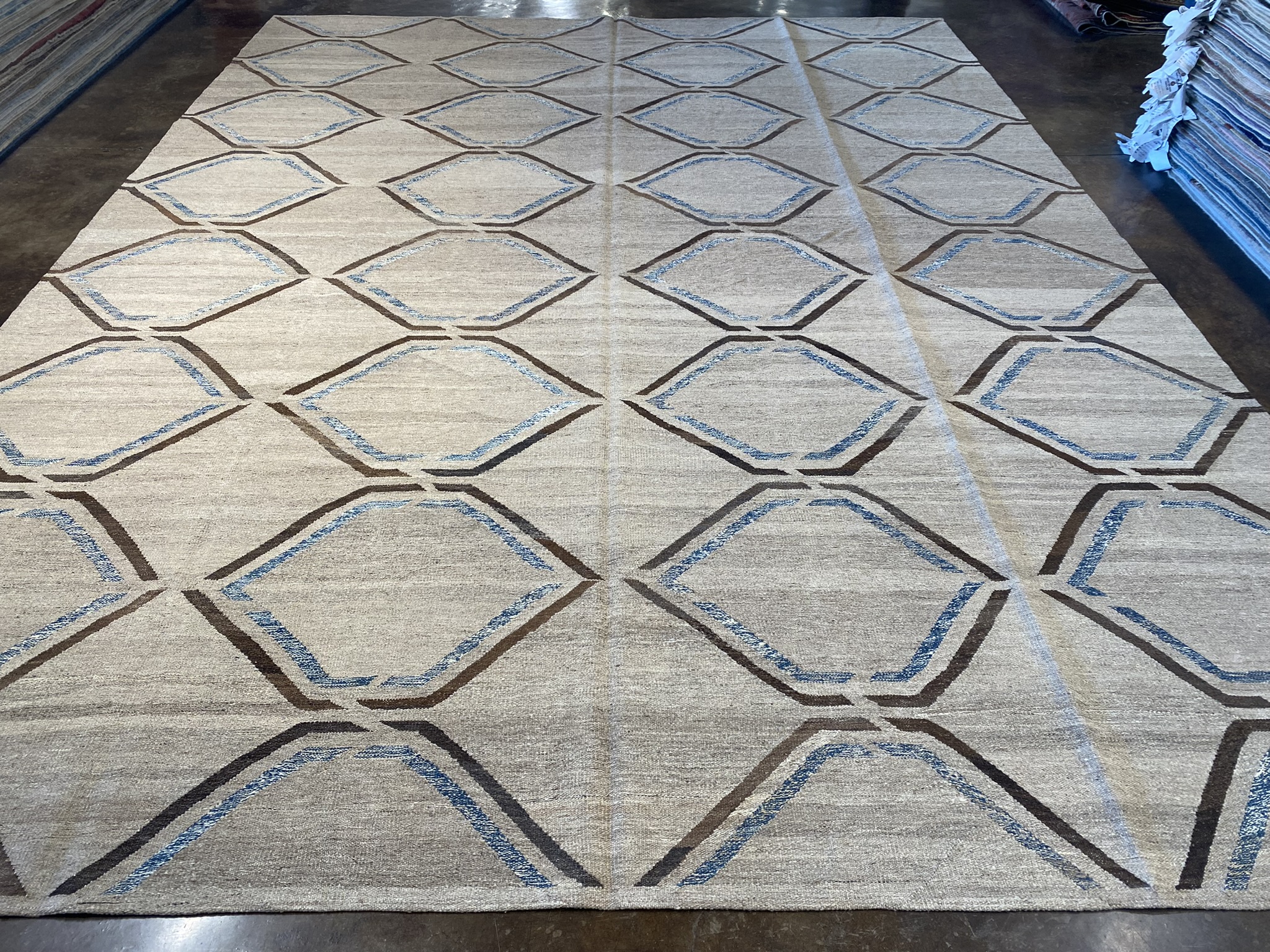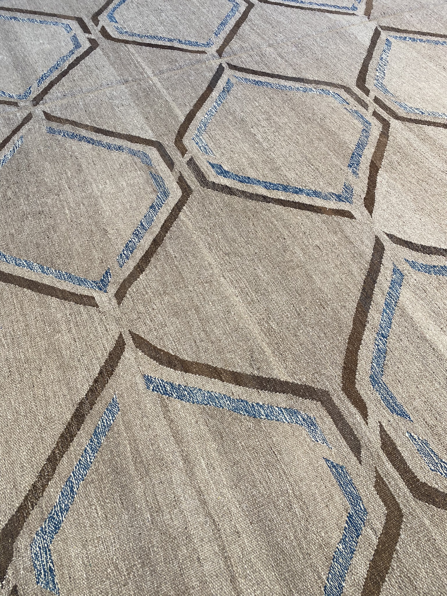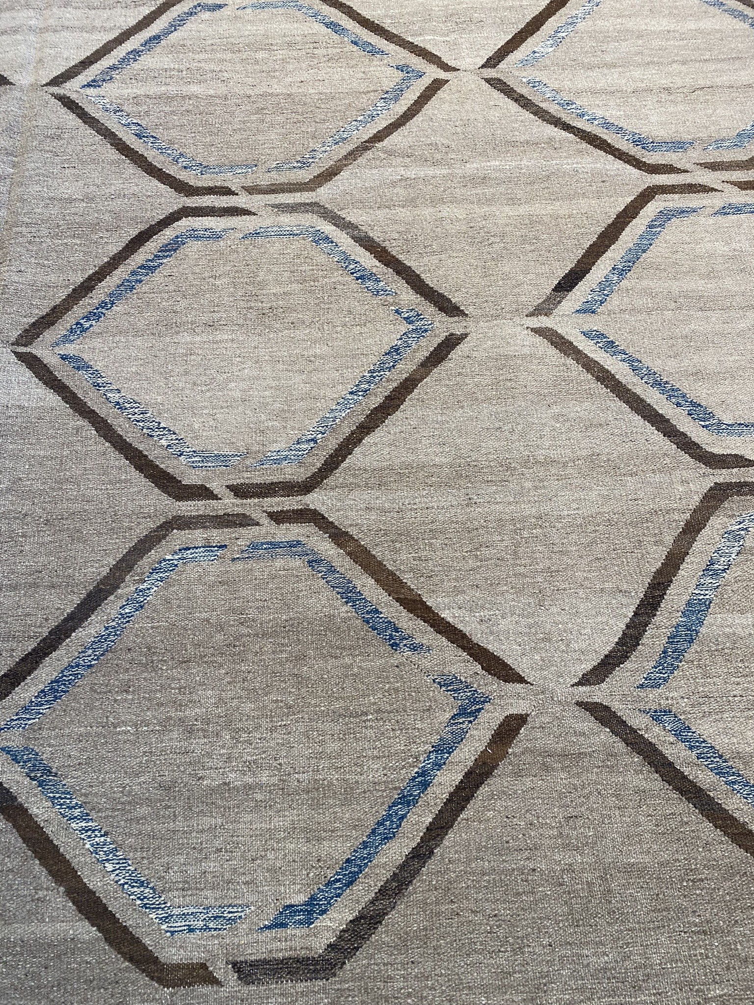Introducing a stunning modern kilim rug that will elevate any contemporary space. Handcrafted in Afghanistan, this brand new 10’4″ x 13’10” kilim showcases a captivating geometric design in shades of blue and brown. The precise diamond motif creates an eye-catching lattice pattern across the natural, undyed wool background. Woven using traditional techniques passed down through generations, this kilim exhibits expert craftsmanship in every detail. The flat-weave construction results in a durable, reversible rug that lays flat and works well in high-traffic areas. The rug’s generous size of approximately 10 x 14 feet provides ample coverage for living rooms, dining areas, or spacious bedrooms. The combination of the intricate modern pattern and versatile color palette ensures this kilim will complement a wide range of decor styles. Experience the timeless elegance and enduring quality of this contemporary Afghan kilim rug. It’s a beautiful and practical choice for adding warmth, texture, and artistic flair to your home.