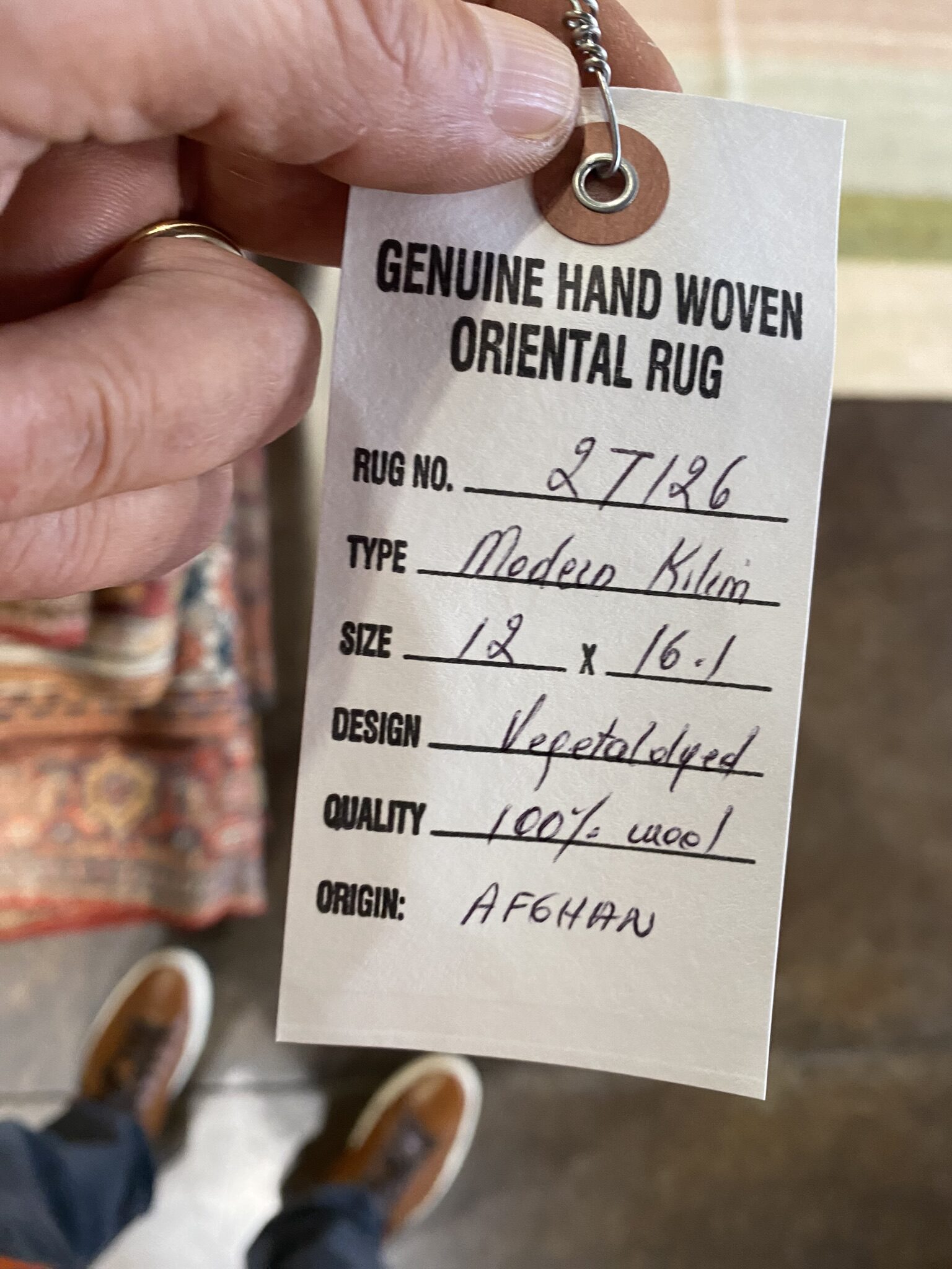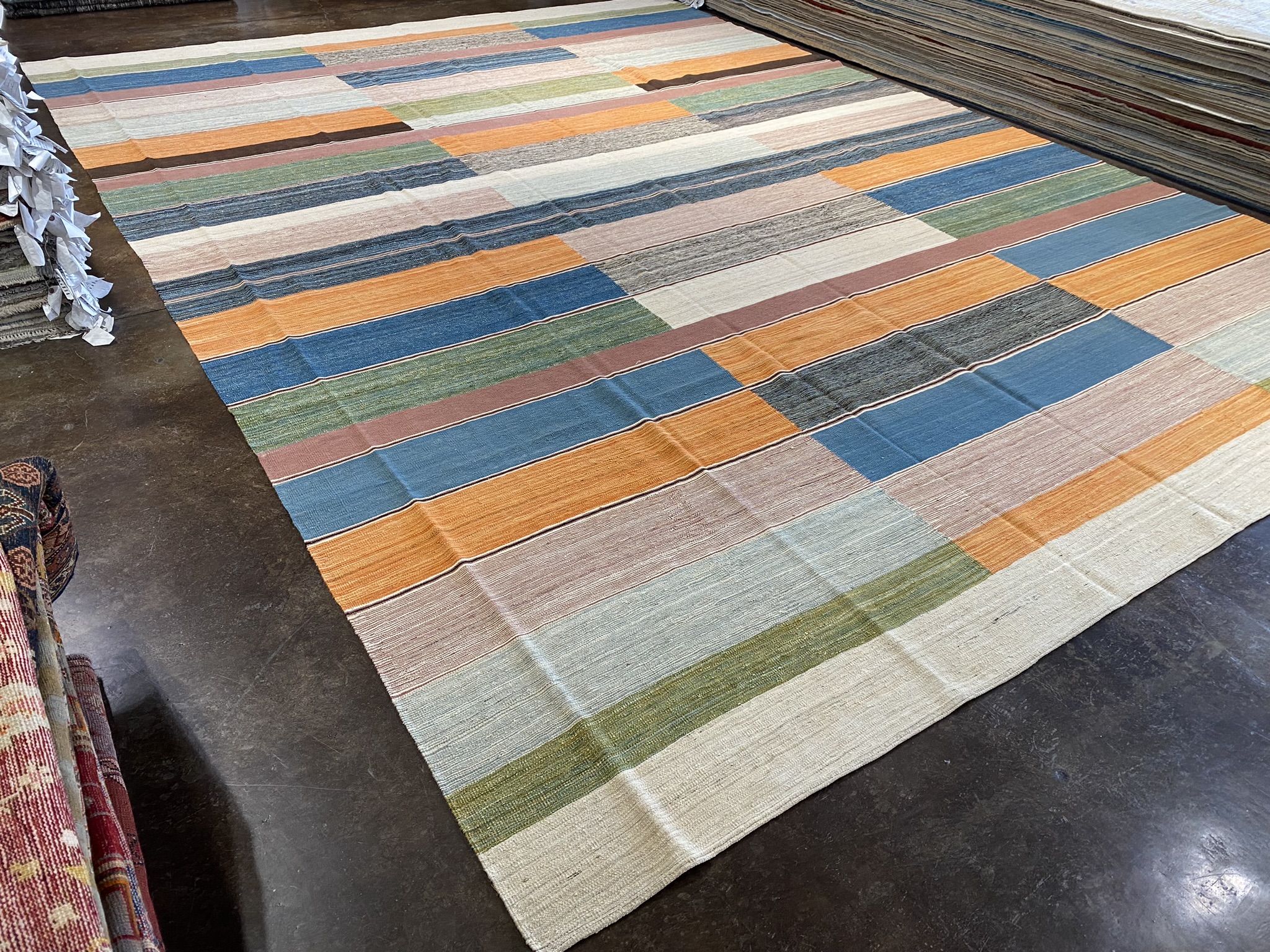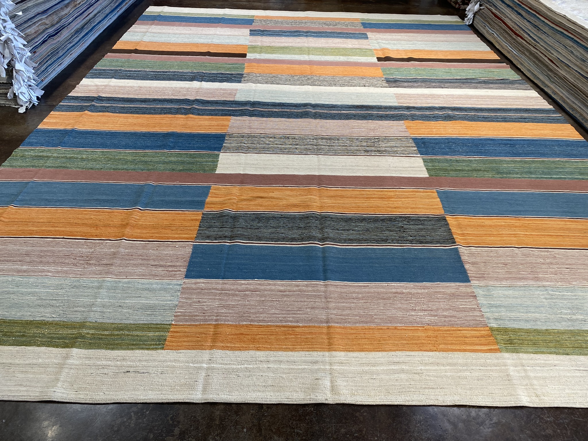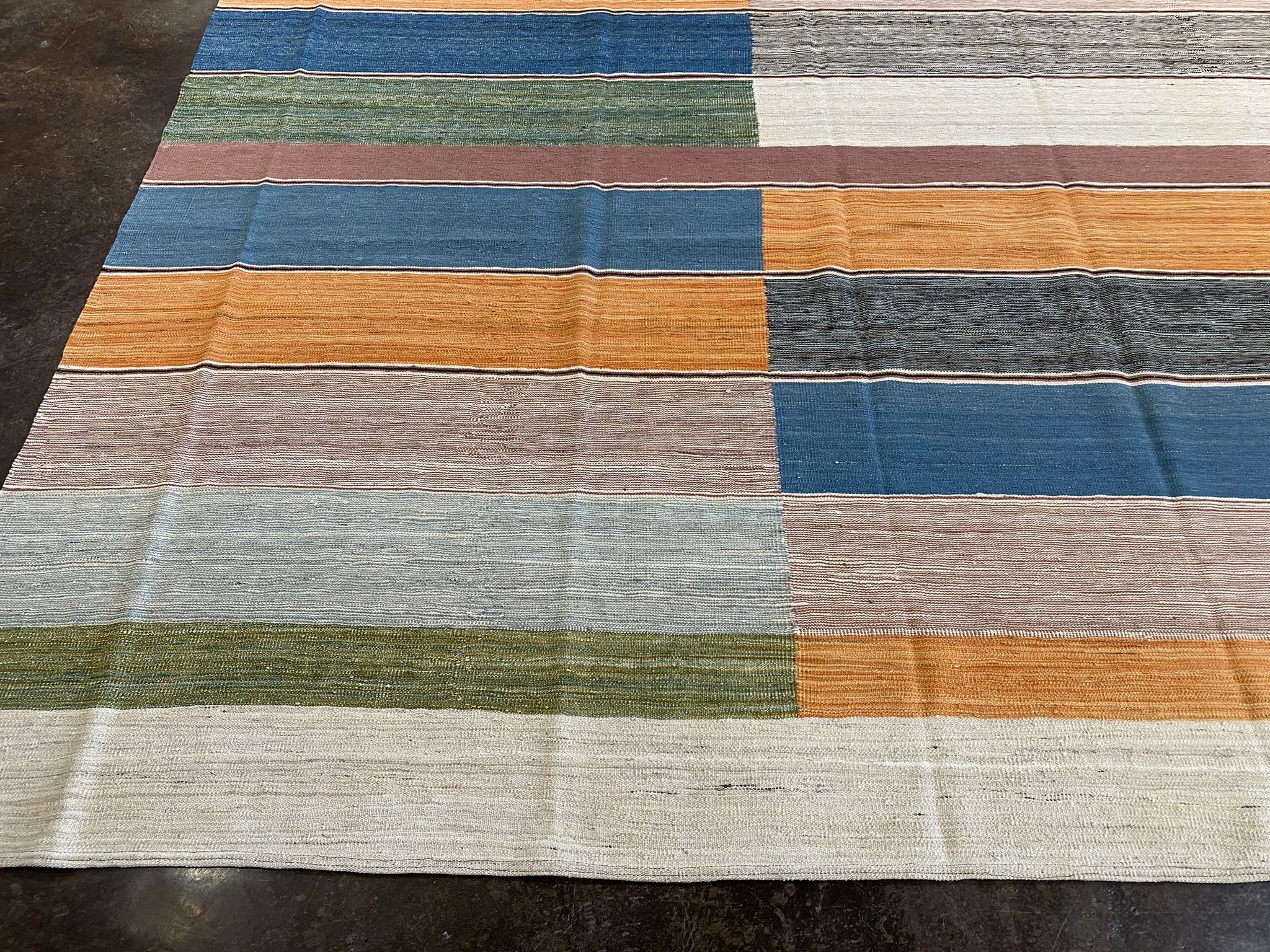 Elevate your space with this stunning modern Afghan kilim rug, measuring an impressive 12′ x 16’1″. Crafted with exquisite attention to detail, this oversized kilim showcases a captivating geometric design that seamlessly blends contemporary and eclectic styles. The vibrant color palette features a harmonious mix of black, brown, cream, green, dark and light blue, and cherry red hues, creating a visually striking and versatile foundation for any room. The precise lines and shapes form an intricate patchwork pattern, adding depth and visual interest to the rug’s surface. Woven from high-quality materials, this kilim offers both durability and comfort underfoot. Its generous size allows it to anchor large living rooms, dining areas, or bedrooms, instantly transforming the ambiance with its bold and modern aesthetic. As a new rug, this Afghan modern kilim promises to retain its vivid colors and structural integrity for years to come, making it a worthwhile investment for design enthusiasts seeking a statement piece that combines traditional craftsmanship with contemporary flair. Elevate your interior design with this exceptional 12′ x 16’1″ modern kilim and enjoy its timeless beauty and unparalleled artistry.