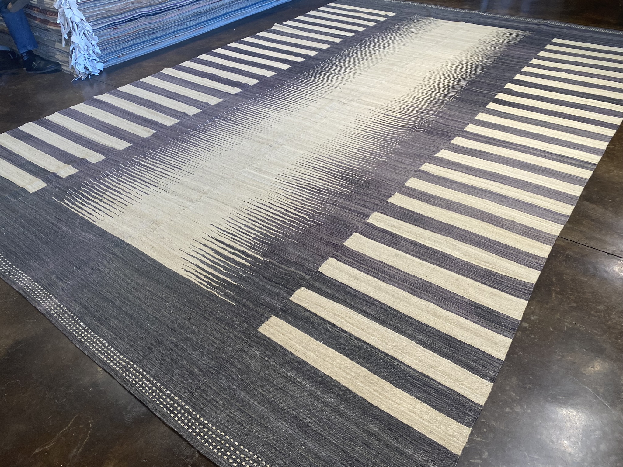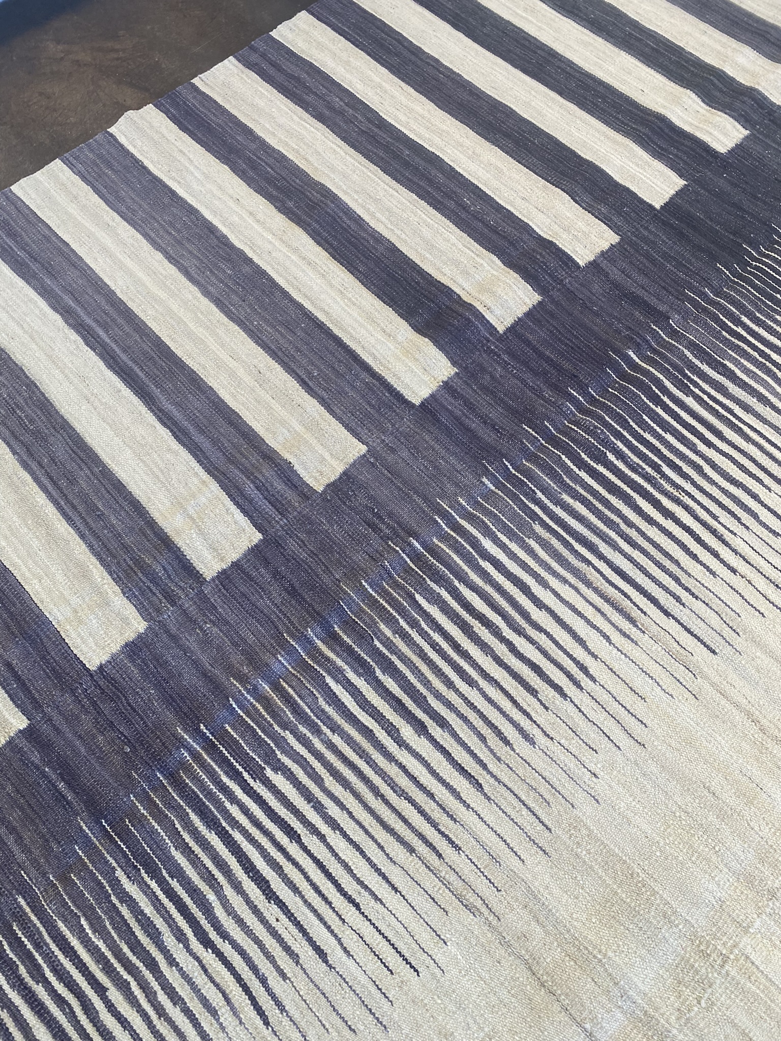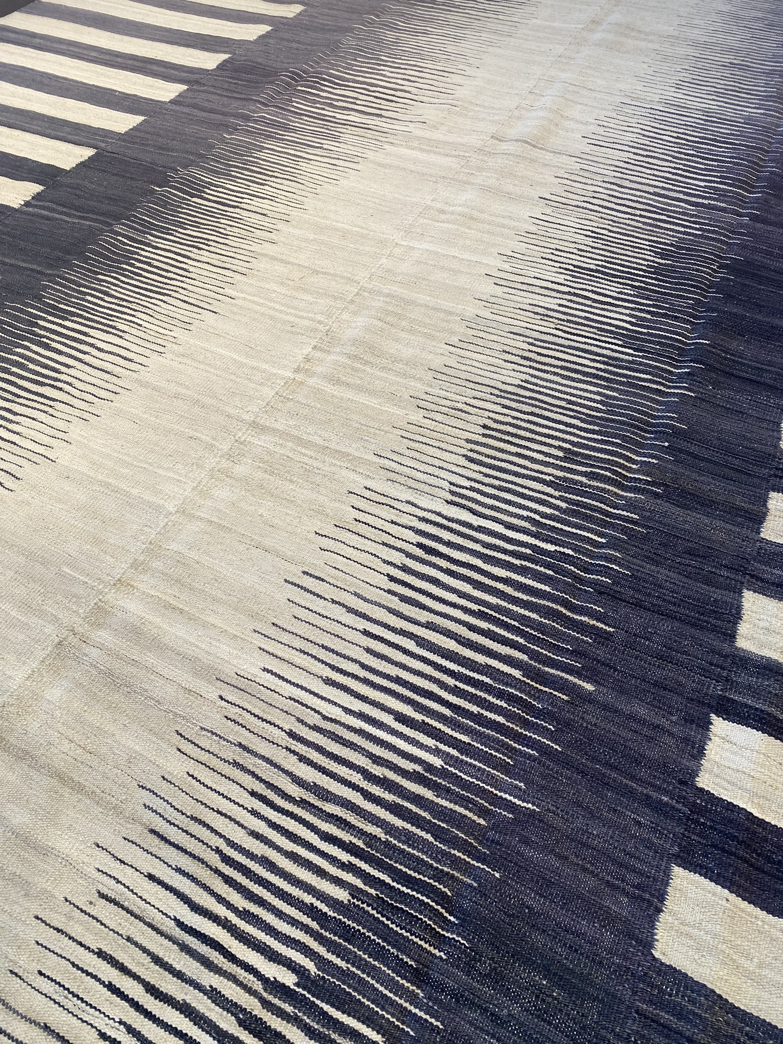 Introduce modern elegance to your space with this stunning contemporary Afghan Kilim rug. Measuring an impressive 9’8″ x 14’6″, this expansive piece features a striking design of black and cream stripes that create a bold, graphic impact. The eclectic pattern combines clean lines with subtle texture, making it a versatile choice for a variety of decor styles from minimalist to bohemian chic. Expertly handcrafted by skilled artisans, this Kilim showcases the rich weaving traditions of Afghanistan. The flat-woven construction lends a unique texture and durability, ensuring this rug will be a cherished addition to your home for years to come. The neutral color palette of deep black and warm cream allows the rug to anchor a room without overwhelming other design elements. It provides the perfect foundation for layering colorful accents or maintaining a sophisticated, understated aesthetic. Elevate your living room, dining area, or bedroom with the timeless appeal of this modern Kilim masterpiece. Its generous size and eye-catching design make it a transformative element in any interior, infusing your space with global flair and artistic allure.