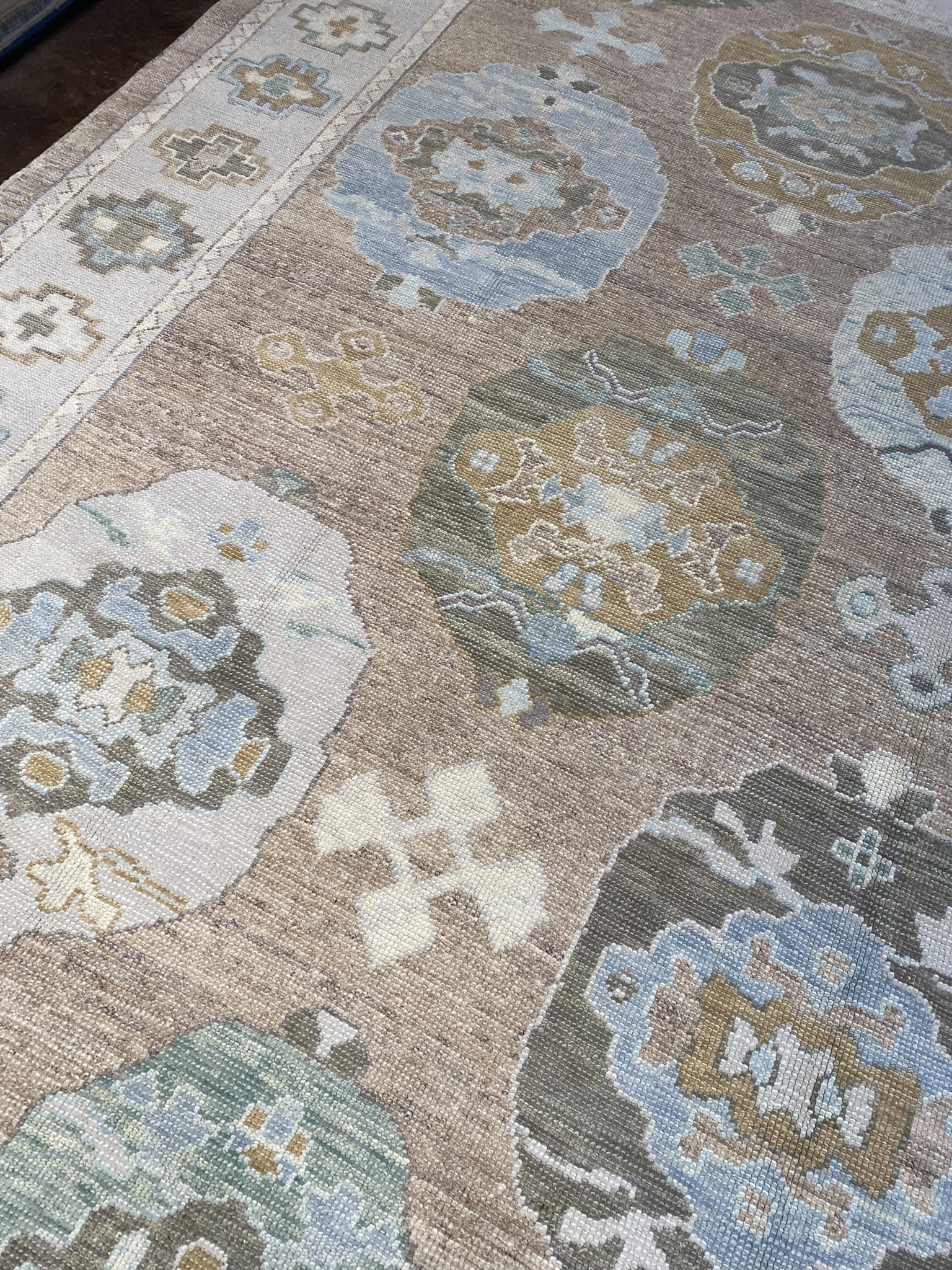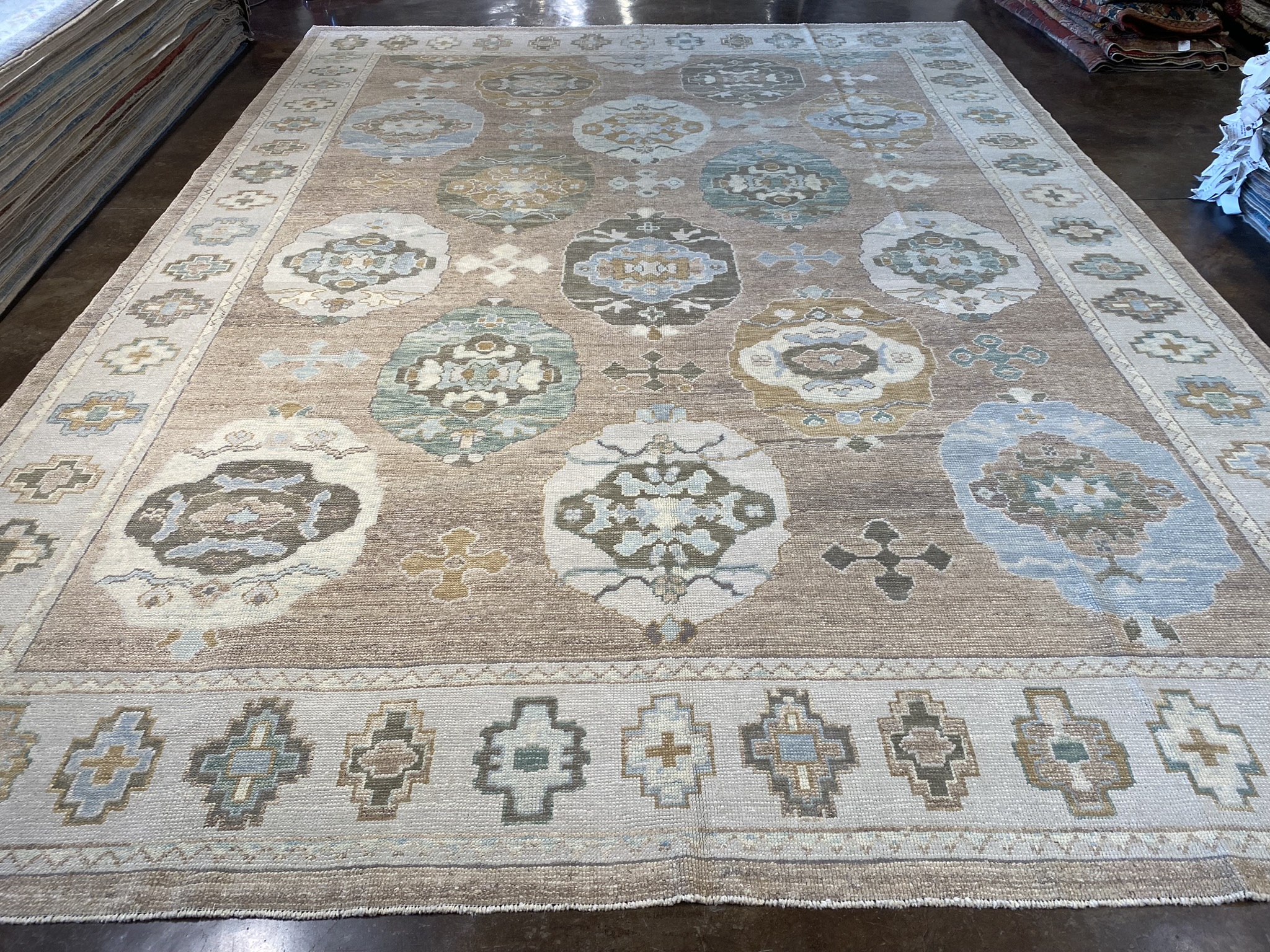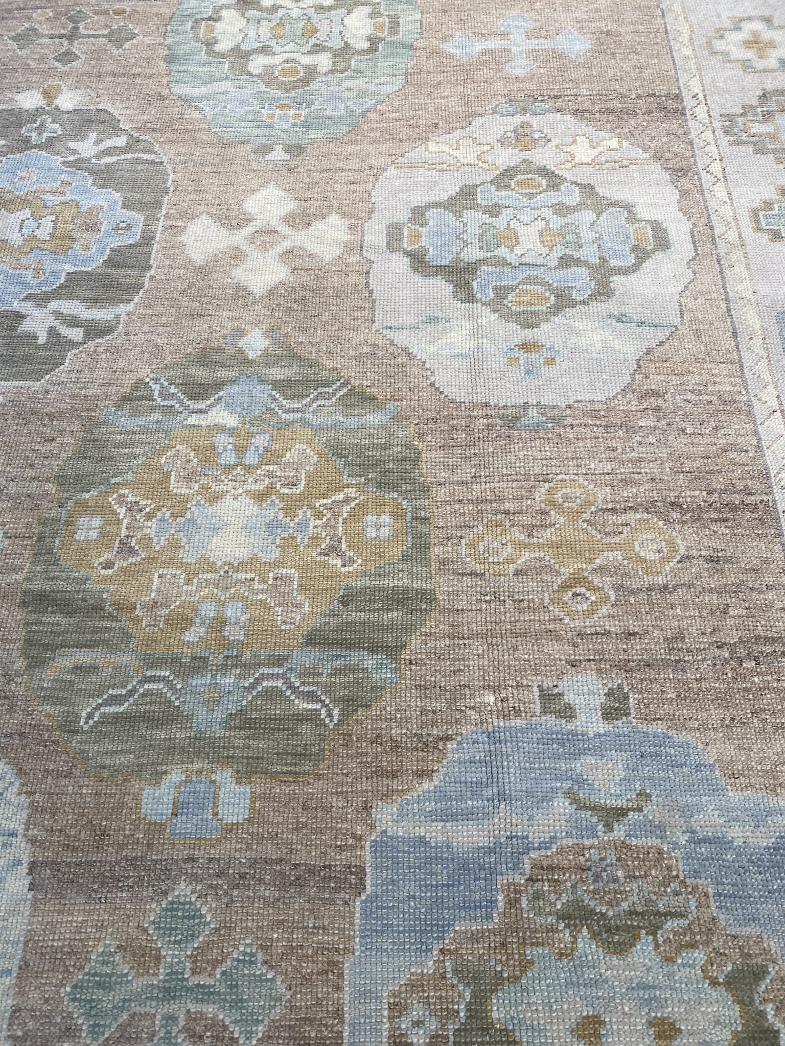 Elevate your space with this stunning modern Oushak rug, masterfully crafted in Turkey. Measuring an impressive 11′ x 15’1″ (132″ x 181″), this oversize piece is the perfect statement for larger rooms. The elegant design showcases a captivating array of geometric and transitional motifs in a soothing palette of brown, camel, cream, green, and light blue hues. As you step onto this luxurious rug, you’ll be enchanted by the intricate details and expert craftsmanship. The plush pile offers a sumptuous feel underfoot, while the durable construction ensures long-lasting beauty. The central medallion draws the eye and anchors the space, with surrounding patterns creating a mesmerizing visual journey. Versatile in style, this modern Oushak rug effortlessly complements a wide range of decor aesthetics, from traditional to contemporary. Its neutral color scheme allows for easy integration into existing furnishings, while the subtle pops of color add depth and interest. As a brand new addition to our collection, this rug is ready to transform your home with its timeless elegance and unparalleled quality. Embrace the artistry and heritage of Turkish rug-making with this extraordinary piece, and create a space that reflects your discerning taste and style.