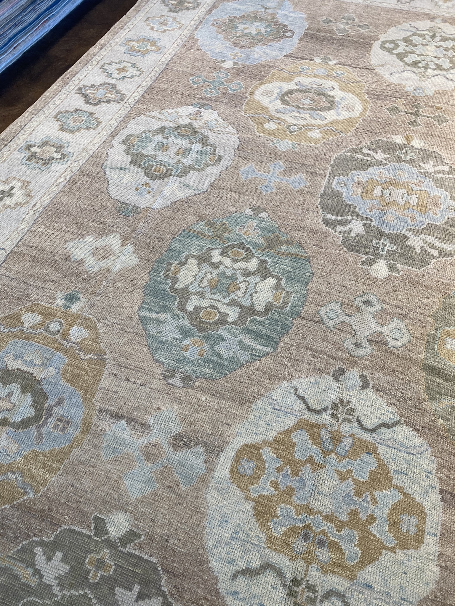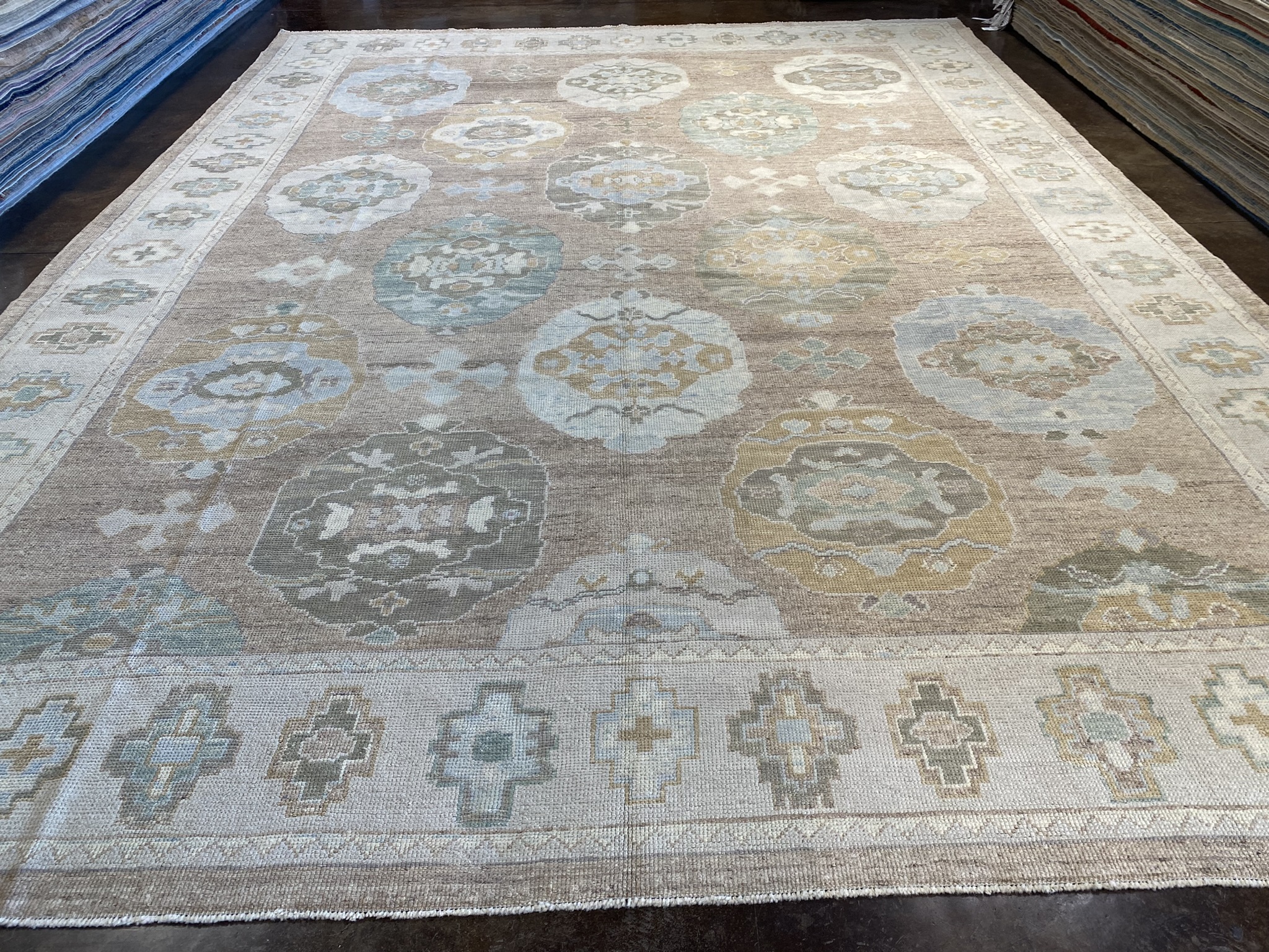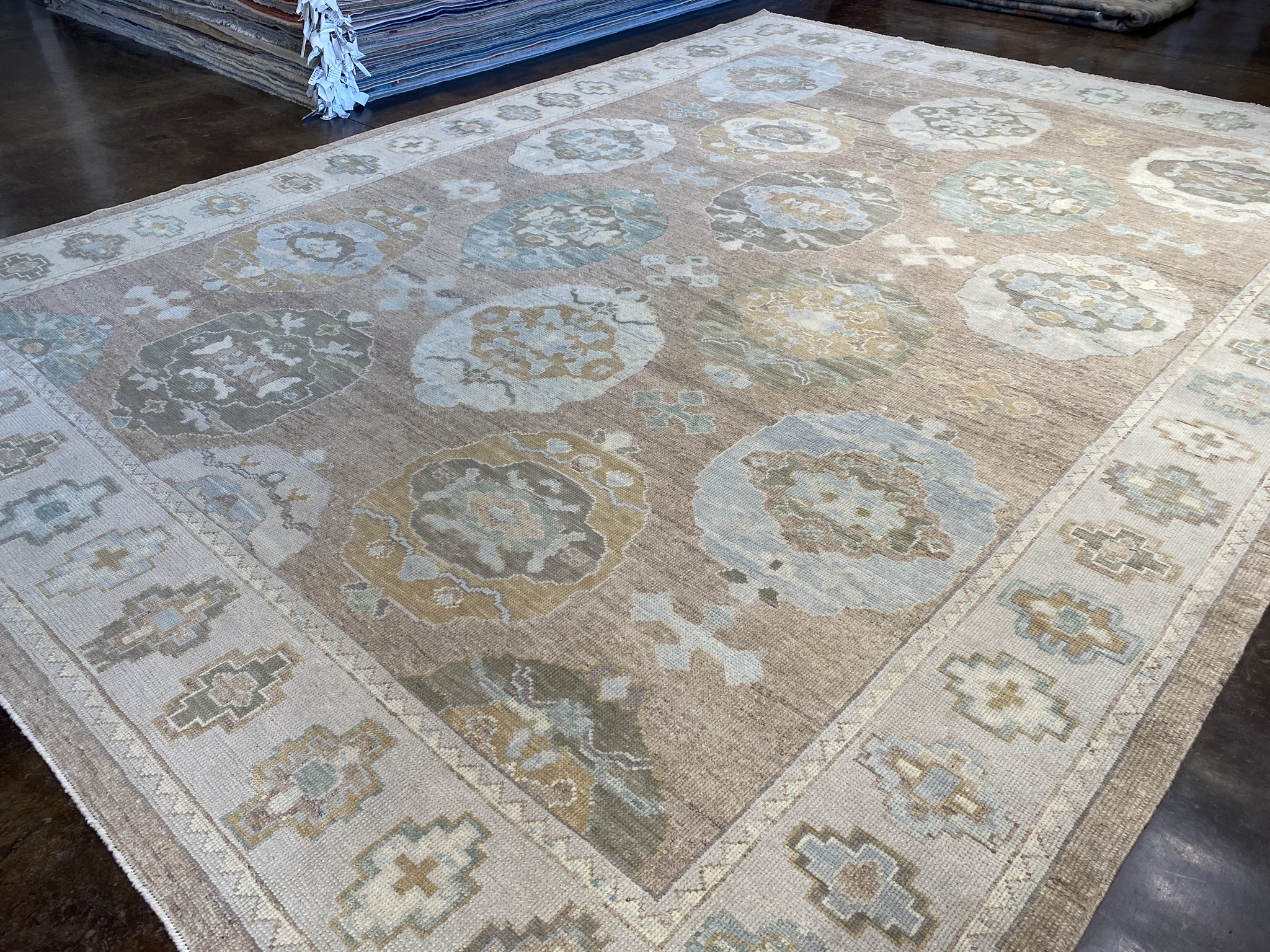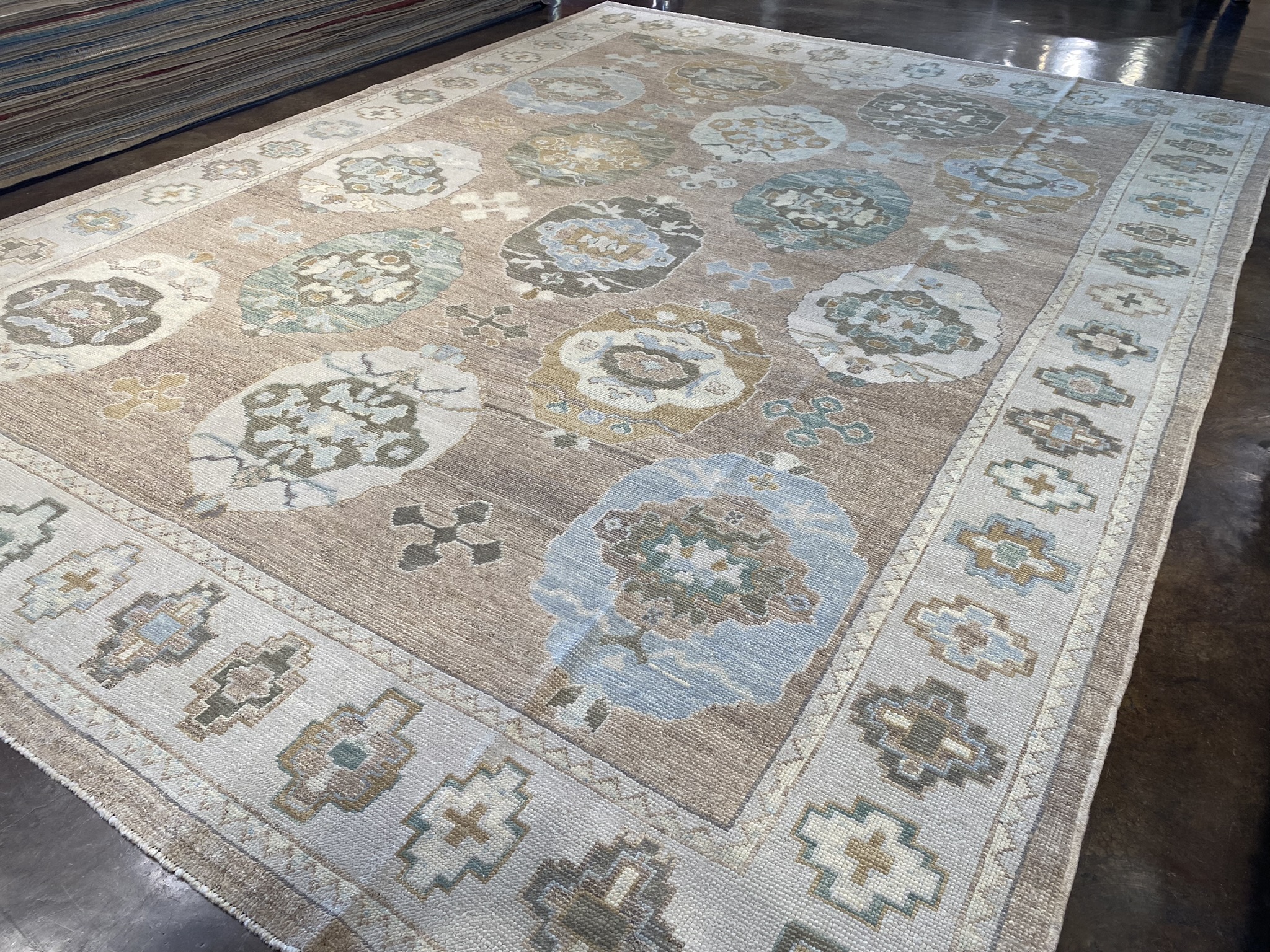 Elevate your space with this stunning modern Oushak rug, masterfully crafted in Turkey. Measuring an impressive 11′ x 15’1″ (132″ x 181″), this oversize piece is the perfect statement for larger rooms. The elegant design showcases a captivating array of geometric and transitional motifs in a soothing palette of brown, camel, cream, green, and light blue hues. As you step onto this luxurious rug, you’ll be enchanted by the intricate details and expert craftsmanship. The plush pile offers a sumptuous feel underfoot, while the durable construction ensures long-lasting beauty. The central medallion draws the eye and anchors the space, with surrounding patterns creating a mesmerizing visual journey. Versatile in style, this modern Oushak rug effortlessly complements a wide range of decor aesthetics, from traditional to contemporary. Its neutral color scheme allows for easy integration into existing furnishings, while the subtle pops of color add depth and interest. As a brand new addition to our collection, this rug is ready to transform your home with its timeless elegance and unparalleled quality. Embrace the artistry and heritage of Turkish rug-making with this extraordinary piece, and create a space that reflects your discerning taste and style.