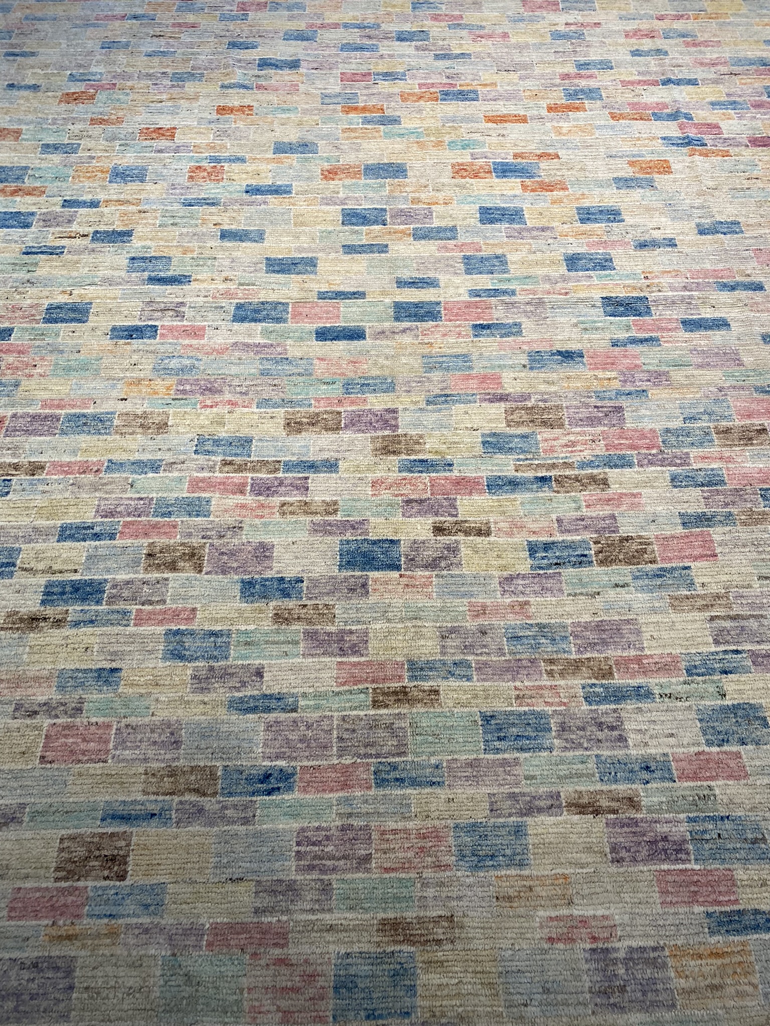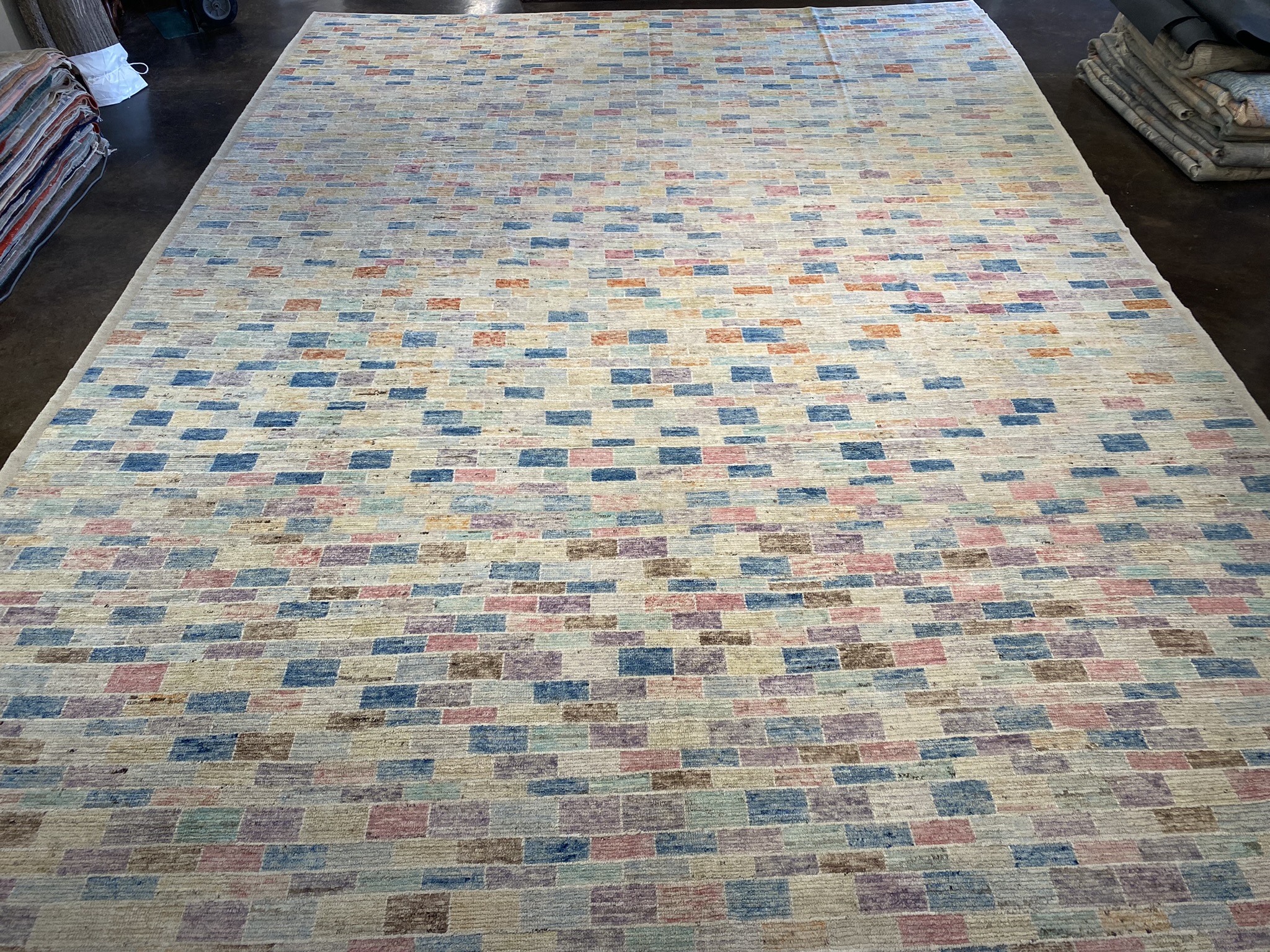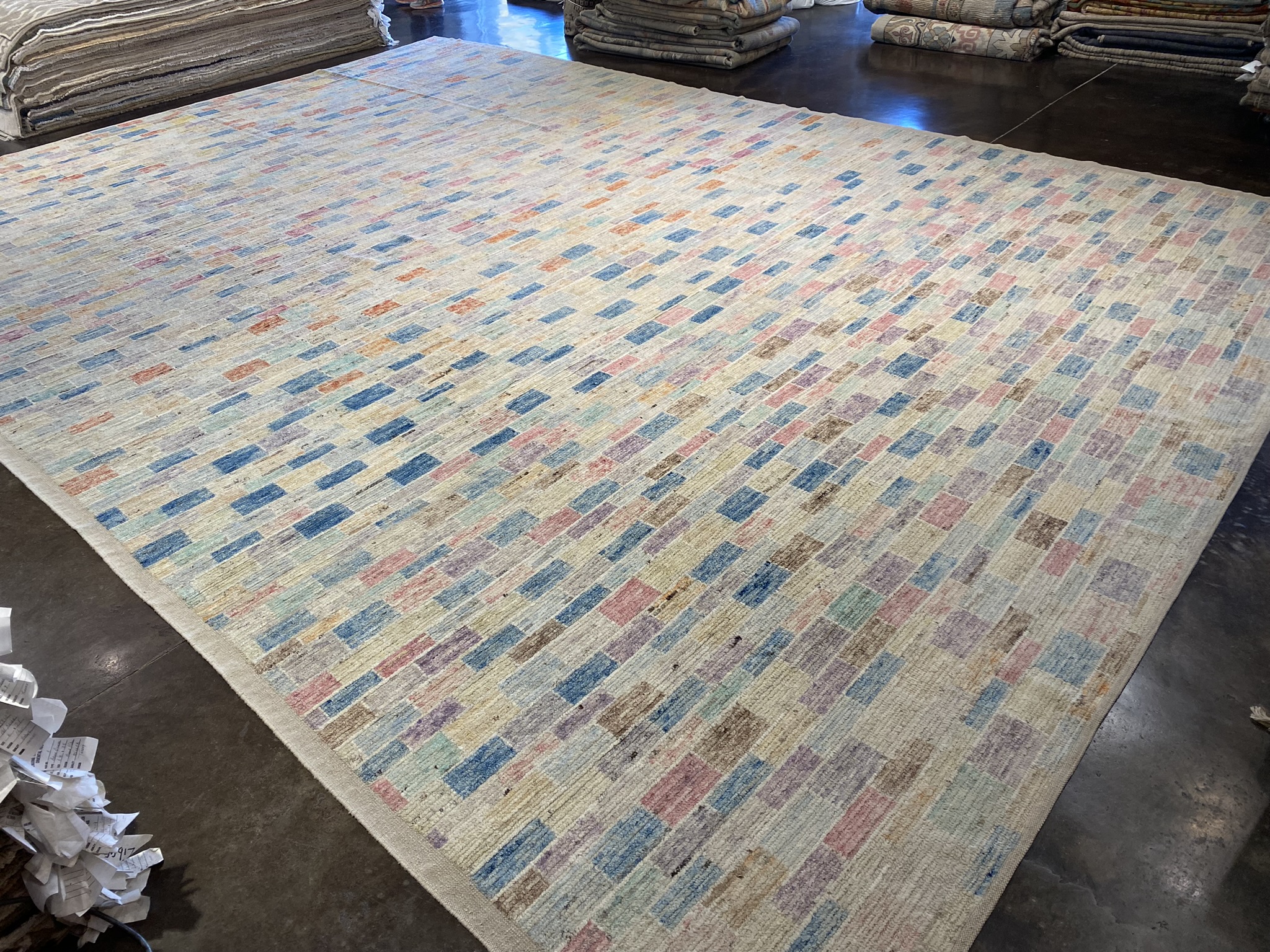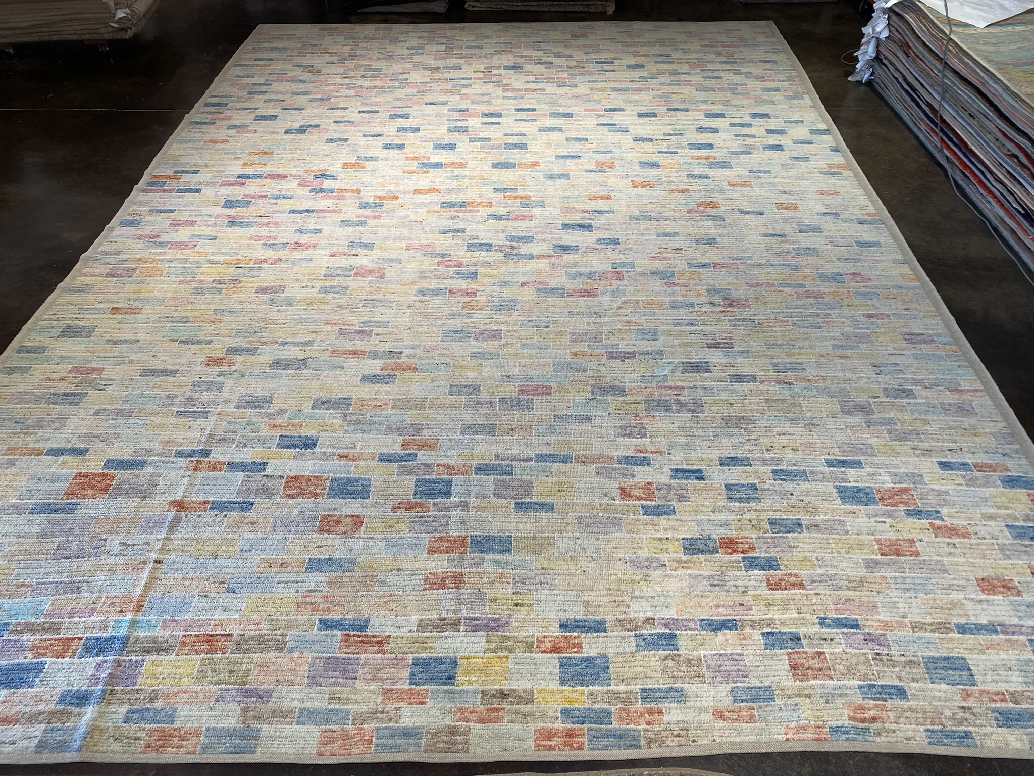 Discover the captivating allure of this Mongolian Collection palace-sized rug, a stunning Afghan masterpiece that measures an impressive 13’8″ x 19’3″. This newly crafted, modern rug showcases an eclectic geometric design that effortlessly blends contemporary style with traditional artistry. The mesmerizing pattern features a mosaic of vibrant colors, including shades of blue, brown, cream, red, orange, purple, and pink. These hues intertwine harmoniously, creating a visually striking and dynamic composition that is sure to become the focal point of any room. Expertly handwoven using time-honored techniques, this Mongolian rug exudes exceptional quality and craftsmanship. The intricate details and precise lines of the geometric motifs are a testament to the skill and dedication of the Afghan artisans who created this extraordinary piece. With its generous dimensions, this rug is perfect for anchoring large living spaces, dining areas, or bedrooms, infusing them with a sense of warmth, texture, and visual interest. The versatile colorway allows for easy integration into a wide range of design aesthetics, from bohemian and eclectic to modern and contemporary. Experience the luxury and sophistication of this Mongolian Collection rug, a true work of art that will elevate the ambiance of your home while telling a rich story of cultural heritage and exquisite craftsmanship. Don’t miss the opportunity to own this one-of-a-kind Afghan masterpiece that seamlessly combines timeless beauty with contemporary appeal.