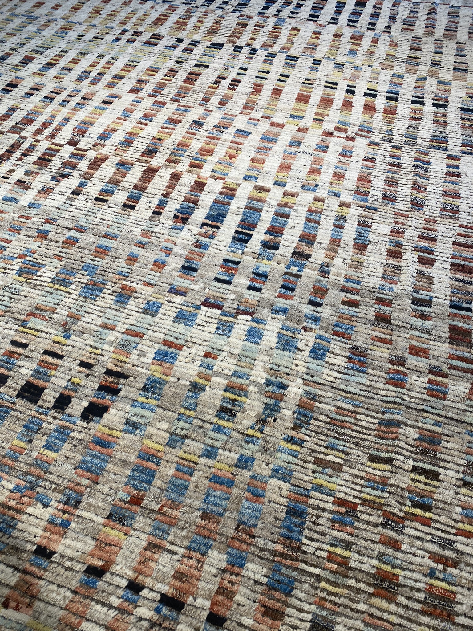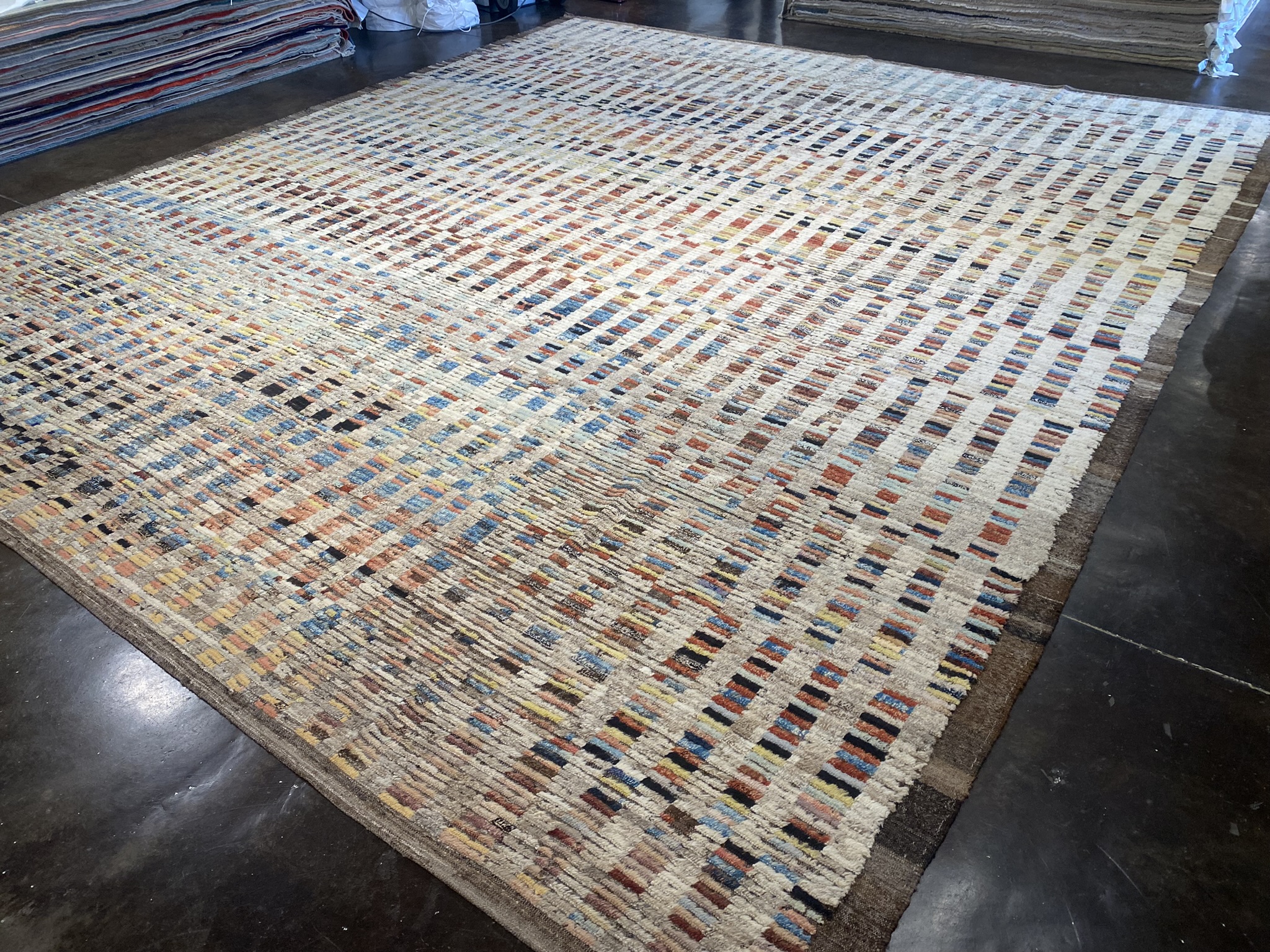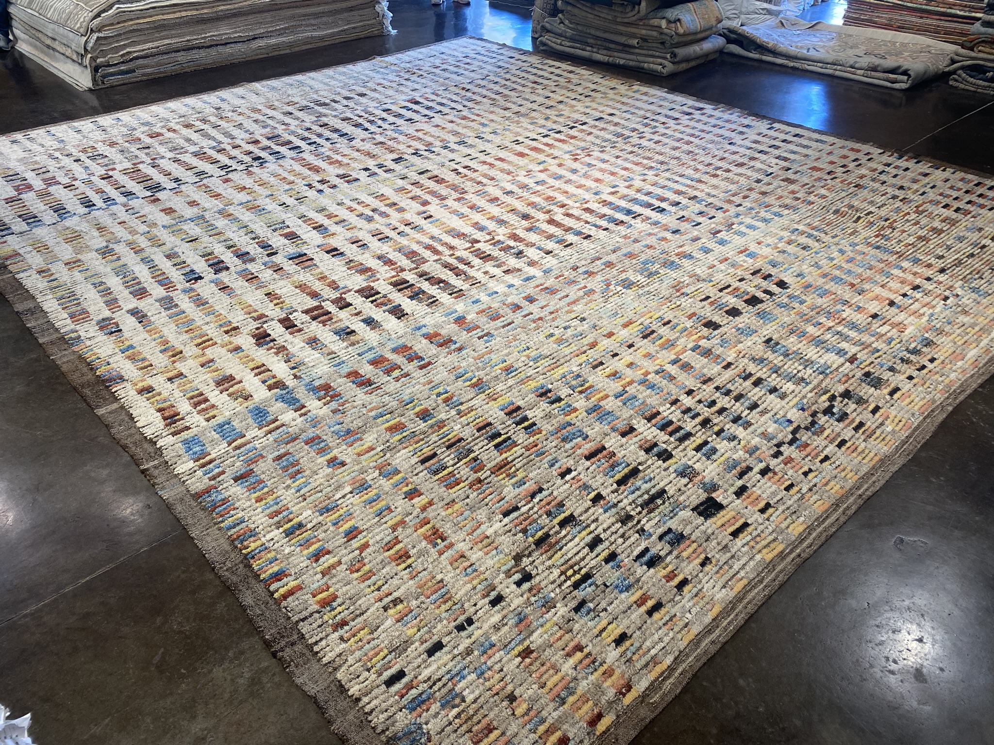 Introduce eclectic flair to your contemporary or modern decor with this stunning oversized Mongolian area rug from the Afghan Collection. Measuring an impressive 14’2″ x 16’6″, this brand new rug boasts a captivating patchwork design that unites an array of earth tones and vibrant hues. Shades of black, brown, cream, red, royal blue and yellow intermingle in an intricately woven grid pattern, showcasing the artisan craftsmanship. The diverse color palette allows this versatile piece to complement a wide range of design aesthetics while serving as a striking focal point. Meticulously hand-knotted using time-honored techniques, this wool rug offers exceptional durability to withstand the heavy foot traffic of busy households. The dense, plush pile adds welcome warmth and comfort underfoot. Whether gracing an expansive living room, anchoring an open concept dining area, or defining a spacious master suite, this charismatic Mongolian rug is sure to elevate any space with its eclectic charm and impeccable quality. Embrace the opulent dimensions and kaleidoscopic beauty of this one-of-a-kind masterpiece.