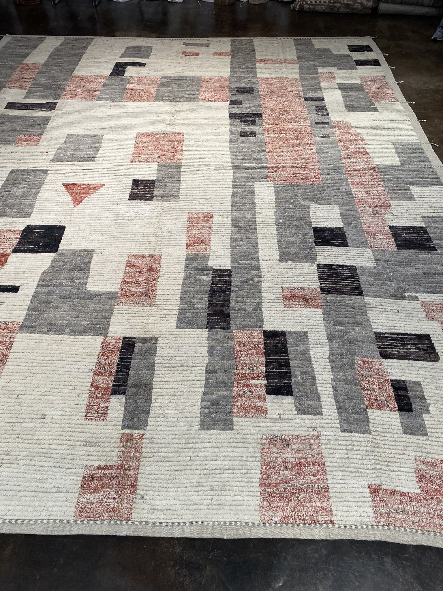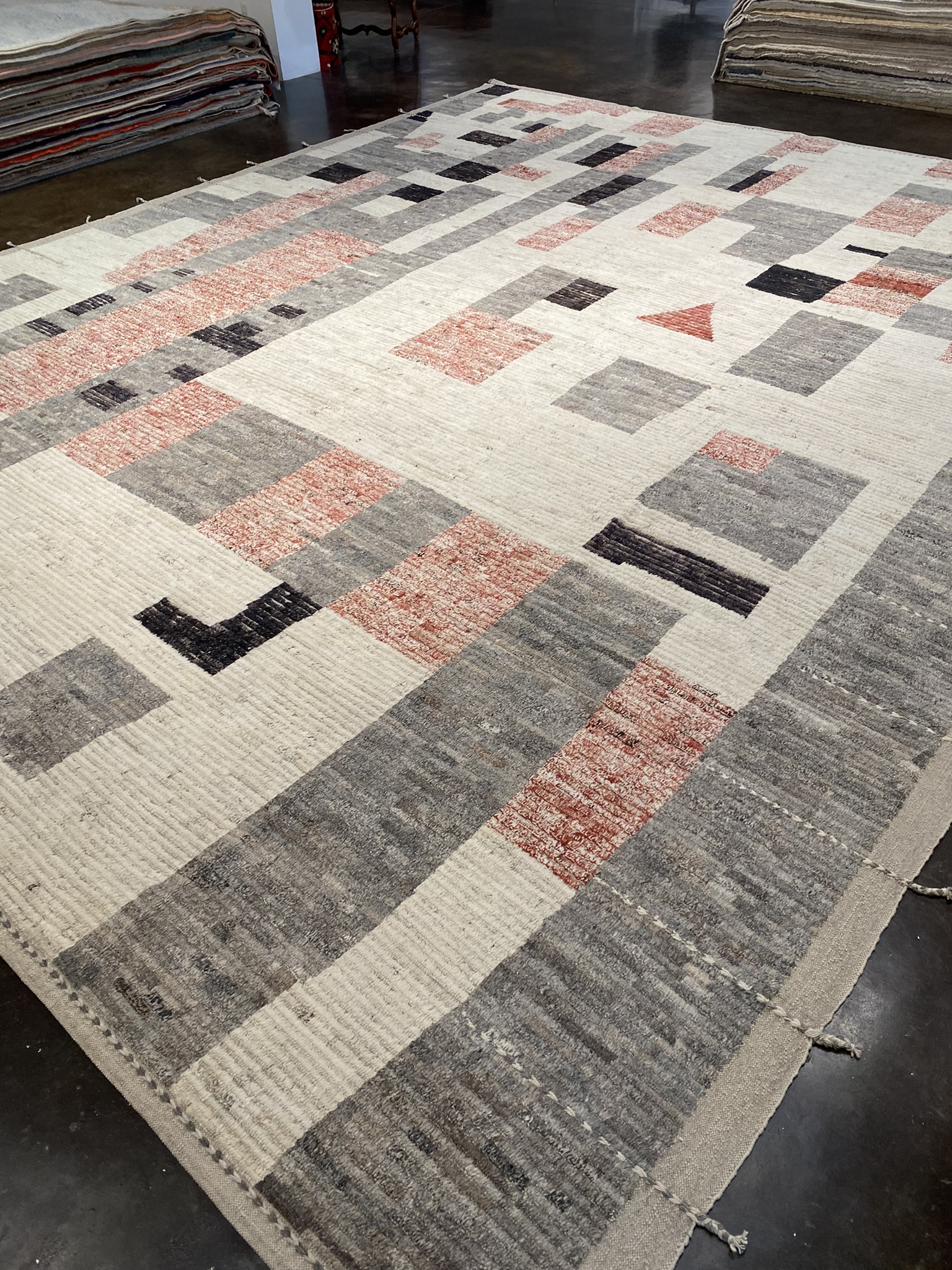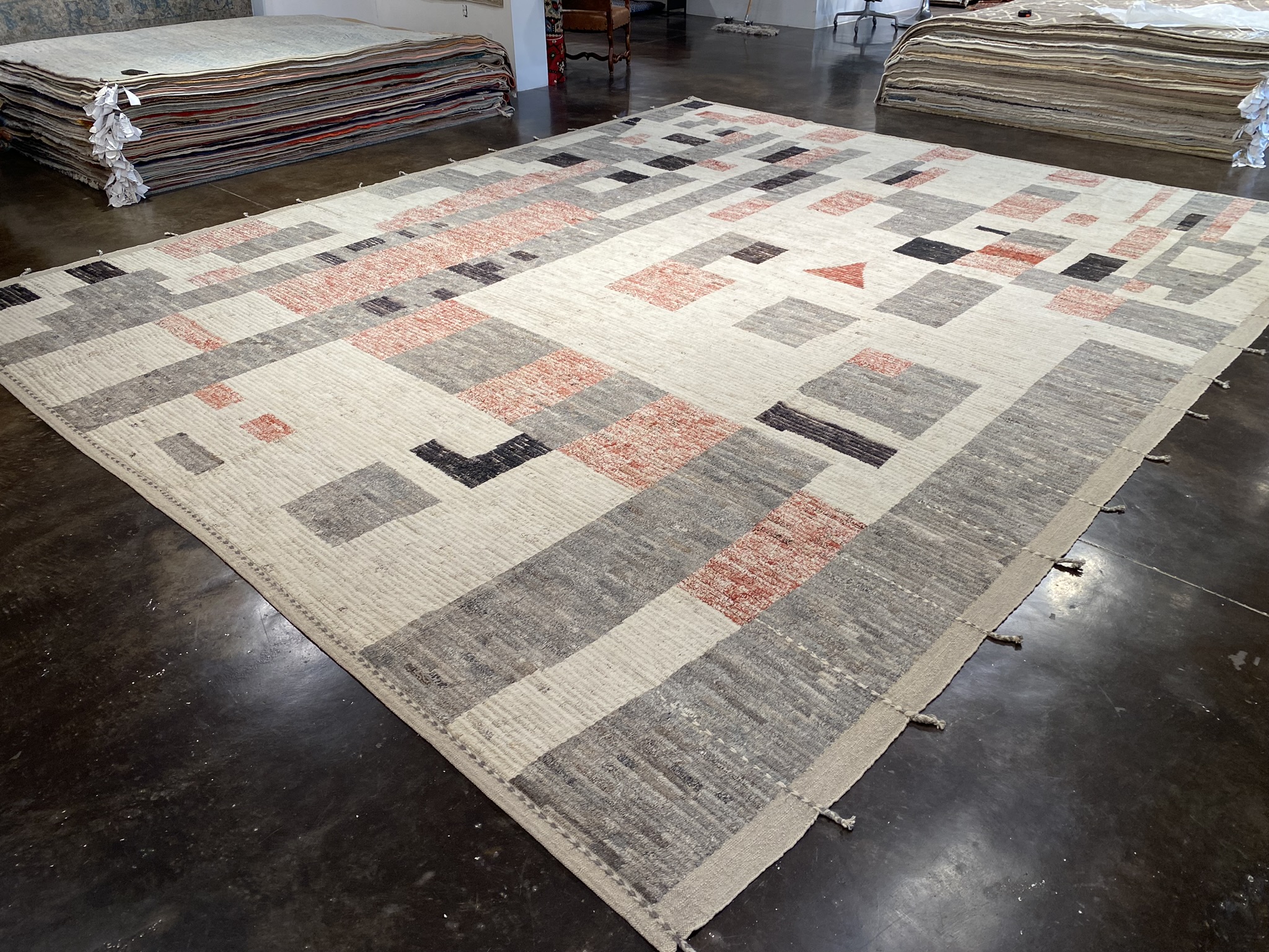 Introducing the stunning Mongolian Collection 14’7″ x 17’7″ area rug, a true masterpiece that perfectly blends contemporary style with traditional Afghan craftsmanship. This oversize rug, measuring an impressive 175 inches in length and 211 inches in width, is a testament to the artistry and skill of the weavers who created it. Crafted with an eclectic, modern design, this rug features a captivating geometric pattern in a striking palette of black, cream, and vibrant red hues. The intricate arrangement of rectangles and squares creates a mesmerizing visual rhythm that draws the eye and adds depth to the overall composition. The rug’s plush pile, made from high-quality materials, offers a luxurious texture that invites you to sink your toes into its softness. The attention to detail and expert craftsmanship ensure that this piece will withstand the test of time, maintaining its beauty and durability for years to come. Whether you’re looking to make a bold statement in your living room, dining area, or bedroom, this Mongolian Collection rug is the perfect choice. Its generous size allows it to anchor large spaces, while its striking design adds a touch of sophistication and character to any interior. Embrace the timeless elegance and unparalleled quality of this Afghan-made masterpiece, and elevate your home decor to new heights with the Mongolian Collection 14’7″ x 17’7″ area rug.