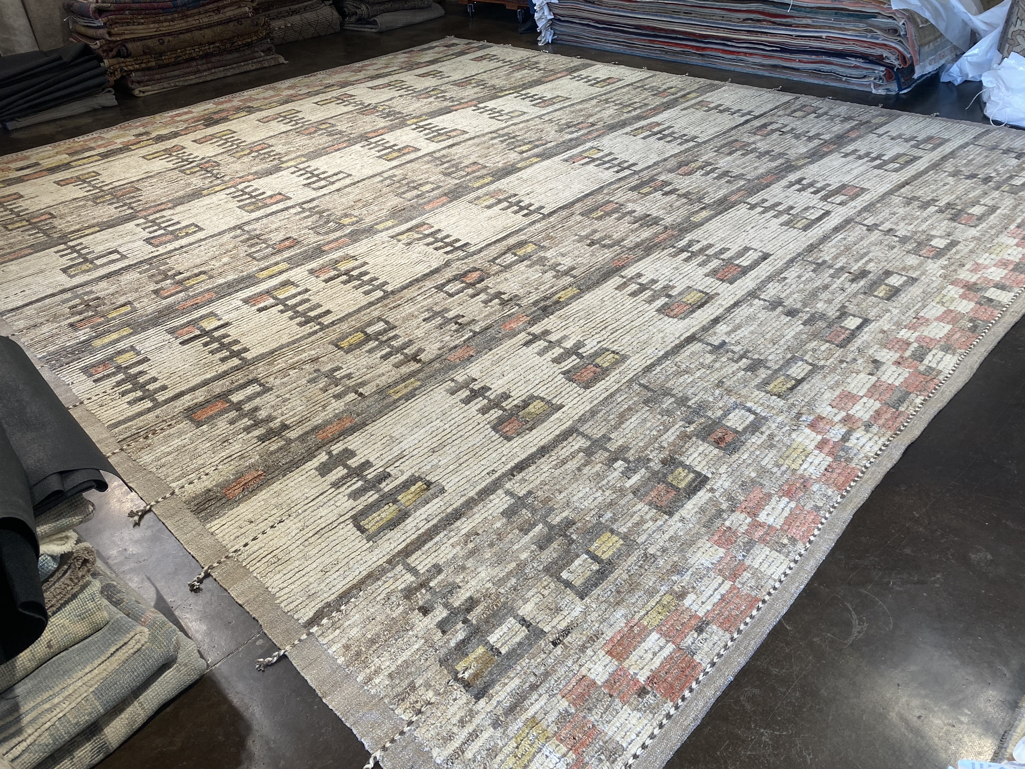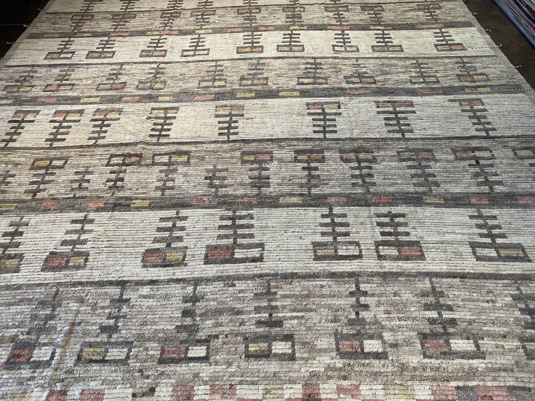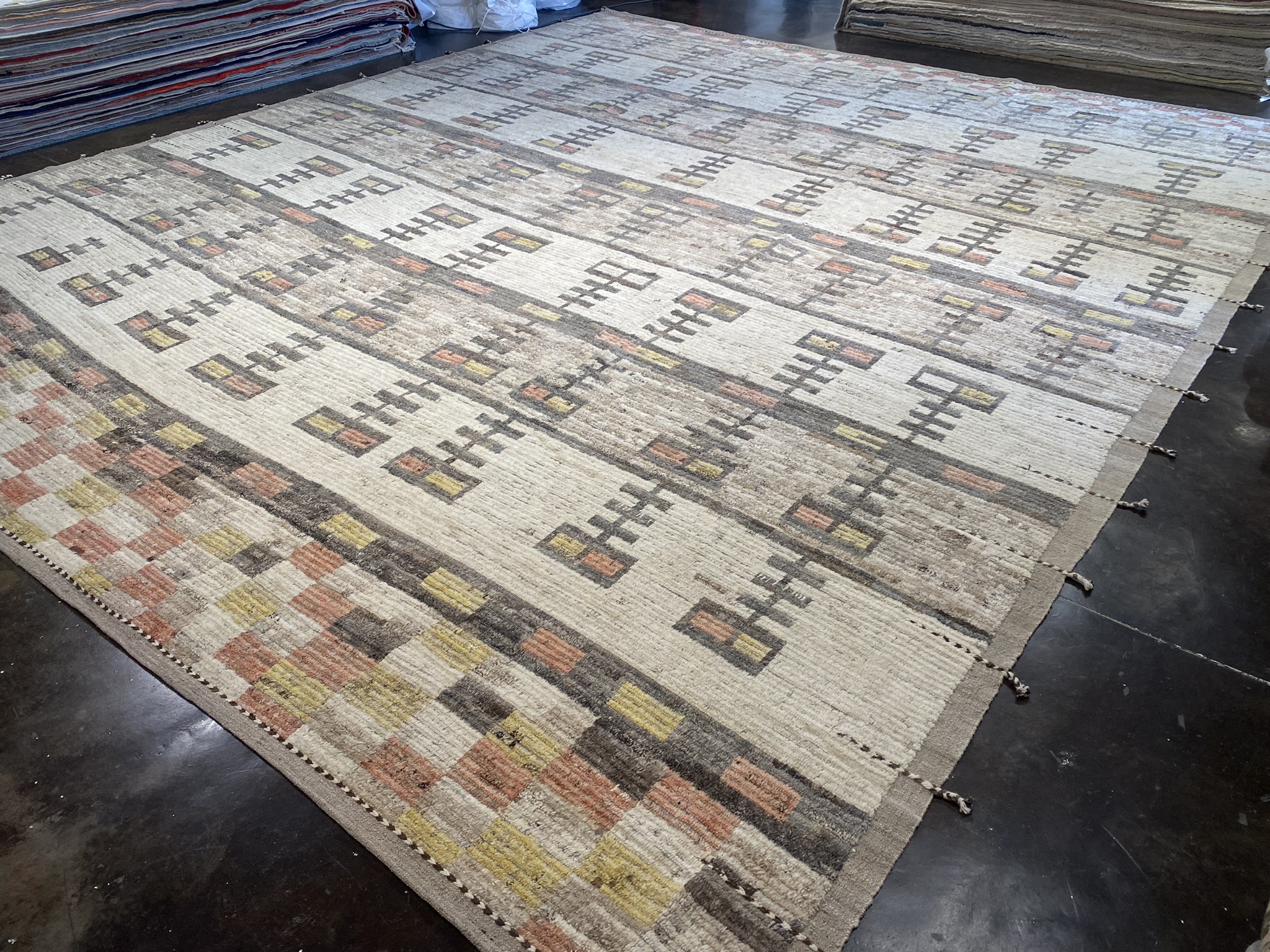 Introducing the stunning MONGOLIAN COLLECTION 15′ x 17′ rug, a masterpiece that seamlessly blends contemporary design with traditional Afghan craftsmanship. This oversized rug, measuring an impressive 180 inches in length and 204 inches in width, is a testament to the skill and artistry of the weavers who created it. The rug’s eclectic and modern design features a captivating array of geometric patterns in a rich palette of black, brown, cream, red, and yellow hues. The intricate motifs, meticulously woven into the fabric, create a mesmerizing visual rhythm that draws the eye and adds depth to the overall composition. Crafted from high-quality materials, this Mongolian rug is built to withstand the test of time. The plush pile offers a luxurious feel underfoot, while the sturdy construction ensures durability and longevity. Whether gracing a spacious living room, dining area, or bedroom, this rug is sure to make a bold statement and become a cherished focal point in any interior. With its unique blend of colors, striking pattern, and generous proportions, the MONGOLIAN COLLECTION 15′ x 17′ rug is a true work of art that will elevate the sophistication and style of any space it inhabits. Don’t miss the opportunity to bring this exceptional piece into your home and experience the beauty and craftsmanship of Afghan artisanship at its finest.