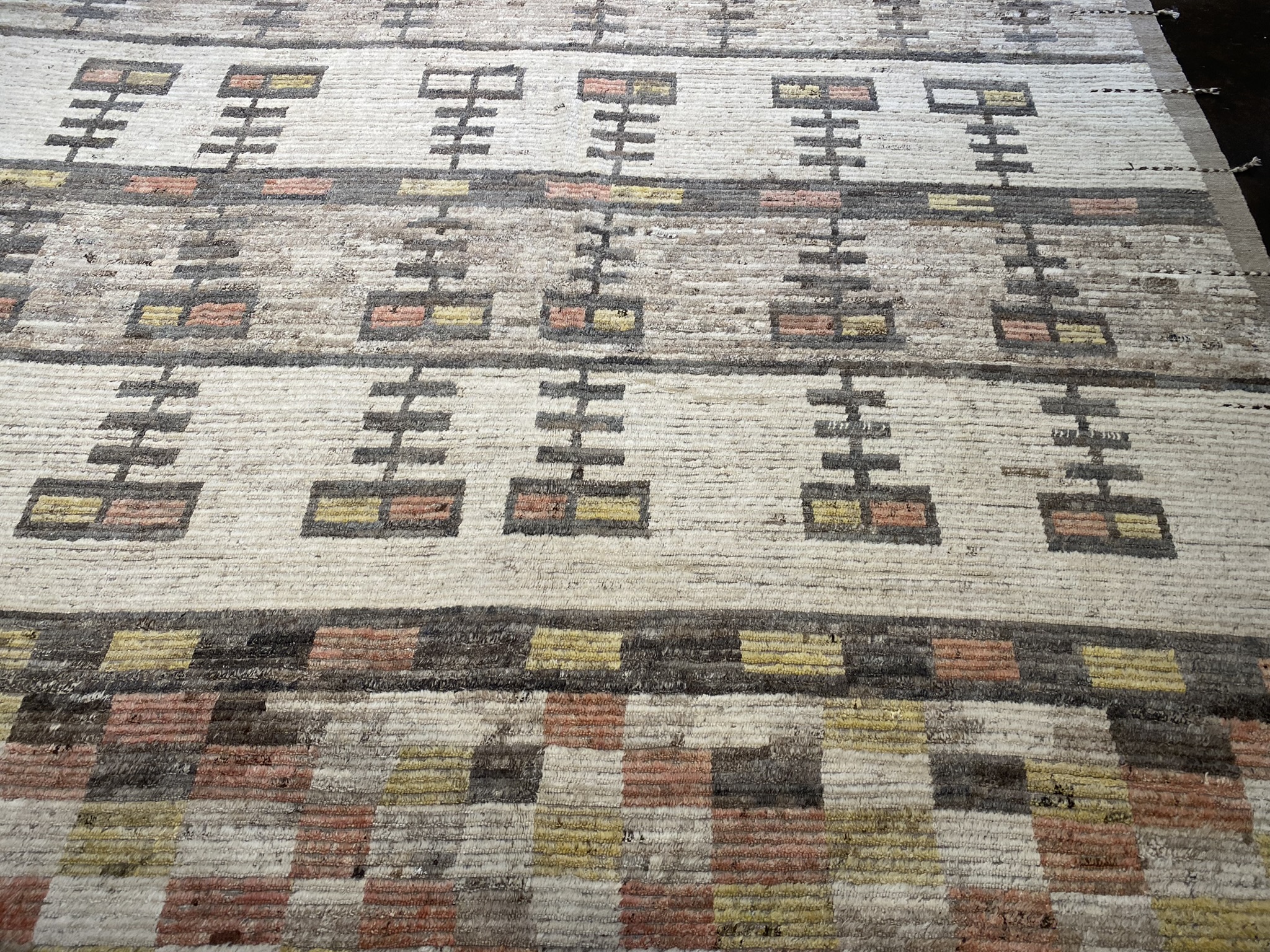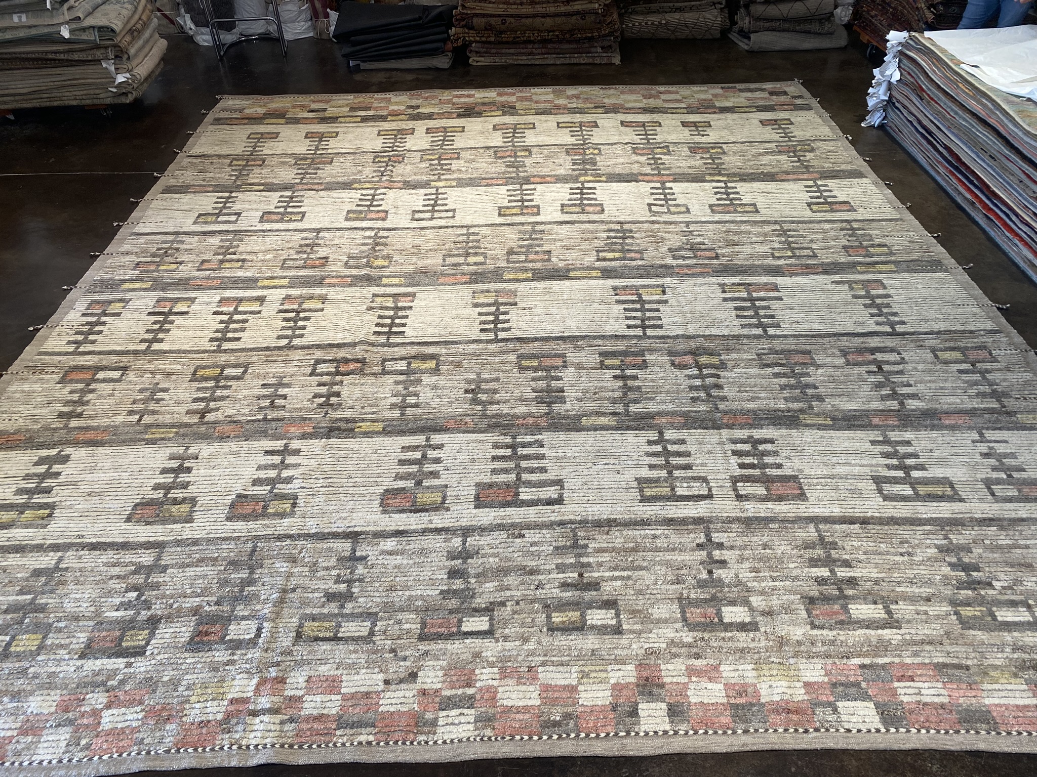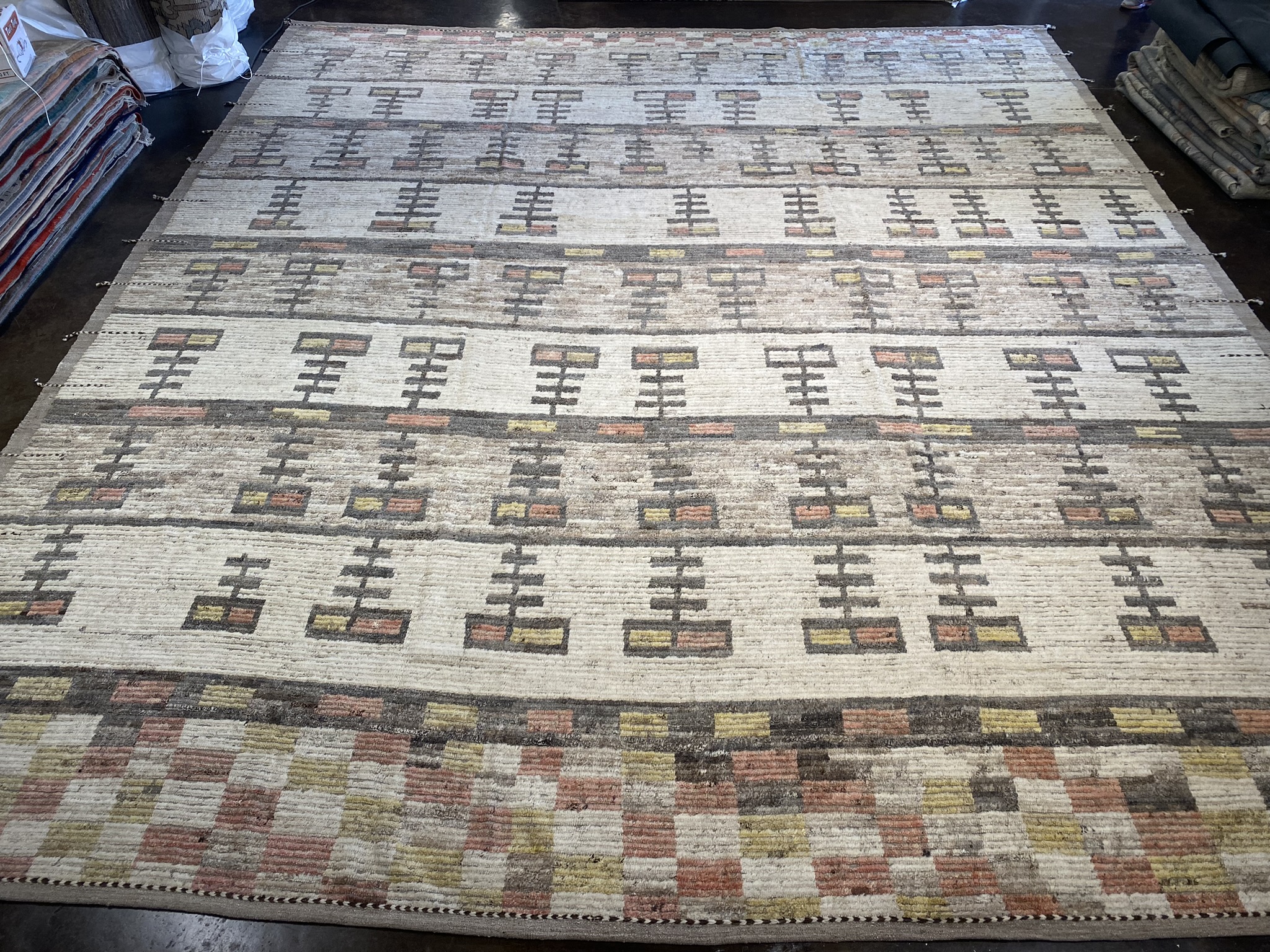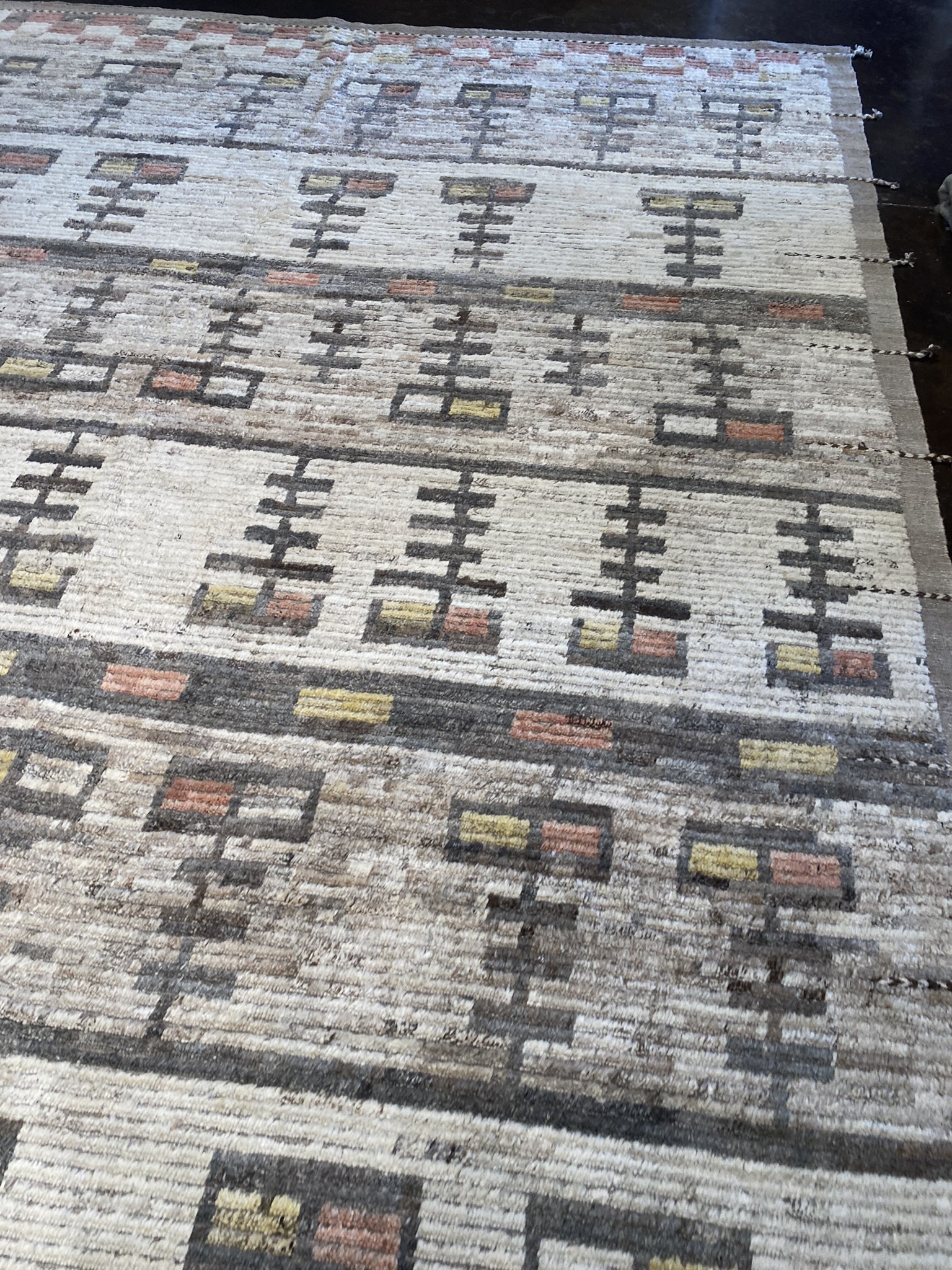 Introducing the stunning MONGOLIAN COLLECTION 15′ x 17′ rug, a masterpiece that seamlessly blends contemporary design with traditional Afghan craftsmanship. This oversized rug, measuring an impressive 180 inches in length and 204 inches in width, is a testament to the skill and artistry of the weavers who created it. The rug’s eclectic and modern design features a captivating array of geometric patterns in a rich palette of black, brown, cream, red, and yellow hues. The intricate motifs, meticulously woven into the fabric, create a mesmerizing visual rhythm that draws the eye and adds depth to the overall composition. Crafted from high-quality materials, this Mongolian rug is built to withstand the test of time. The plush pile offers a luxurious feel underfoot, while the sturdy construction ensures durability and longevity. Whether gracing a spacious living room, dining area, or bedroom, this rug is sure to make a bold statement and become a cherished focal point in any interior. With its unique blend of colors, striking pattern, and generous proportions, the MONGOLIAN COLLECTION 15′ x 17′ rug is a true work of art that will elevate the sophistication and style of any space it inhabits. Don’t miss the opportunity to bring this exceptional piece into your home and experience the beauty and craftsmanship of Afghan artisanship at its finest.