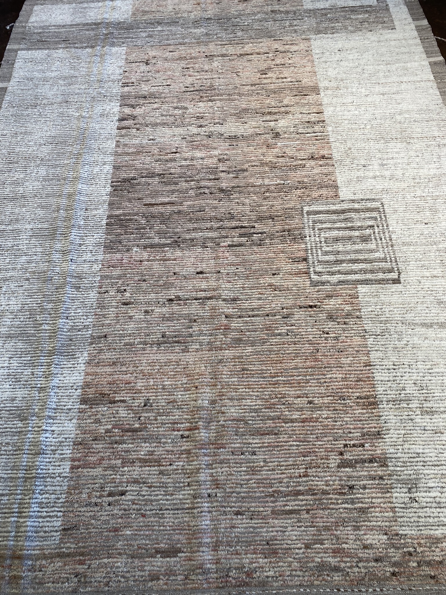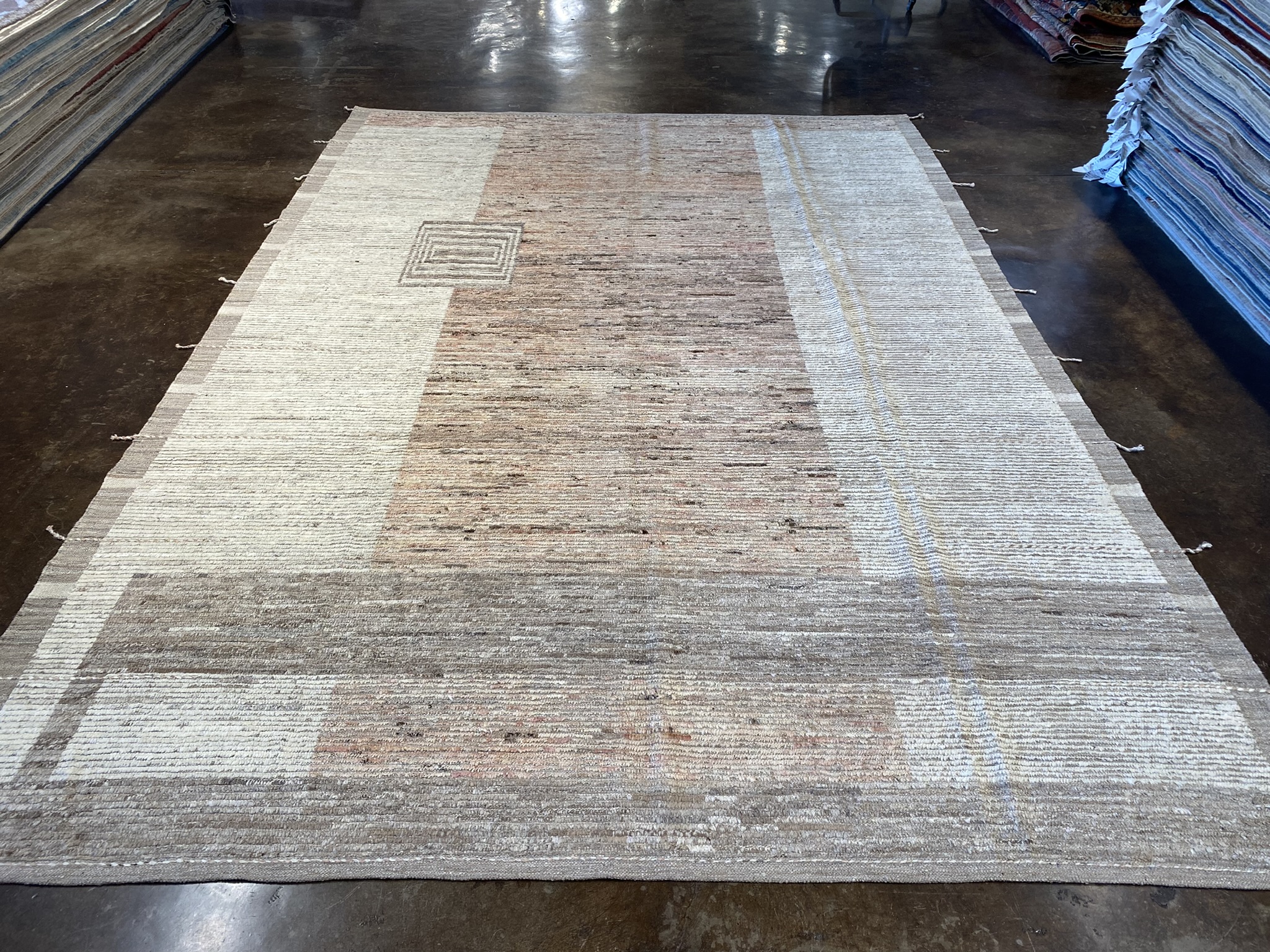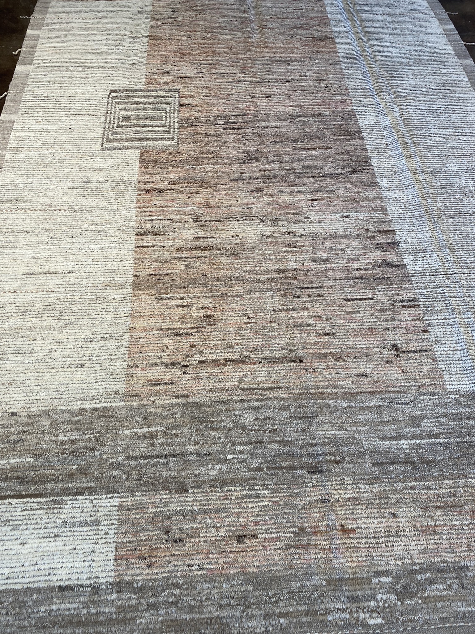 Elevate your space with this stunning 8’2″ x 11’4″ Mongolian Collection rug, a perfect blend of contemporary style and timeless craftsmanship. Handwoven by skilled Afghan artisans, this brand new rug features a minimal, modern design in a captivating palette of brown and cream hues. The rug’s exquisite texture is created through a combination of varying pile heights, with the cream accents showcasing a lower pile that beautifully contrasts the plush, higher pile of the brown background. This interplay of textures adds visual depth and a tactile allure that invites you to sink your toes into its sumptuous fibers. Measuring an impressive 98 inches in length and 136 inches in width, this generously sized rug is ideal for anchoring larger living spaces, dining areas, or master bedrooms. The neutral color scheme effortlessly complements a wide range of decor styles, from minimalist and modern to rustic and bohemian-inspired interiors. Crafted with meticulous attention to detail and made to withstand the test of time, this Mongolian Collection rug is a true testament to the enduring beauty and quality of Afghan rug-making traditions. Bring a touch of sophistication and warmth to your home with this exceptional piece, and enjoy its luxurious feel and eye-catching design for years to come.