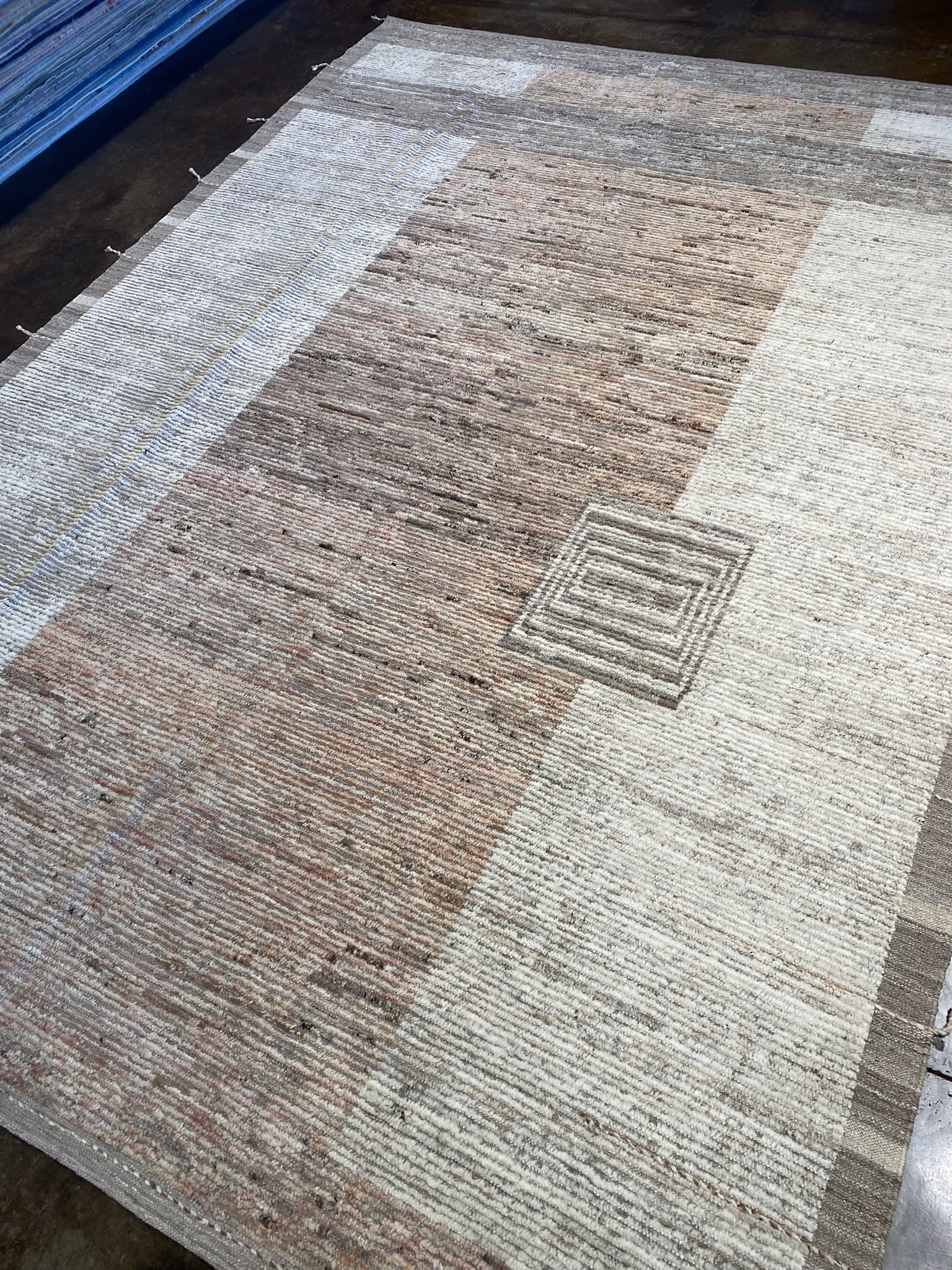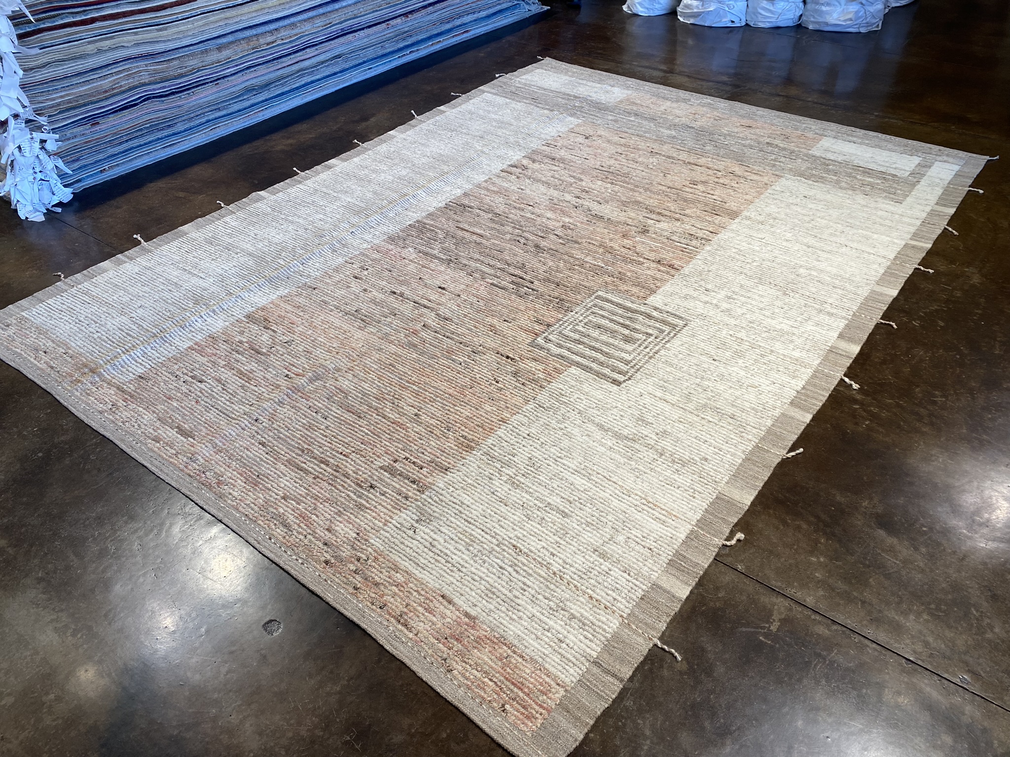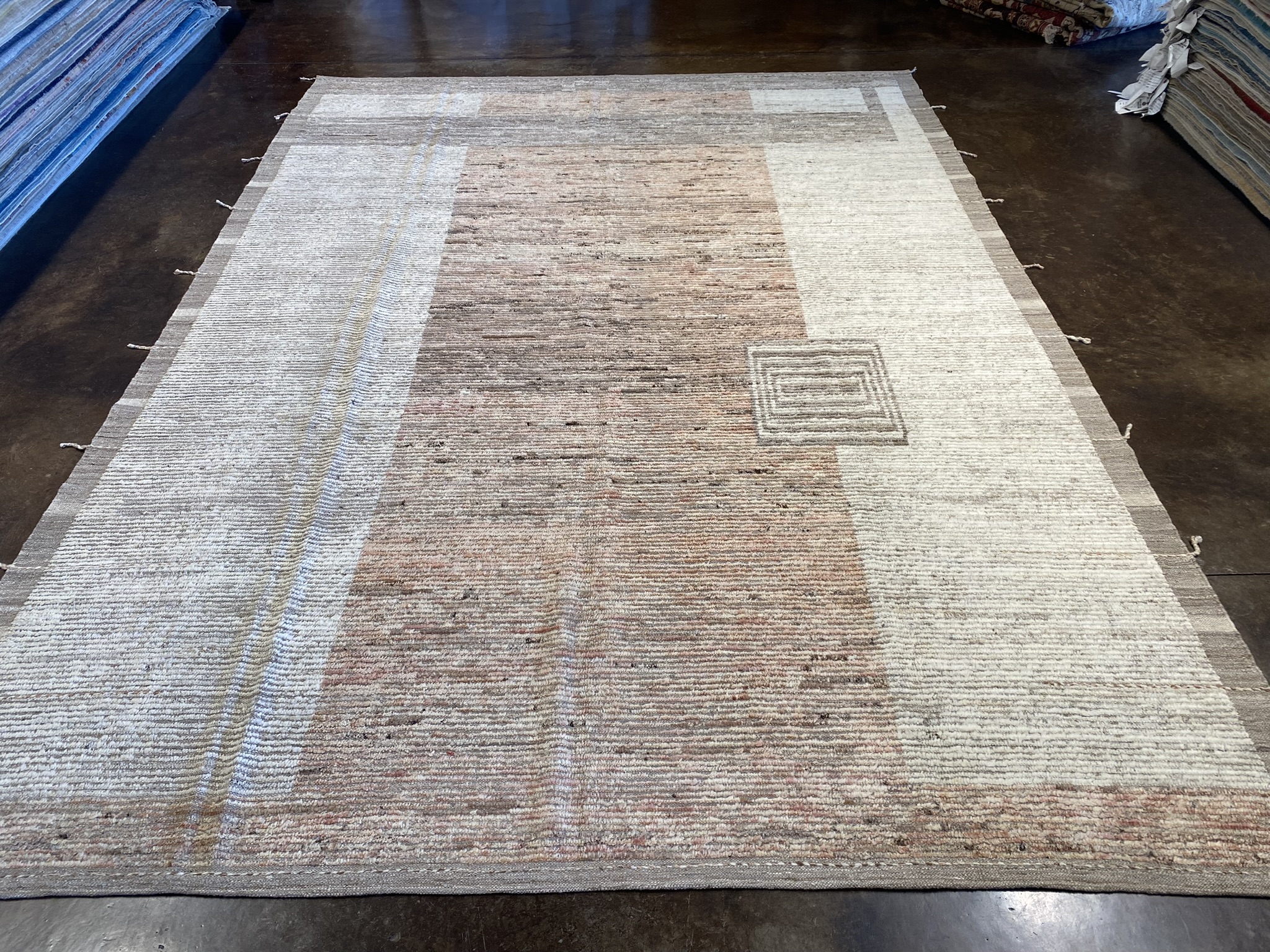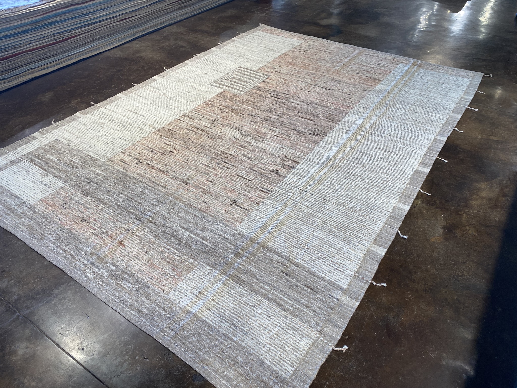 Elevate your space with this stunning 8’2″ x 11’4″ Mongolian Collection rug, a perfect blend of contemporary style and timeless craftsmanship. Handwoven by skilled Afghan artisans, this brand new rug features a minimal, modern design in a captivating palette of brown and cream hues. The rug’s exquisite texture is created through a combination of varying pile heights, with the cream accents showcasing a lower pile that beautifully contrasts the plush, higher pile of the brown background. This interplay of textures adds visual depth and a tactile allure that invites you to sink your toes into its sumptuous fibers. Measuring an impressive 98 inches in length and 136 inches in width, this generously sized rug is ideal for anchoring larger living spaces, dining areas, or master bedrooms. The neutral color scheme effortlessly complements a wide range of decor styles, from minimalist and modern to rustic and bohemian-inspired interiors. Crafted with meticulous attention to detail and made to withstand the test of time, this Mongolian Collection rug is a true testament to the enduring beauty and quality of Afghan rug-making traditions. Bring a touch of sophistication and warmth to your home with this exceptional piece, and enjoy its luxurious feel and eye-catching design for years to come.
