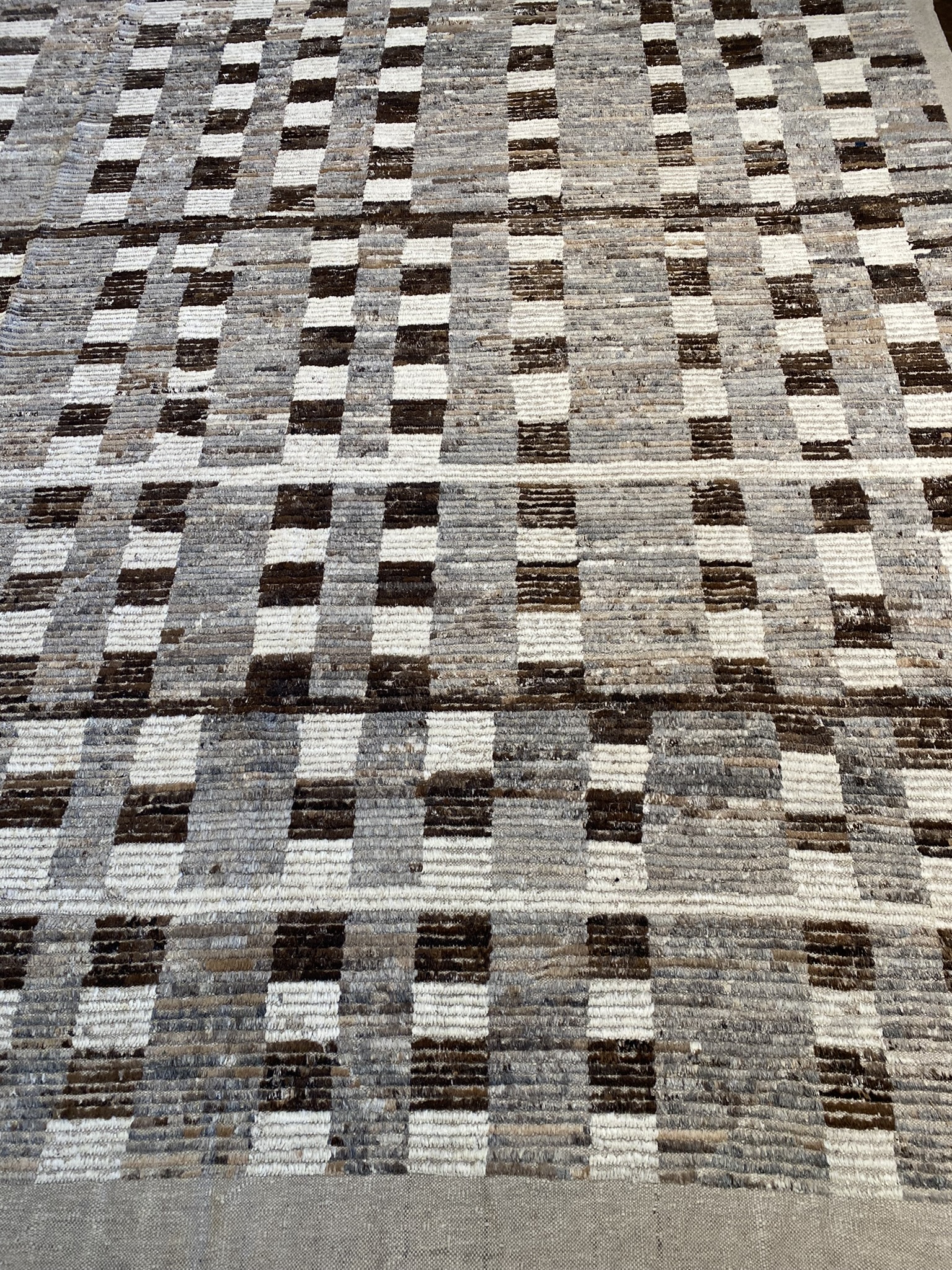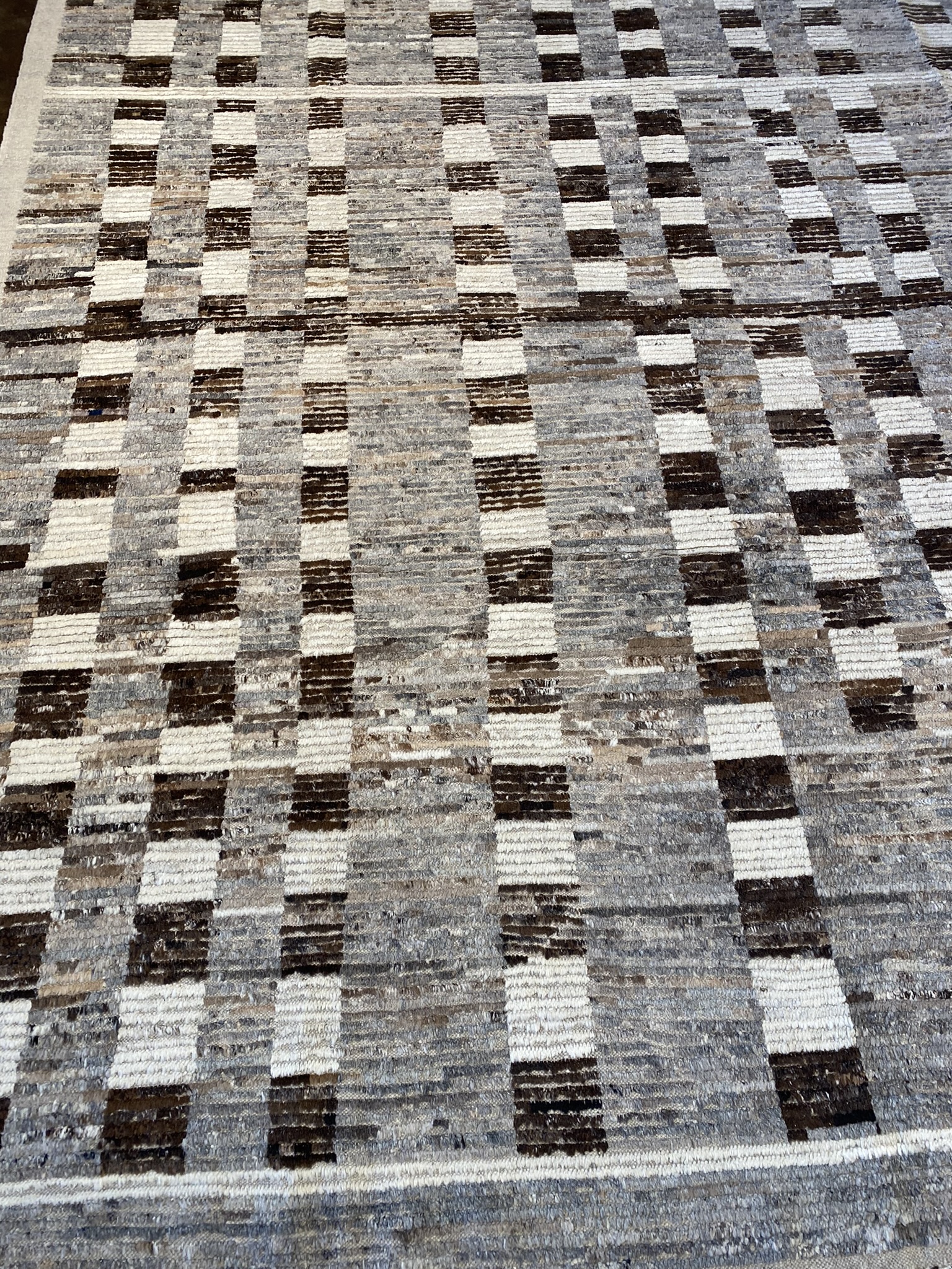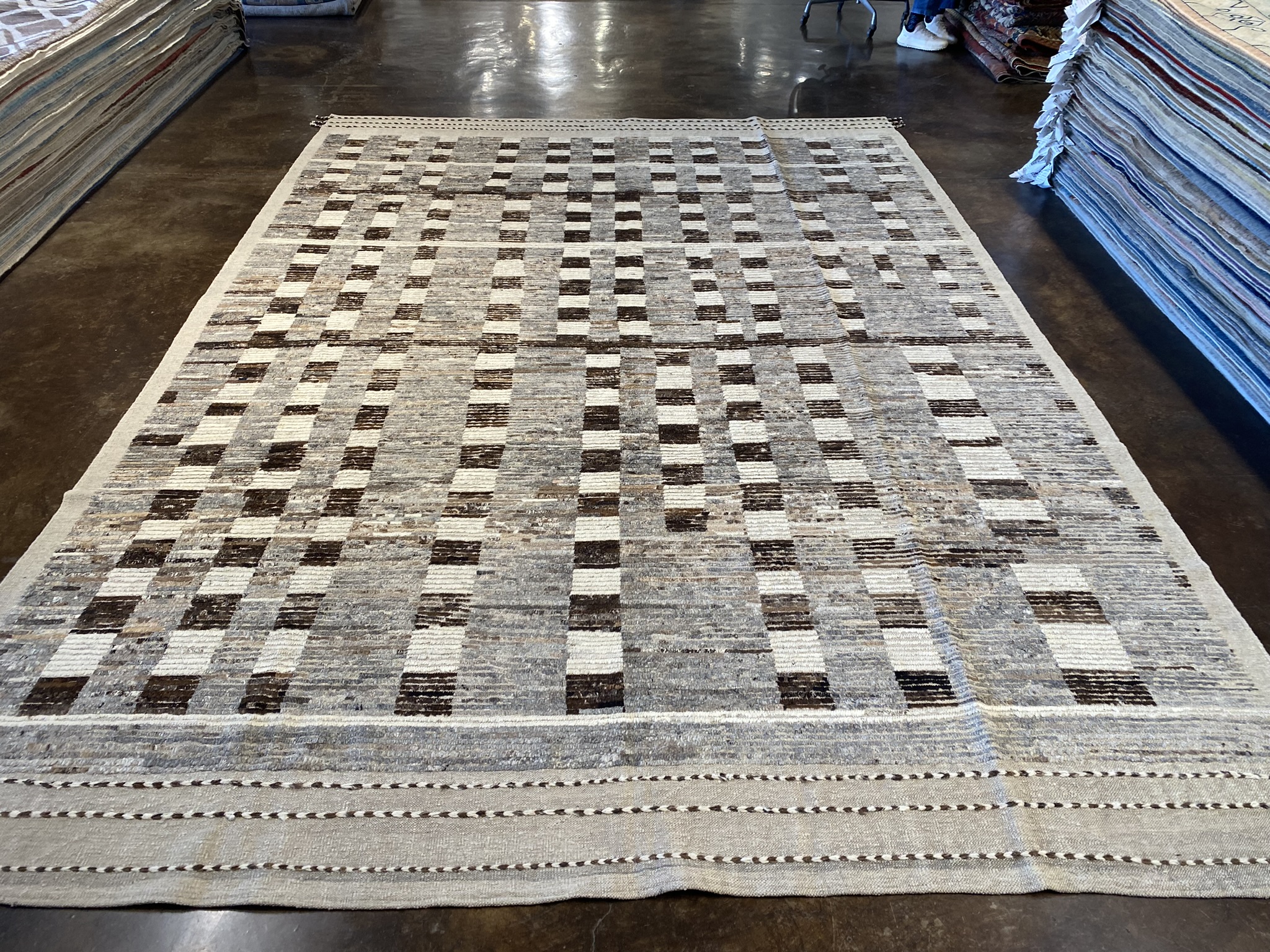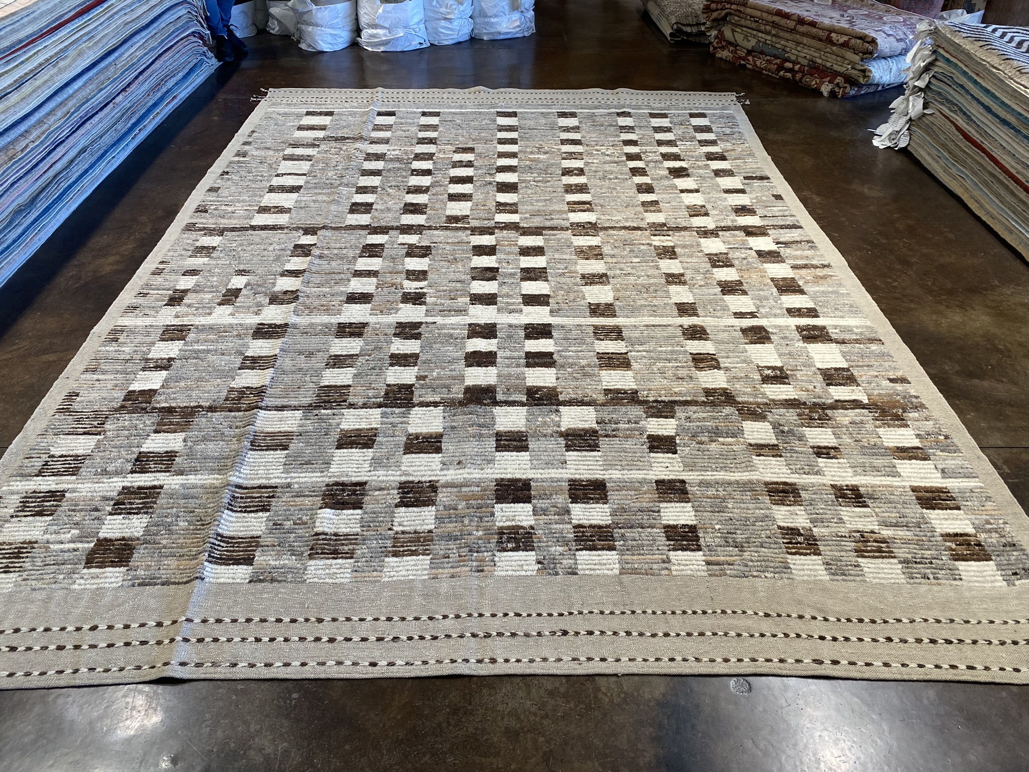 Introduce a touch of modern sophistication to your living space with this stunning 9’2″ x 13′ Mongolian Collection rug. Crafted with meticulous attention to detail, this Afghan-made rug showcases a captivating geometric pattern in a harmonious blend of brown, cream, gray, and tan hues. The contemporary design features an intricate grid of small rectangular blocks, creating a mesmerizing visual texture that draws the eye and adds depth to the room. The neutral color palette effortlessly complements a wide range of dĂ©cor styles, making this rug a versatile choice for any interior. Measuring an impressive 110 inches in length and 156 inches in width, this sizeable rug provides ample coverage for larger rooms, anchoring the space and creating a cozy, inviting atmosphere. The rug’s brand new condition ensures that it will maintain its beauty and durability for years to come. Whether you’re looking to define a seating area, add warmth to a bedroom, or create a striking focal point in your dining room, this Mongolian Collection rug is the perfect choice. Its timeless appeal and exceptional craftsmanship make it a valuable addition to any home, infusing your space with a touch of elegance and refinement.