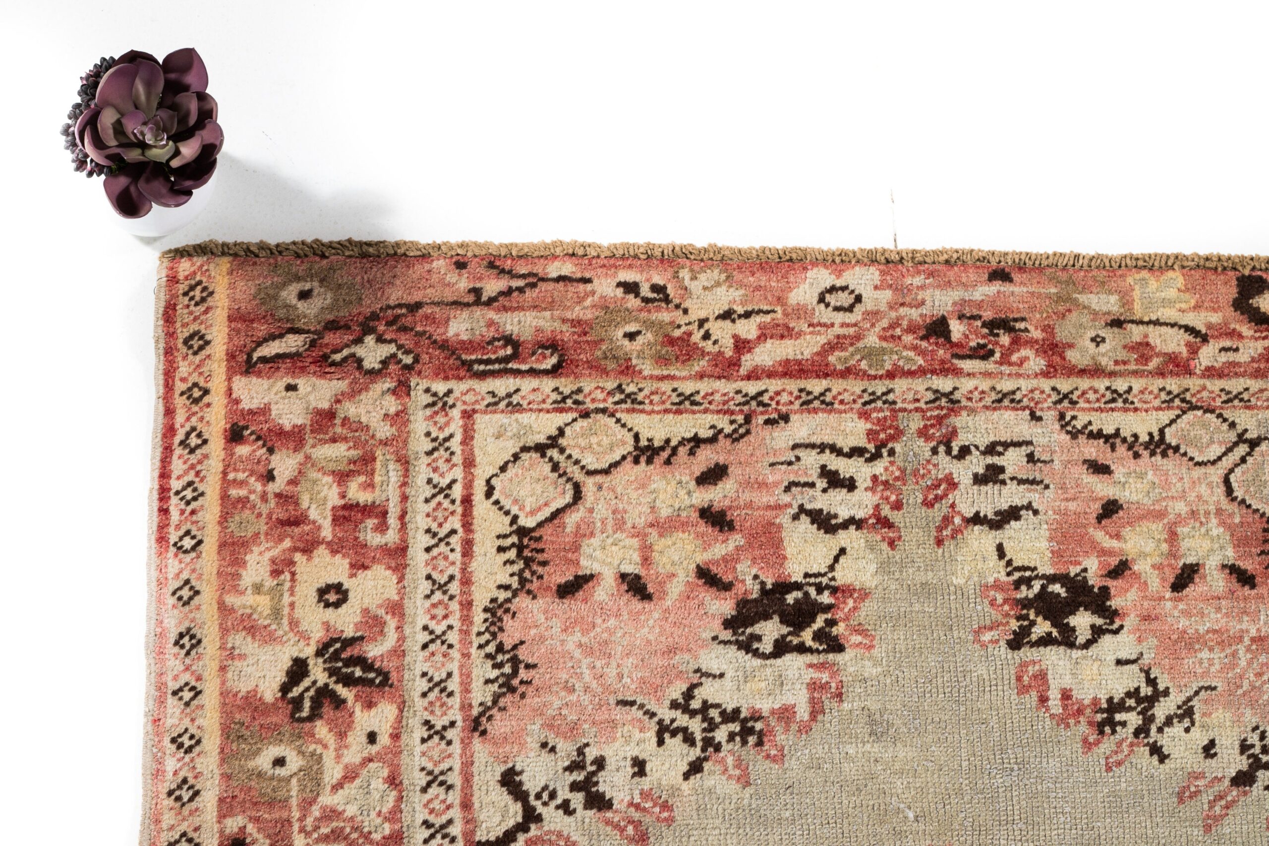This vintage Fethiye carpet is beautiful, appearing pink, dusty, and elaborate. The Fethiye uses an open medallion, containing a ring of flowers and garlands in a wreath at the center of this snowy white field. This carpet exhibits extremely fine outlining and laser focused division. This soft Fethiye design uses florid scrolls to frame the medallion perfectly. Add this beauty to your collection and it will last a lifetime.