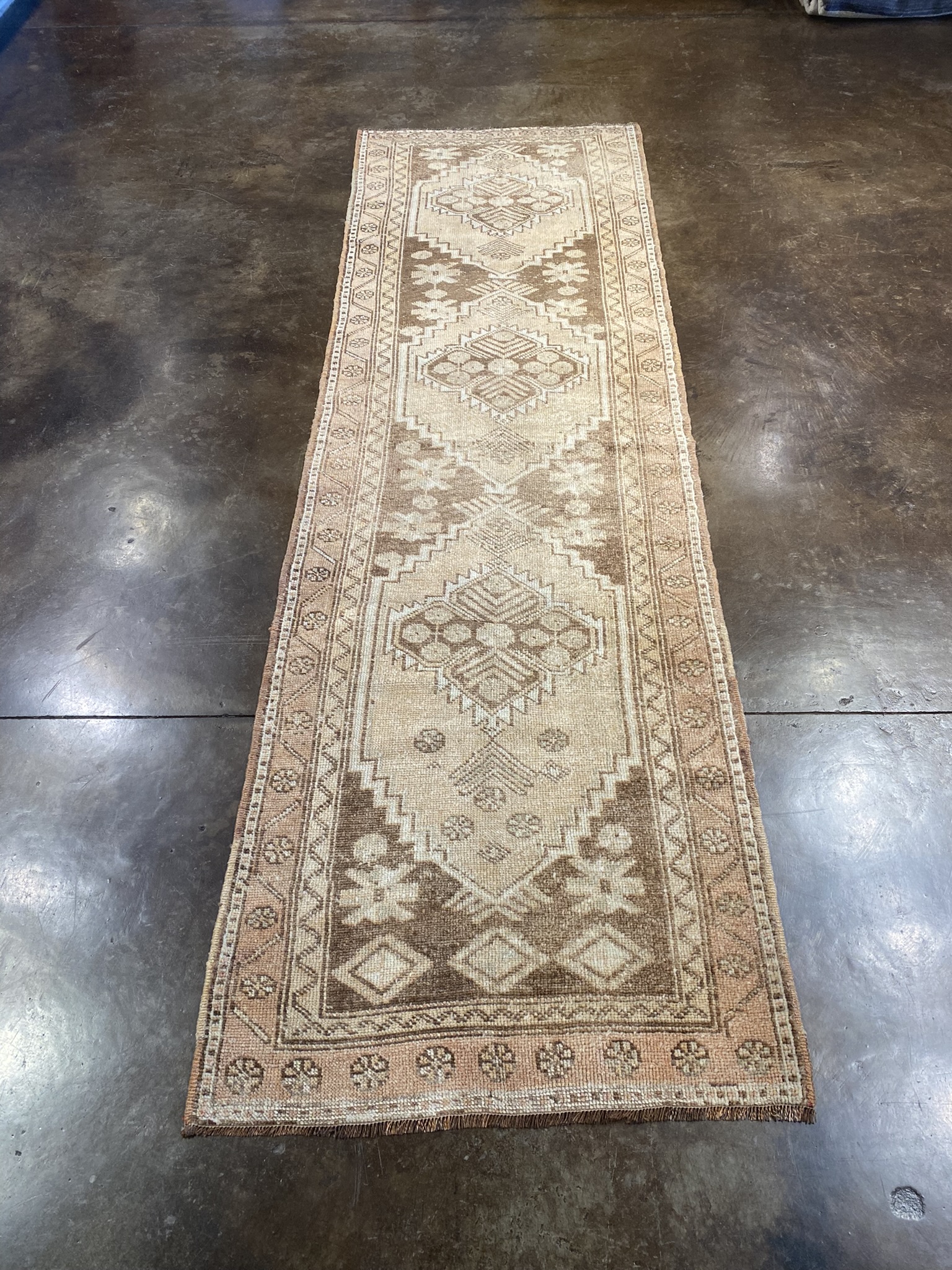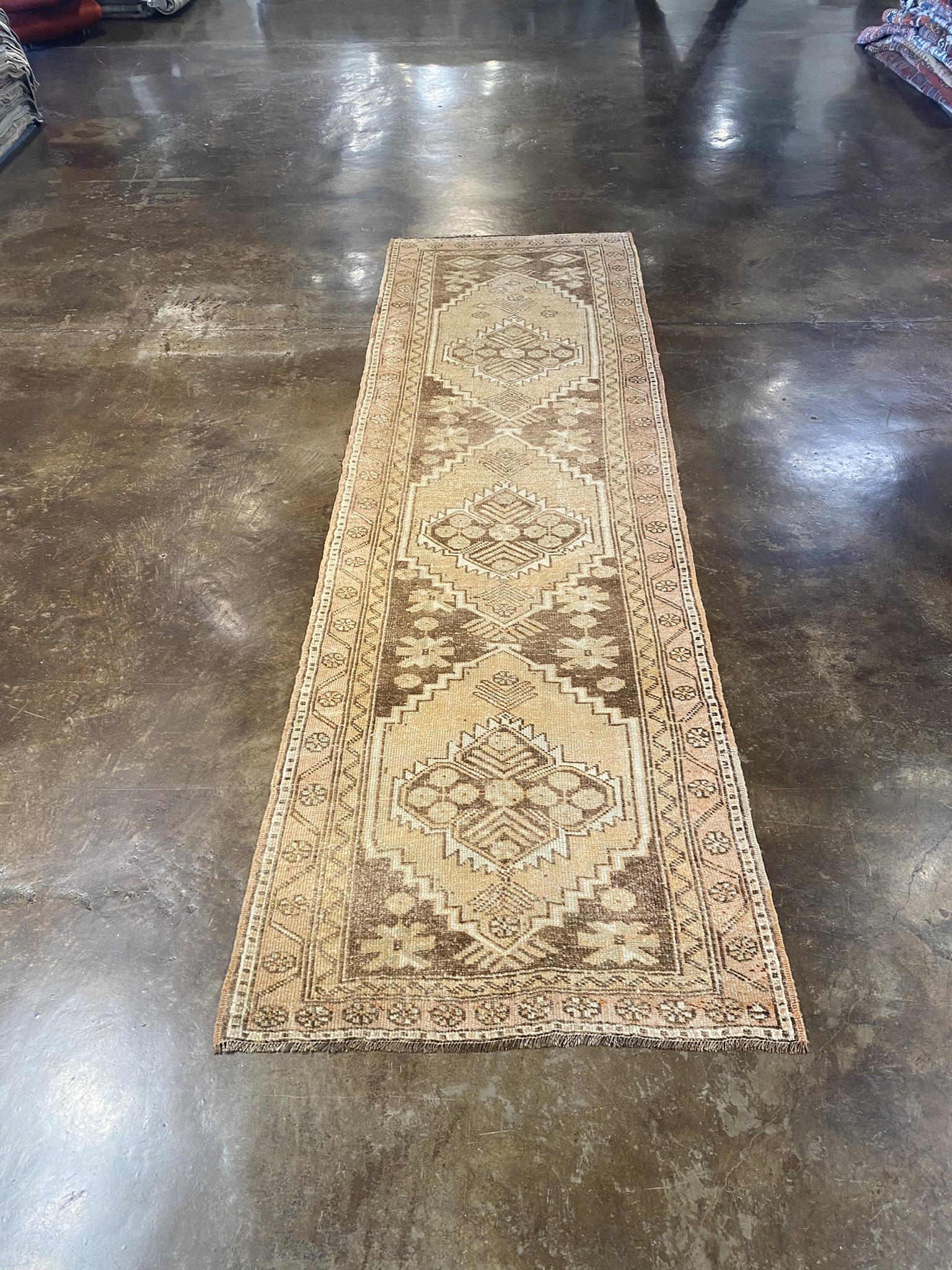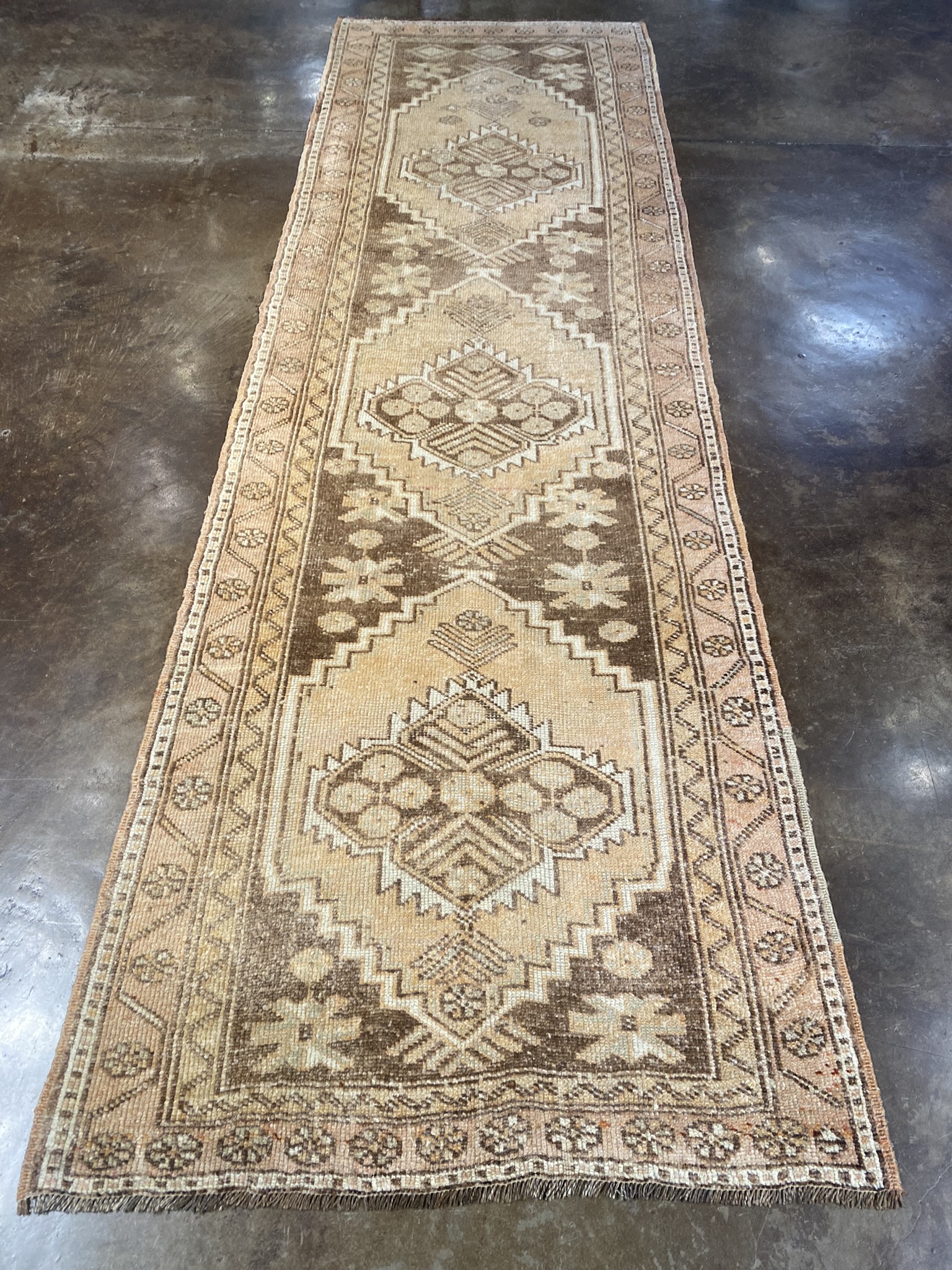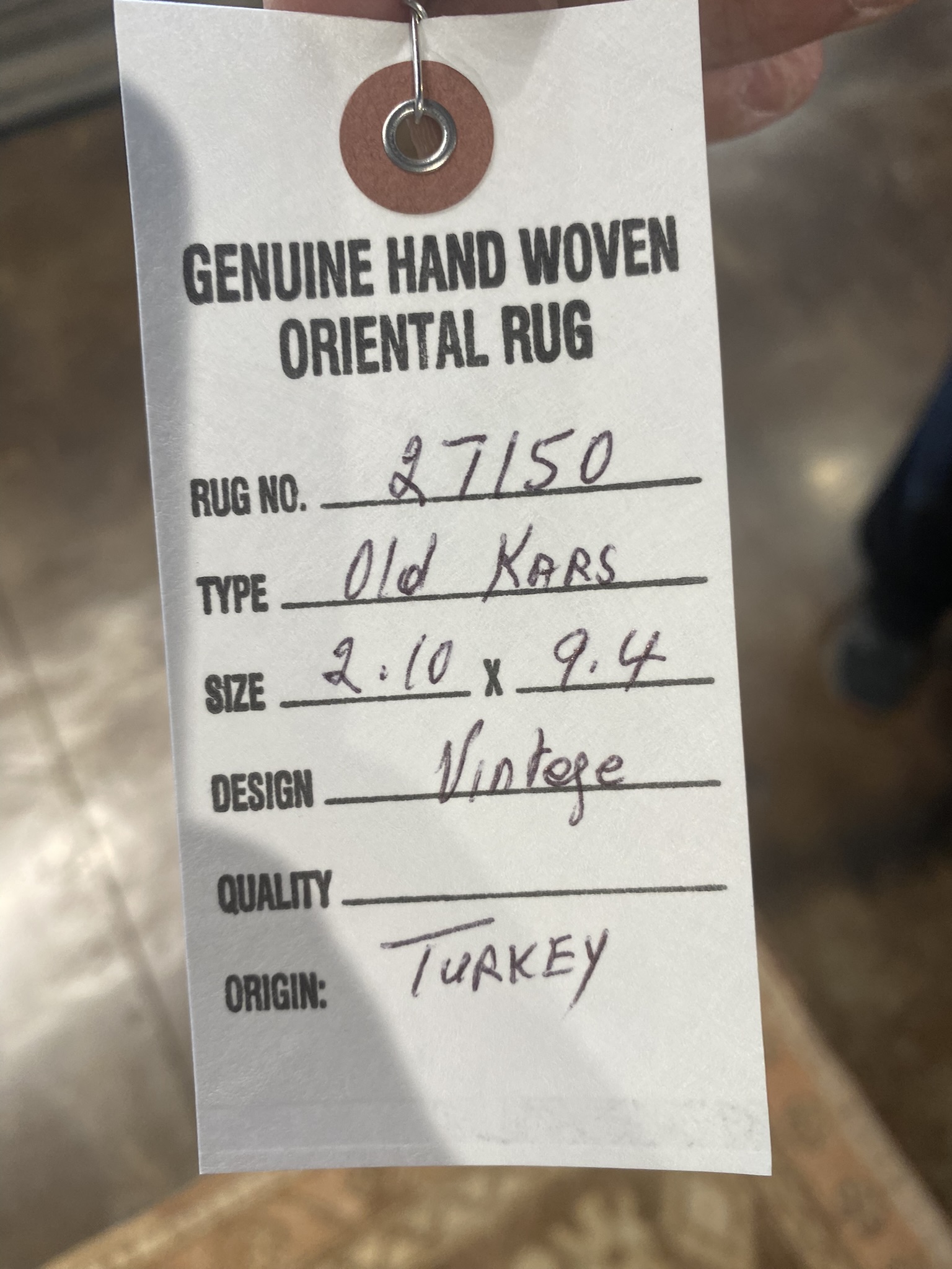 Introducing a stunning vintage Kars runner rug, measuring approximately 2’10” x 9’4″ (34″ x 112″). This exquisite piece hails from the Anatolian region of Turkey, renowned for its rich history of handcrafted textiles. Woven with meticulous attention to detail, this runner rug showcases a captivating traditional geometric design. The intricate pattern features diamond-shaped motifs adorned with smaller geometric elements, creating a mesmerizing visual rhythm that draws the eye along the length of the rug. The color palette is a harmonious blend of warm, earthy tones, including shades of brown, cream, and tan. These hues work together seamlessly, imbuing the rug with a sense of timeless elegance and sophistication. As a vintage piece, this Kars runner has developed a charming patina that speaks to its age and authenticity. The gentle wear and subtle variations in color only add to its character and charm, making it a true one-of-a-kind treasure. Crafted using traditional techniques passed down through generations, this runner rug is a testament to the skill and artistry of Turkish weavers. Its durability and resilience ensure that it will continue to grace your home with its beauty for years to come. Whether gracing the hallway of a classic home or adding a touch of warmth and texture to a modern interior, this vintage Kars runner rug is a versatile and enchanting addition to any space. Bring a piece of Anatolian heritage into your home and enjoy the timeless elegance and craftsmanship of this exceptional textile.