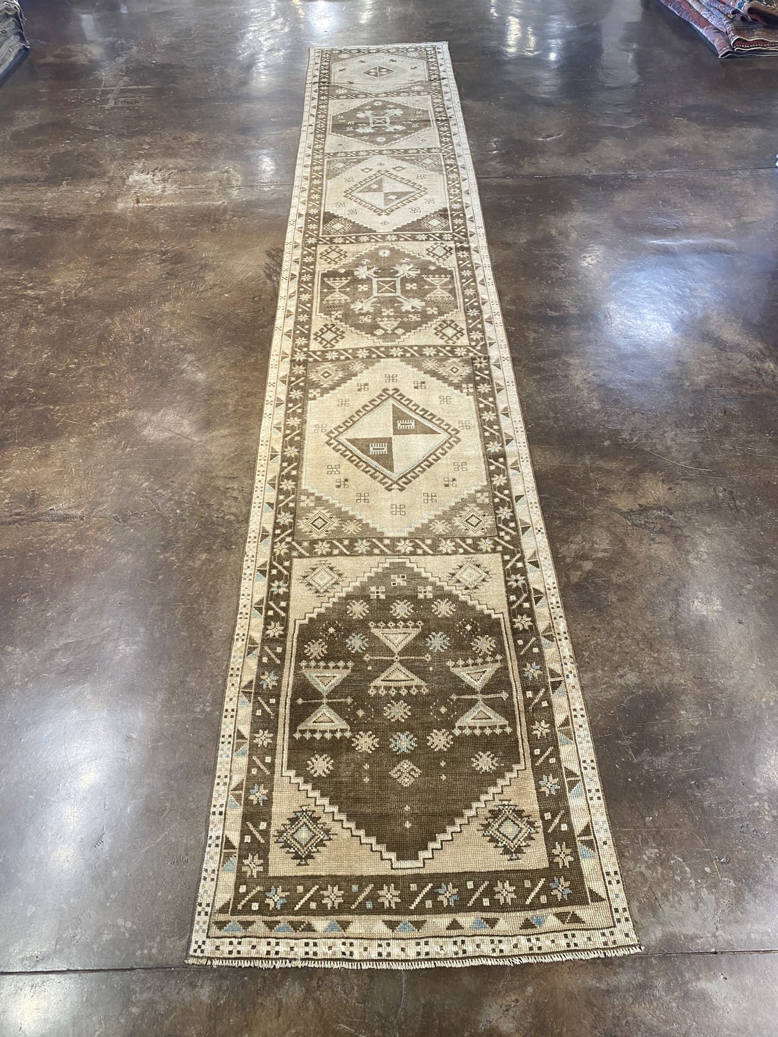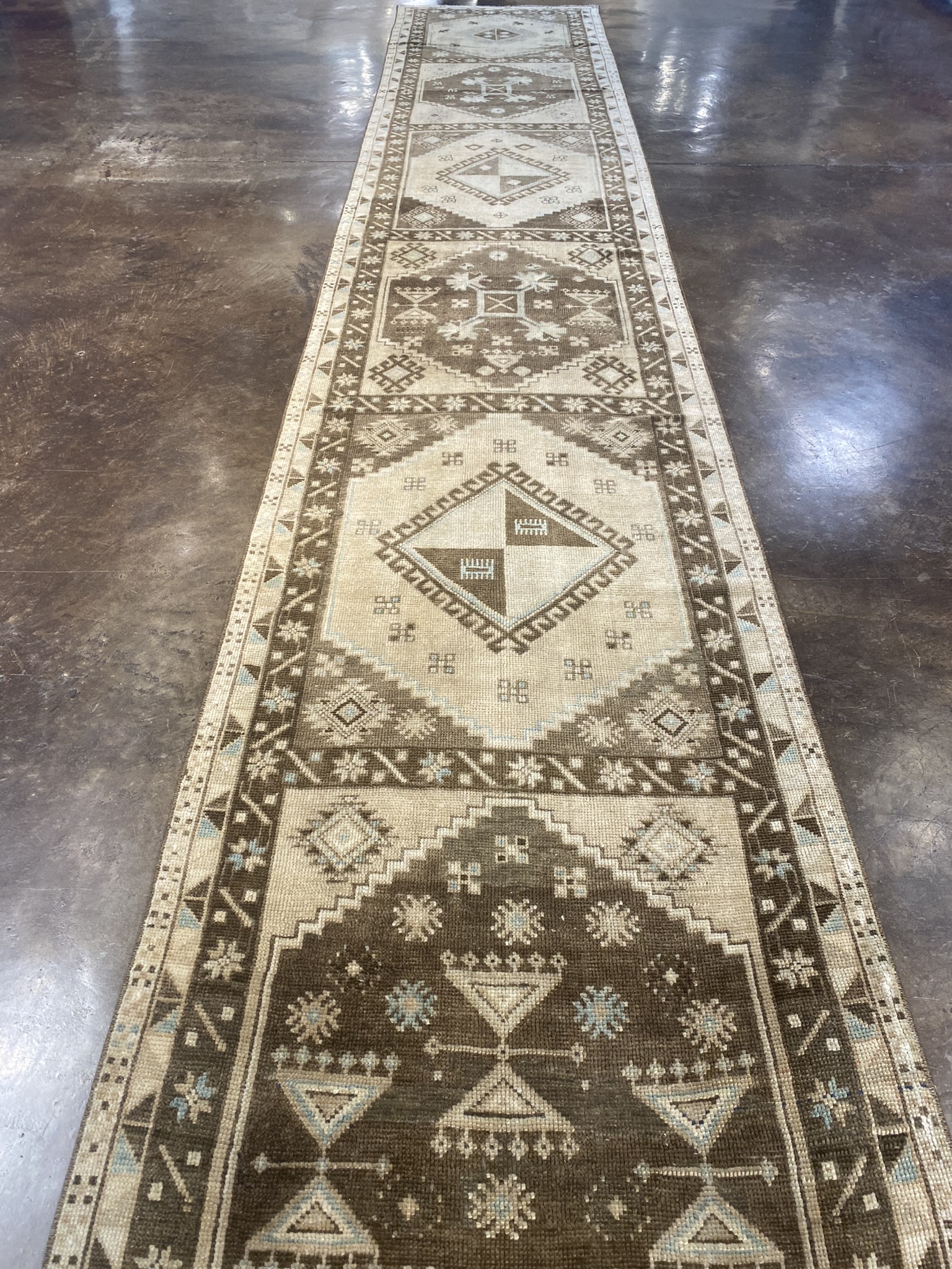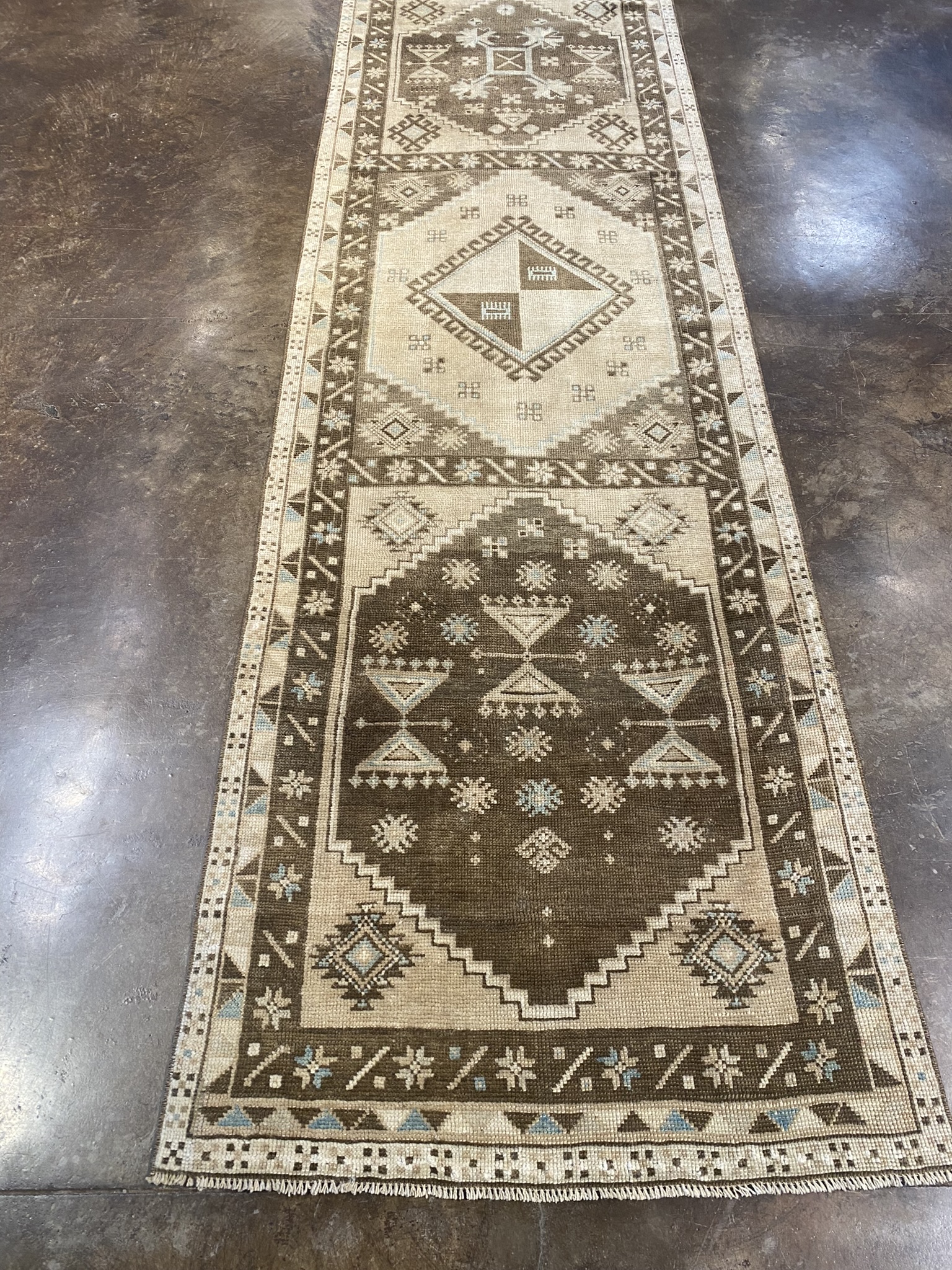 Introducing a stunning vintage Turkish Kars runner rug, measuring approximately 2’8″ x 15’10”. This exquisite piece showcases a harmonious blend of traditional and geometric designs, creating a captivating visual appeal. Woven with meticulous craftsmanship, the rug features a rich color palette of brown, cream, light blue, and tan hues. The intricate patterns and symbols adorning the rug tell a story of the rich cultural heritage of the Anatolian region. The central field of the runner is adorned with a series of diamond-shaped medallions, each containing smaller geometric motifs. These medallions are surrounded by a border of stylized floral elements and angular shapes, creating a mesmerizing interplay of patterns. The precise symmetry and repetition of the designs demonstrate the skill and attention to detail of the artisans who created this masterpiece. Crafted from high-quality materials, this Kars runner is built to withstand the test of time. Its durability ensures that it will remain a cherished addition to any home for years to come. Whether gracing the hallway of a traditional home or adding a touch of exotic charm to a modern interior, this vintage Turkish Kars runner is a testament to the enduring beauty and craftsmanship of Anatolian rug-making traditions. Its timeless elegance and versatility make it a true collector’s piece that will be treasured for generations.