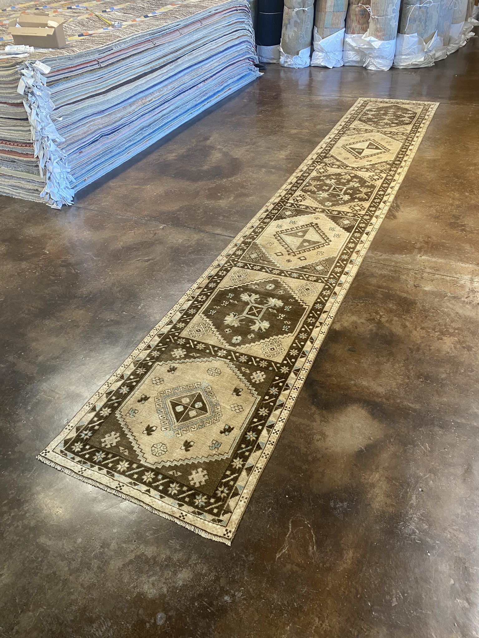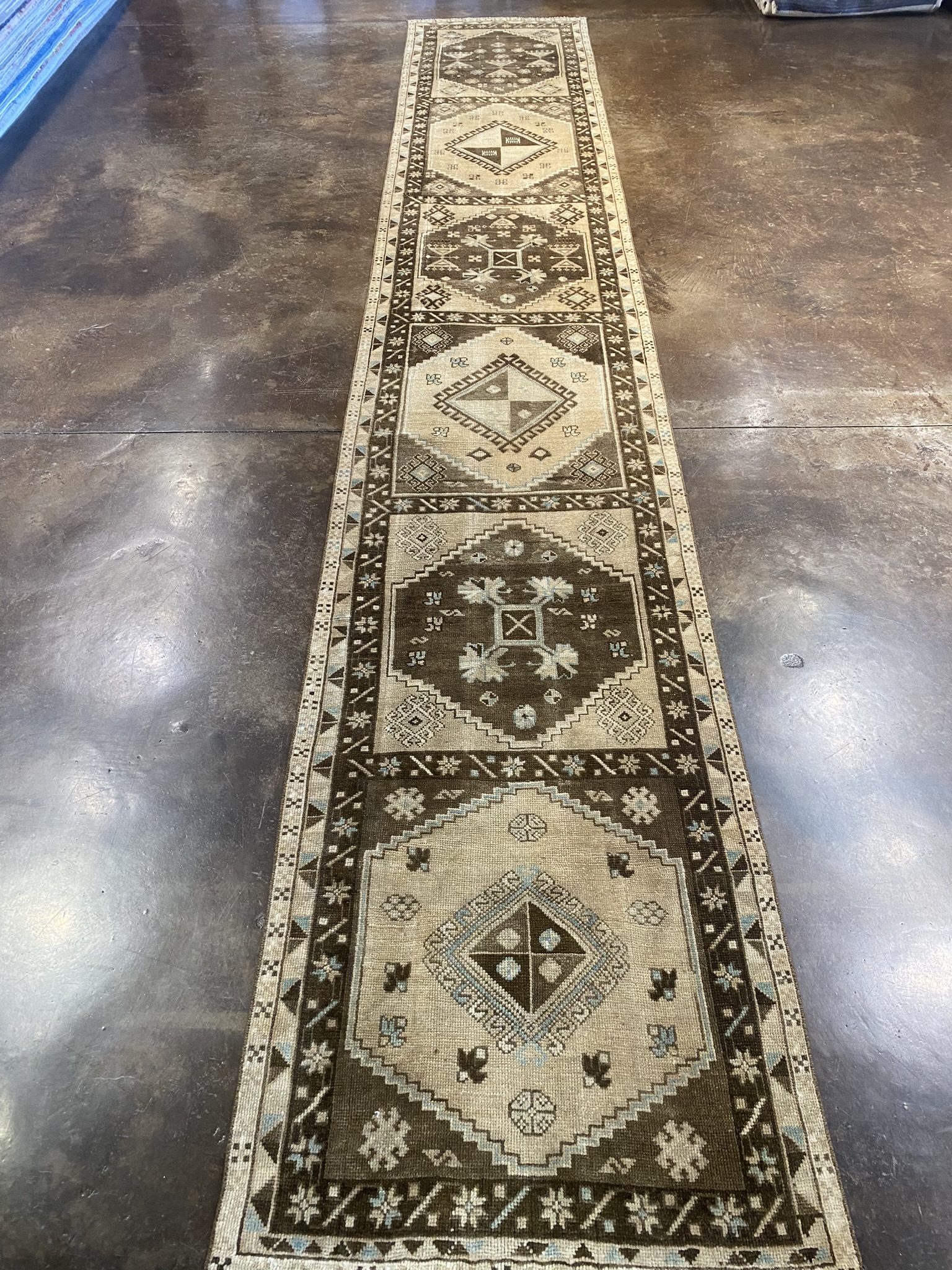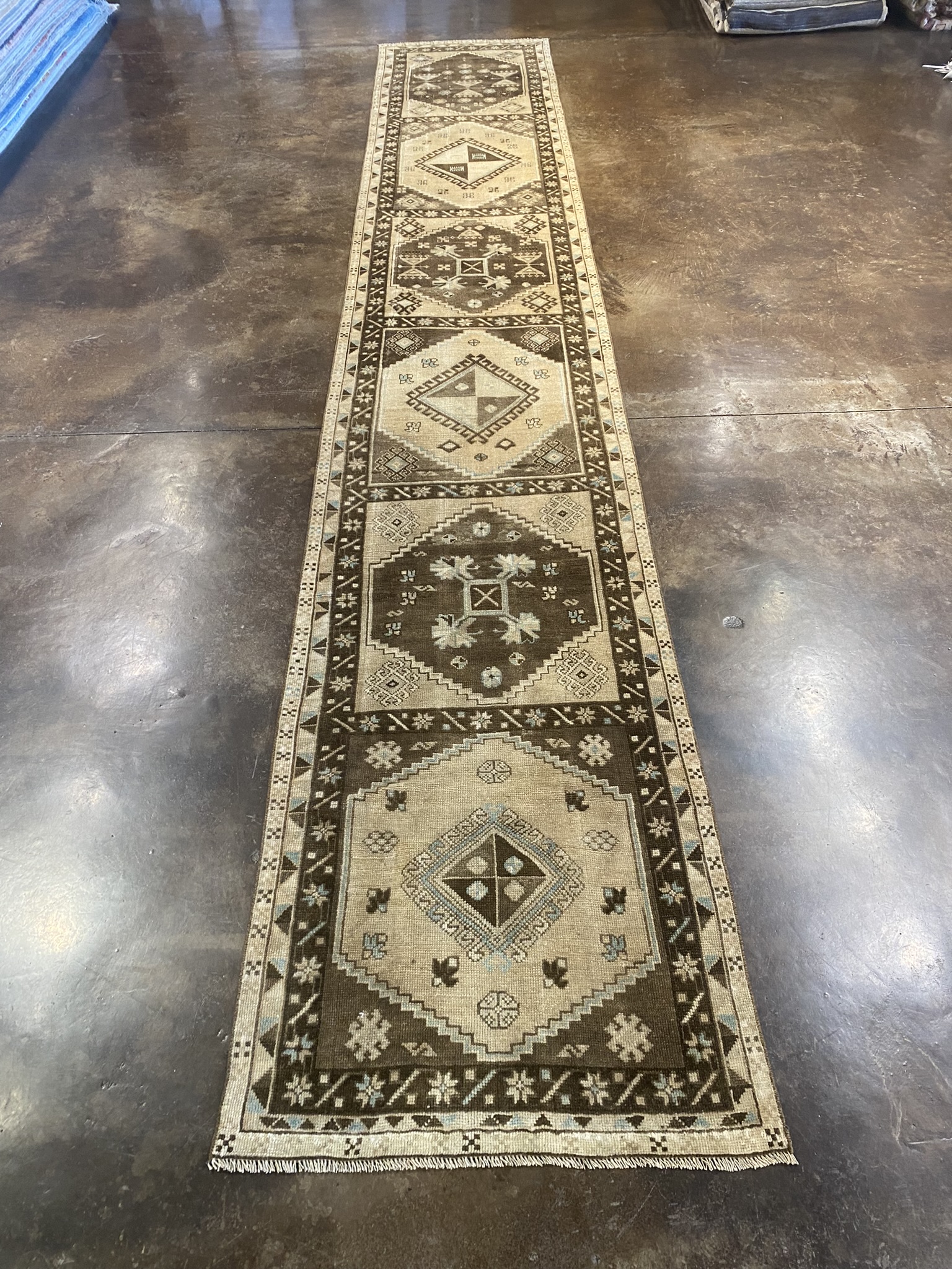 Introducing a stunning vintage Turkish Kars runner rug, measuring approximately 2’8″ x 15’10”. This exquisite piece showcases a harmonious blend of traditional and geometric designs, creating a captivating visual appeal. Woven with meticulous craftsmanship, the rug features a rich color palette of brown, cream, light blue, and tan hues. The intricate patterns and symbols adorning the rug tell a story of the rich cultural heritage of the Anatolian region. The central field of the runner is adorned with a series of diamond-shaped medallions, each containing smaller geometric motifs. These medallions are surrounded by a border of stylized floral elements and angular shapes, creating a mesmerizing interplay of patterns. The precise symmetry and repetition of the designs demonstrate the skill and attention to detail of the artisans who created this masterpiece. Crafted from high-quality materials, this Kars runner is built to withstand the test of time. Its durability ensures that it will remain a cherished addition to any home for years to come. Whether gracing the hallway of a traditional home or adding a touch of exotic charm to a modern interior, this vintage Turkish Kars runner is a testament to the enduring beauty and craftsmanship of Anatolian rug-making traditions. Its timeless elegance and versatility make it a true collector’s piece that will be treasured for generations.