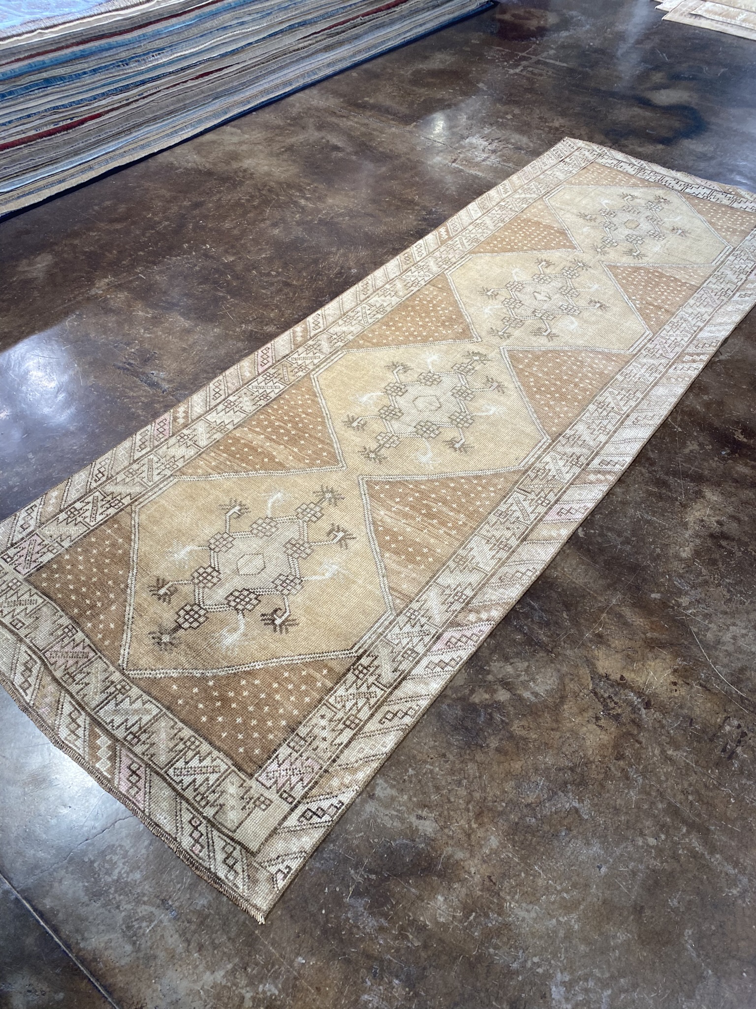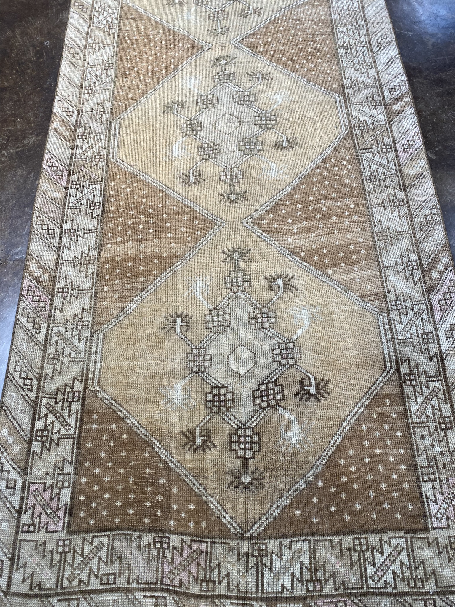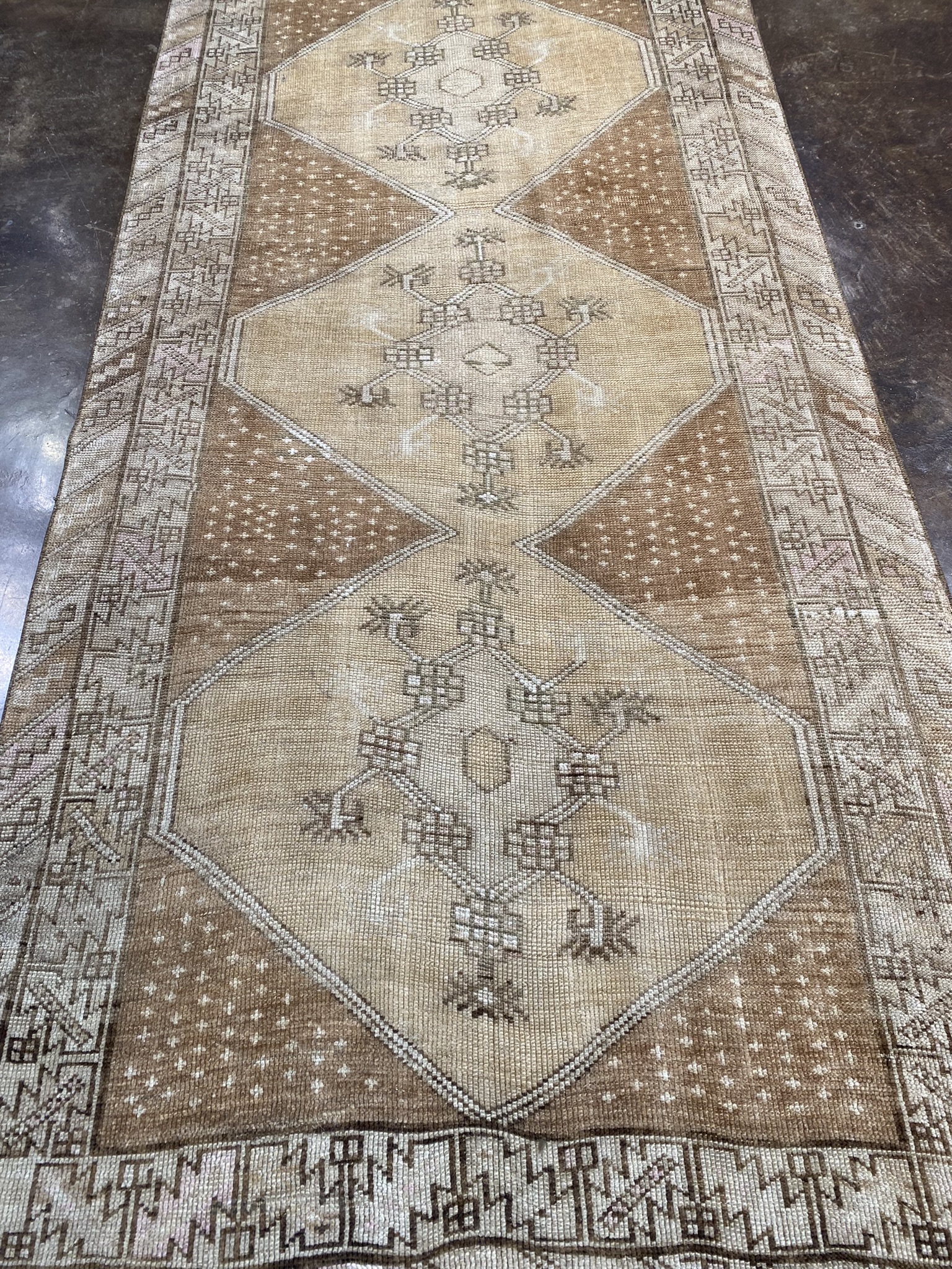 Handwoven by skilled Turkish artisans, the rug features a captivating central design composed of intricate diamond-shaped motifs arranged in a symmetrical layout. The muted earth tones of brown, camel, cream, and tan create a harmonious color palette that complements a wide range of interior styles, from rustic to modern.