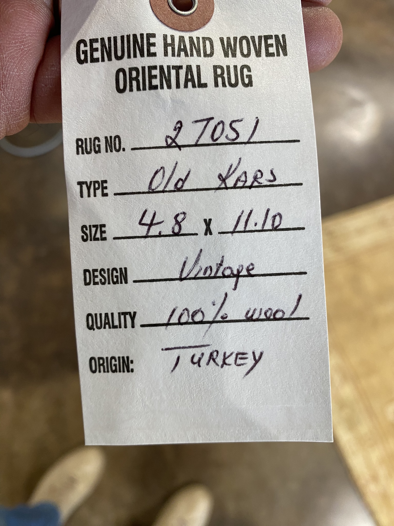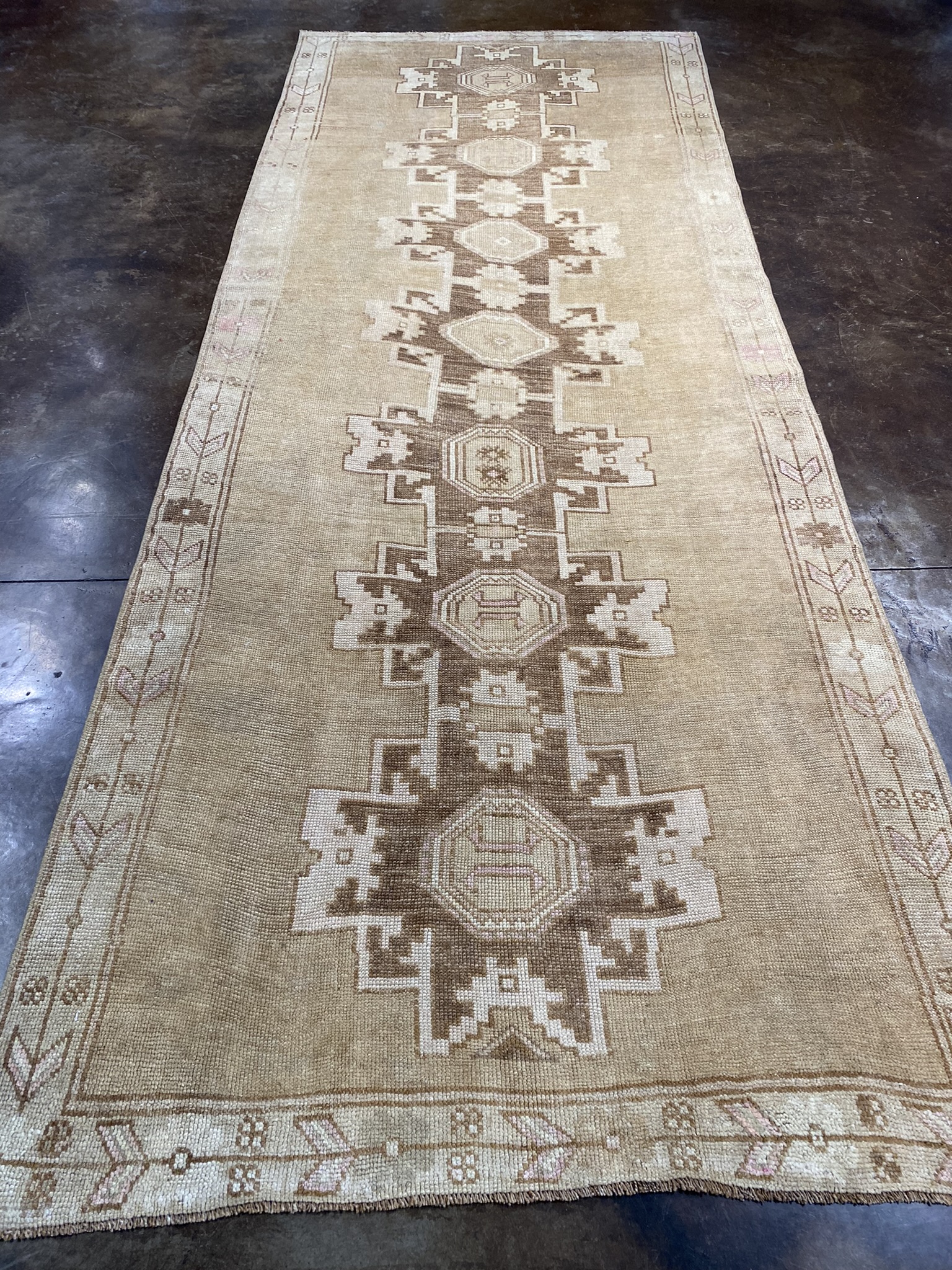 Introducing a stunning vintage Turkish Kars rug, measuring approximately 4’8″ x 11’10”. This gallery-sized piece showcases a captivating blend of geometric and traditional designs, creating a visual masterpiece that is both timeless and enchanting. Woven with exquisite craftsmanship, the rug features a mesmerizing central medallion composition. The intricate geometric patterns within the medallions are meticulously executed, showcasing the artisan’s attention to detail and skill. The field surrounding the central design is adorned with smaller geometric motifs, adding depth and complexity to the overall aesthetic. The color palette of this Kars rug is a harmonious mix of earthy browns, gentle creams, and warm tan hues. These colors work together to create a sense of warmth and elegance, making it a versatile addition to any interior space. As a vintage piece, this rug carries with it the charm and character that only comes with age. The slight variations in color and texture are a testament to its handmade nature and the rich cultural heritage of Anatolian rug-making traditions. Crafted with durability in mind, this Turkish rug is sure to withstand the test of time, serving as a cherished family heirloom for generations to come. Its generous size makes it perfect for anchoring a living room, dining area, or bedroom, infusing the space with a touch of exotic allure and timeless sophistication. Don’t miss the opportunity to own this extraordinary vintage Turkish Kars rug, a true embodiment of Anatolian craftsmanship and style.