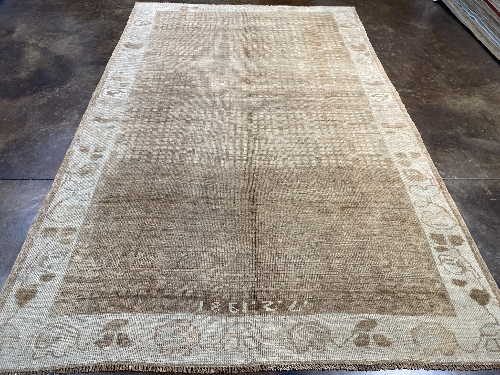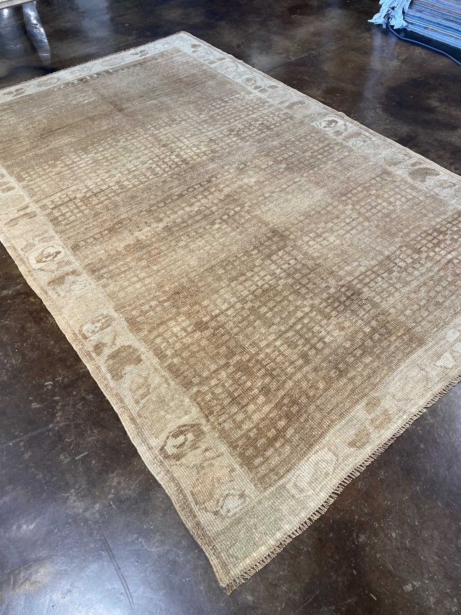 Introducing a stunning vintage Kars rug from Turkey, measuring approximately 6’2″ x 9’10”. This traditional Anatolian piece showcases a captivating blend of warm brown and cream hues, creating a timeless and versatile aesthetic suitable for any interior décor. The rug’s intricate design features a central field adorned with an allover pattern of subtle geometric motifs, bordered by a series of complementary guard borders. The meticulous craftsmanship and attention to detail are evident in the fine knotting and precise symmetry throughout the piece. Woven using time-honored techniques passed down through generations, this vintage Kars rug embodies the rich cultural heritage of Turkish artisans. The wool fibers, known for their durability and resilience, ensure that this rug will withstand the test of time and maintain its beauty for years to come. The soft, plush pile offers both comfort and insulation, making it an ideal choice for adding warmth and texture to your living room, bedroom, or dining area. The muted color palette effortlessly complements a wide range of design styles, from traditional to contemporary. Invest in this one-of-a-kind vintage Kars rug and elevate your space with a piece that tells a story of craftsmanship, history, and enduring style. Don’t miss the opportunity to own a genuine piece of Anatolian artistry that will become a cherished heirloom in your home.